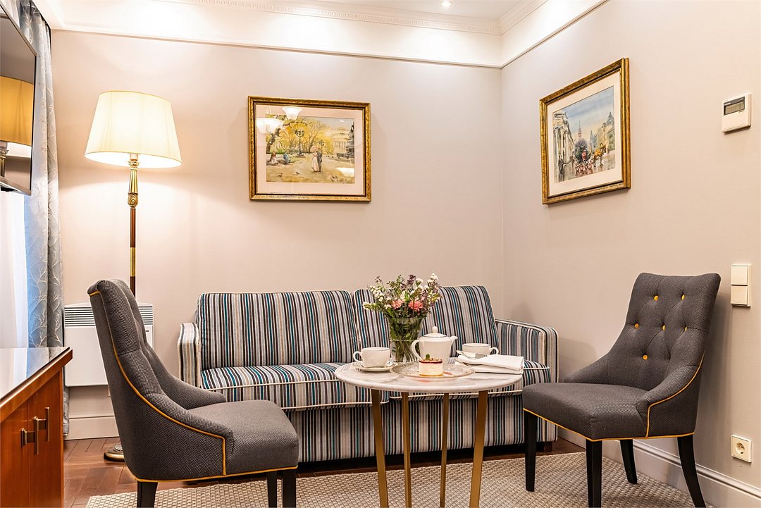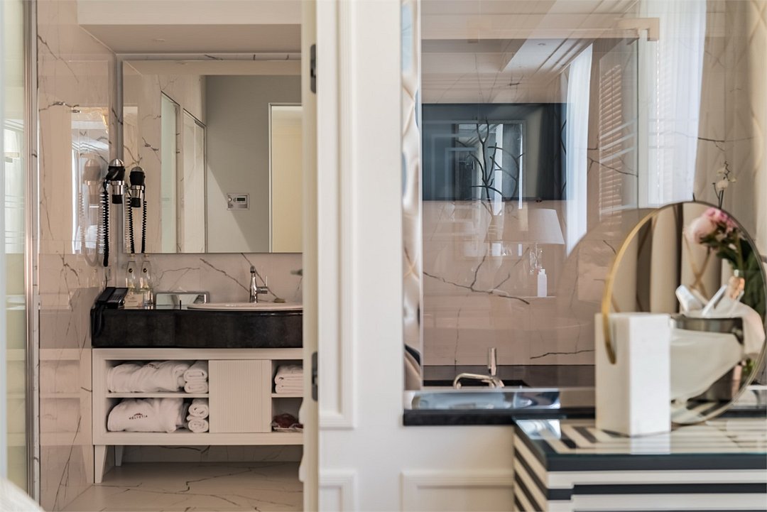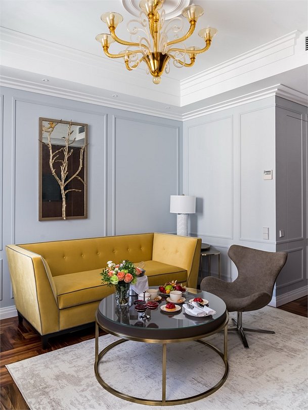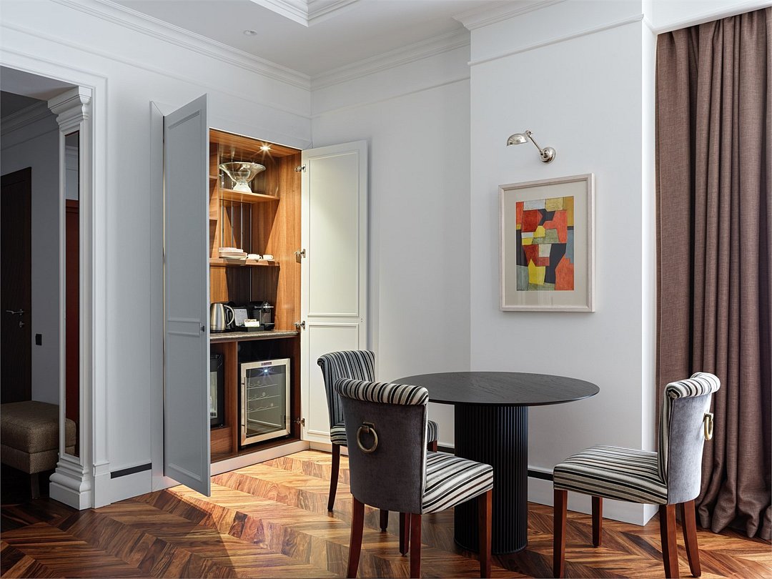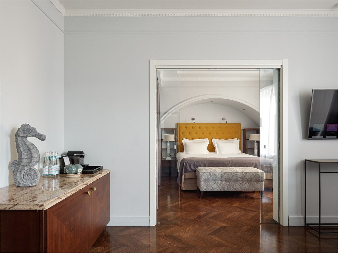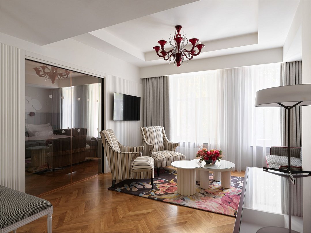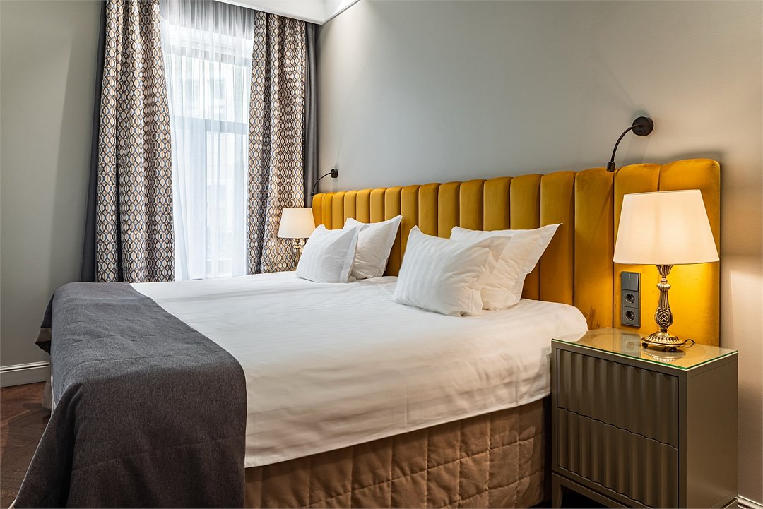 В отеле 4 номера данной категории. Площадь номера 40 кв.м. Номера выдержаны в классическом стиле с элементами современного дизайна, элегантно декорированы и предлагают прекрасные условия размещения. Роскошные люстры из муранского стекла — одна из ярких и индивидуальных деталей интерьера. Номер состоит из гостиной и спальной комнат, разделенных раздвижной стеклянной дверью. В гостиной — диван для отдыха с дополнительным спальным местом, а также уютная кухонная зона с набором необходимой посуды (есть номер без кухонной зоны) Каждый номер оснащён удобным рабочим столом и креслами. Ванная комната — с отделкой из натурального камня. Линейка косметических средств представлена маркой L’OCCITANE. Номера этой категории могут быть объединены с номером Классической категории. В номере возможна полная синхронизация телевизора с гаджетами (Android и IOS). Гостям предлагается завтрак шведский стол в ресторане Мариус в будние дни с 7.00 до 10.30, в выходные с 7.00 до 11.00. Все номера в отеле для некурящих.Услуги и удобства