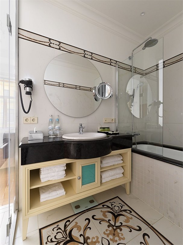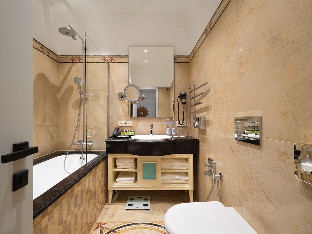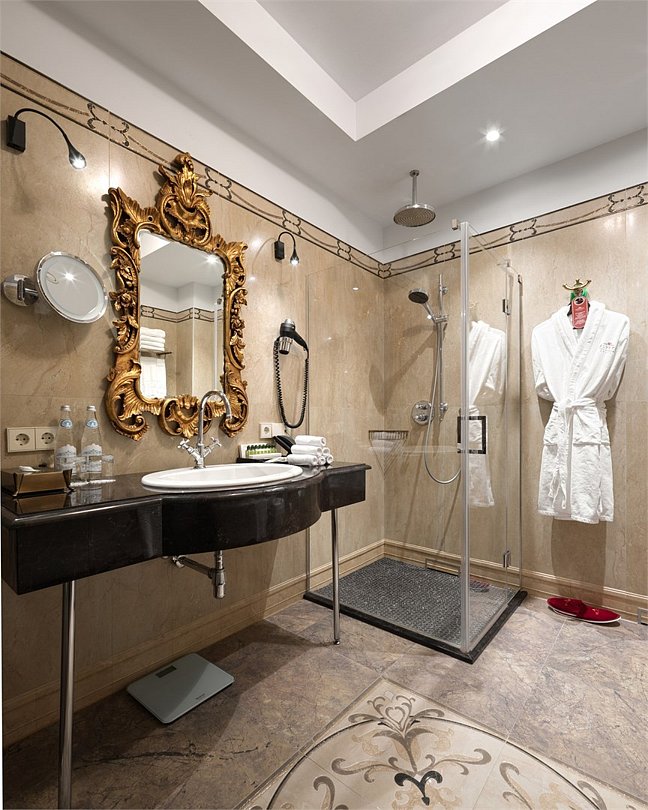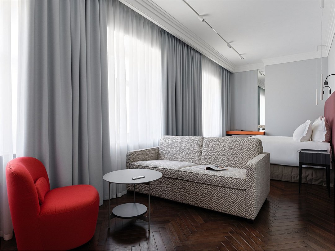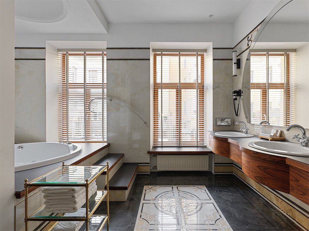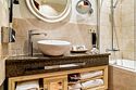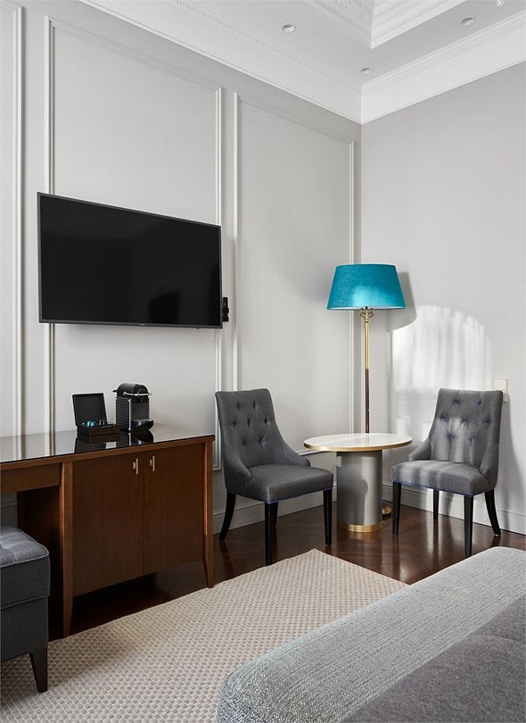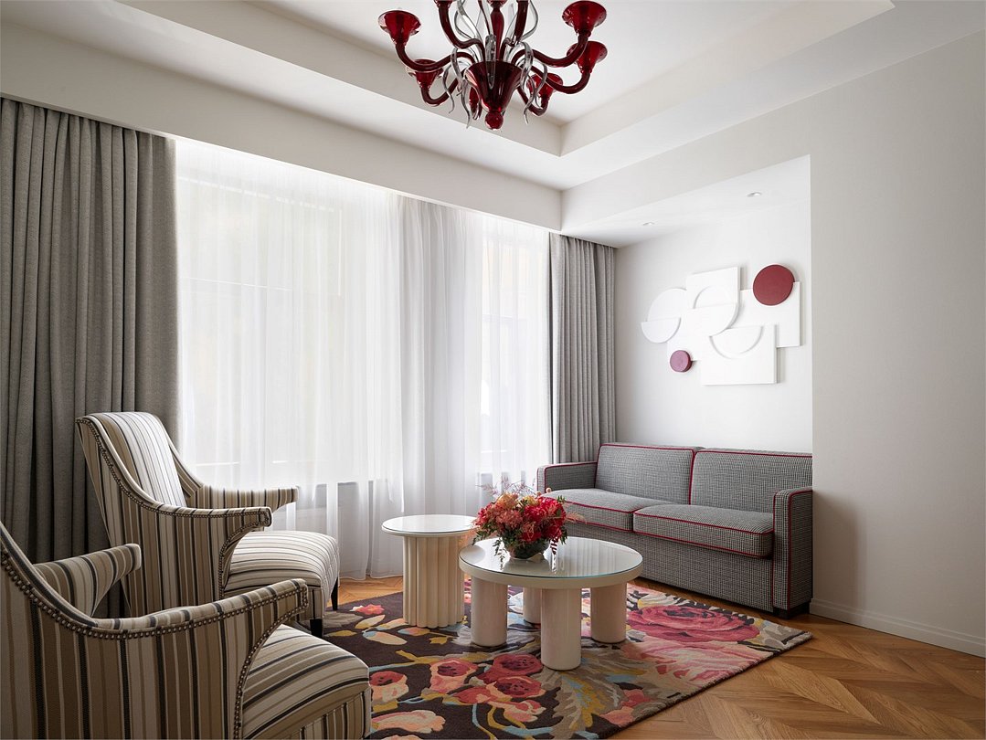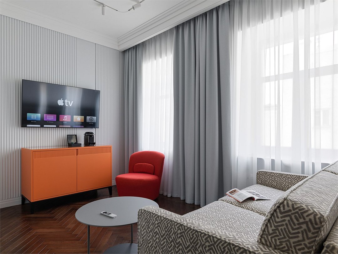 В отеле 4 номера данной категории. Площадь номера 40 кв.м. Номера выдержаны в классическом стиле с элементами современного дизайна, элегантно декорированы и предлагают прекрасные условия размещения. Роскошные люстры из муранского стекла — одна из ярких и индивидуальных деталей интерьера. Номер состоит из гостиной и спальной комнат, разделенных раздвижной стеклянной дверью. В гостиной — диван для отдыха с дополнительным спальным местом, а также уютная кухонная зона с набором необходимой посуды (есть номер без кухонной зоны) Каждый номер оснащён удобным рабочим столом и креслами. Ванная комната — с отделкой из натурального камня. Линейка косметических средств представлена маркой L’OCCITANE. Номера этой категории могут быть объединены с номером Классической категории. В номере возможна полная синхронизация телевизора с гаджетами (Android и IOS). Гостям предлагается завтрак шведский стол в ресторане Мариус в будние дни с 7.00 до 10.30, в выходные с 7.00 до 11.00. Все номера в отеле для некурящих.Услуги и удобства