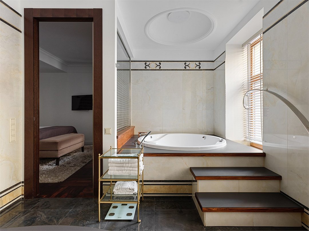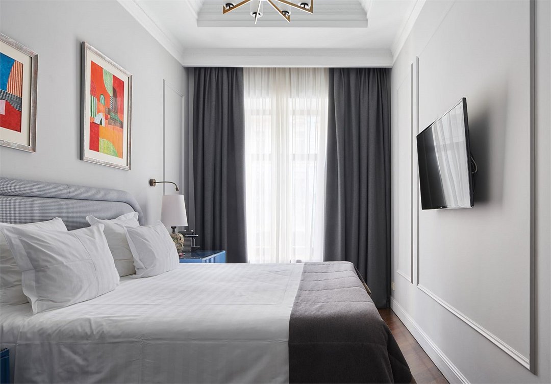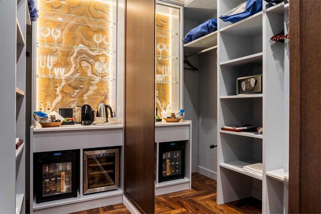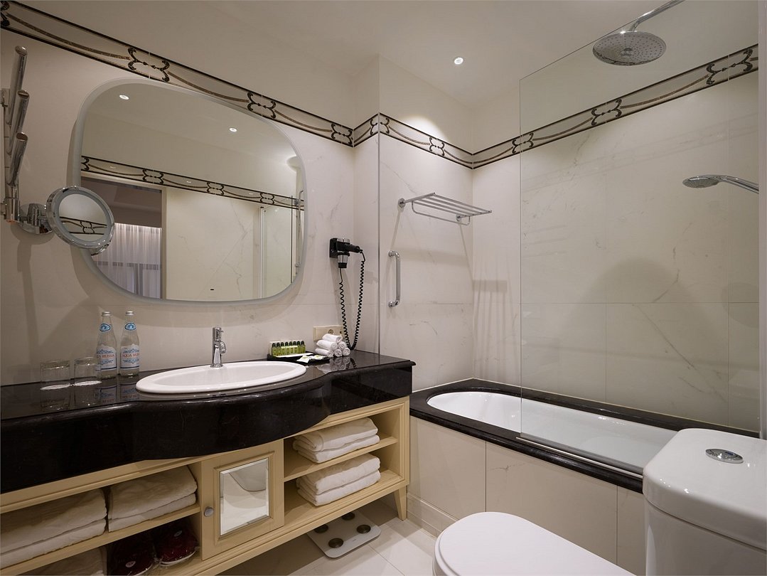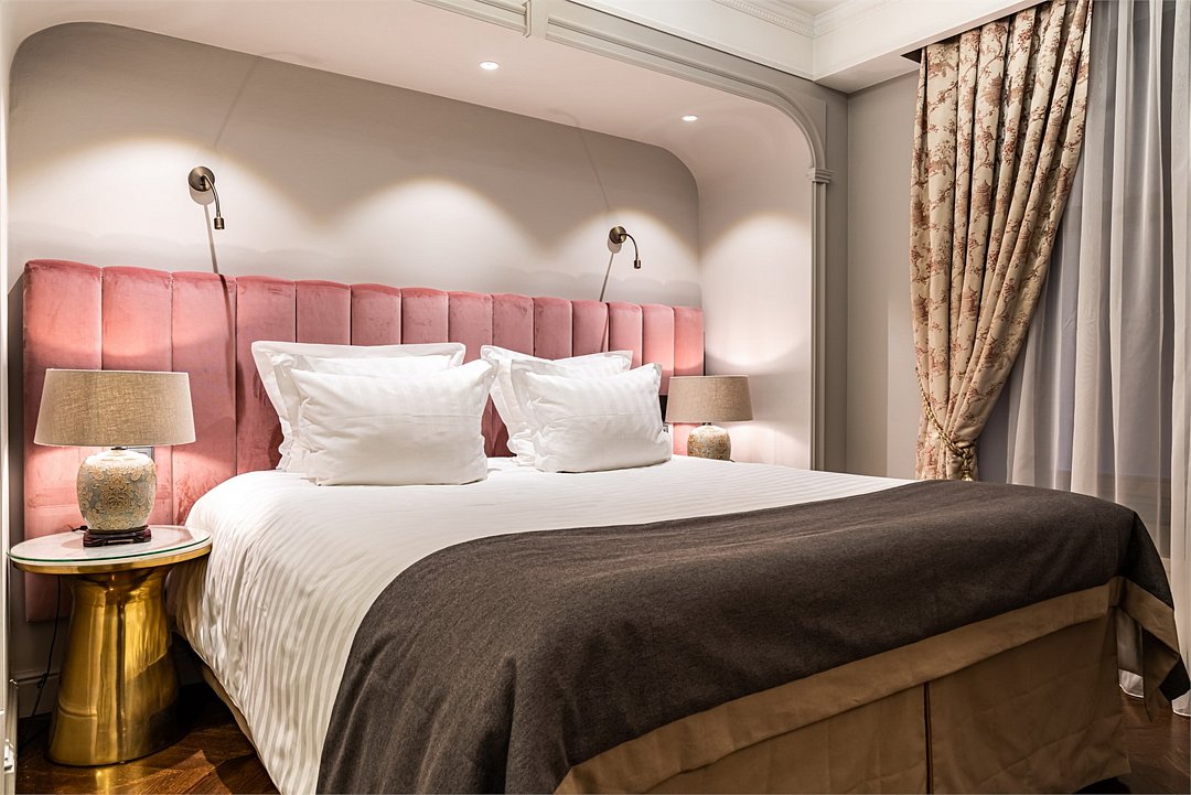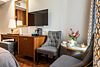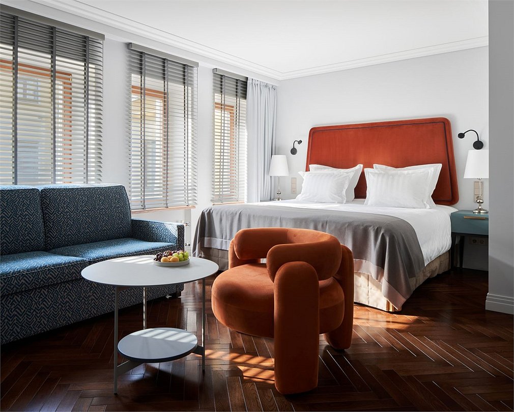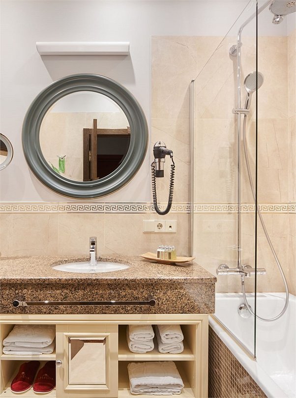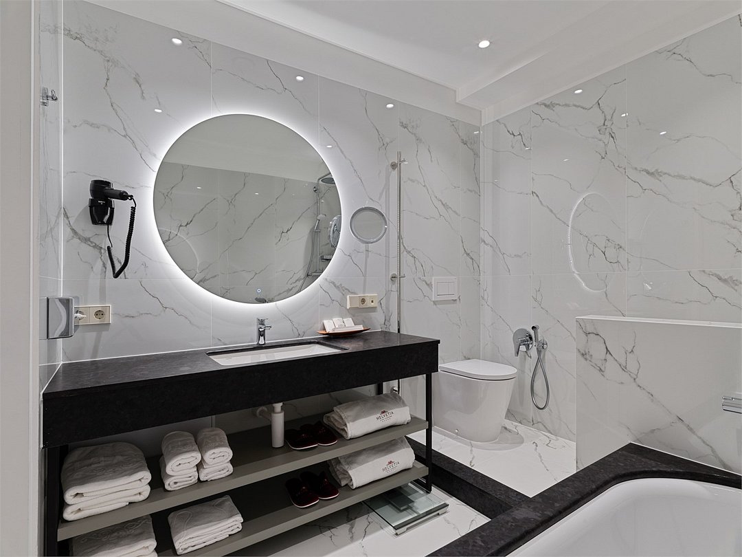 В отеле 4 номера данной категории. Площадь номера 40 кв.м. Номера выдержаны в классическом стиле с элементами современного дизайна, элегантно декорированы и предлагают прекрасные условия размещения. Роскошные люстры из муранского стекла — одна из ярких и индивидуальных деталей интерьера. Номер состоит из гостиной и спальной комнат, разделенных раздвижной стеклянной дверью. В гостиной — диван для отдыха с дополнительным спальным местом, а также уютная кухонная зона с набором необходимой посуды (есть номер без кухонной зоны) Каждый номер оснащён удобным рабочим столом и креслами. Ванная комната — с отделкой из натурального камня. Линейка косметических средств представлена маркой L’OCCITANE. Номера этой категории могут быть объединены с номером Классической категории. В номере возможна полная синхронизация телевизора с гаджетами (Android и IOS). Гостям предлагается завтрак шведский стол в ресторане Мариус в будние дни с 7.00 до 10.30, в выходные с 7.00 до 11.00. Все номера в отеле для некурящих.Услуги и удобства