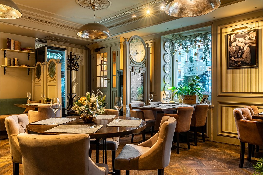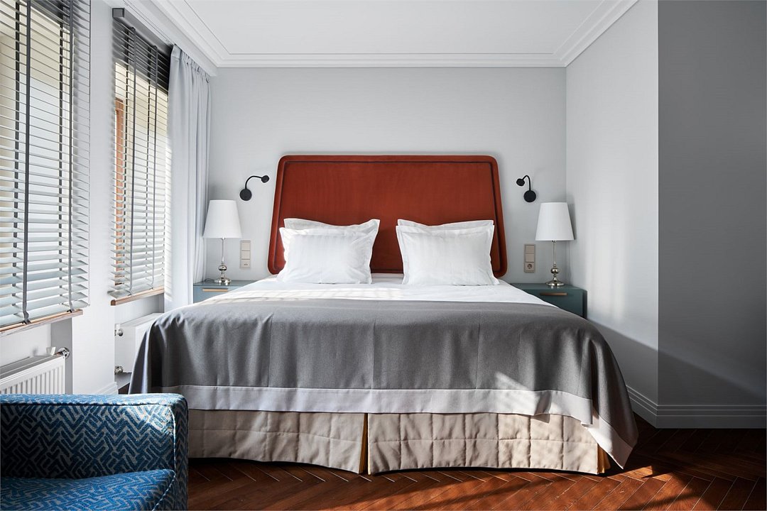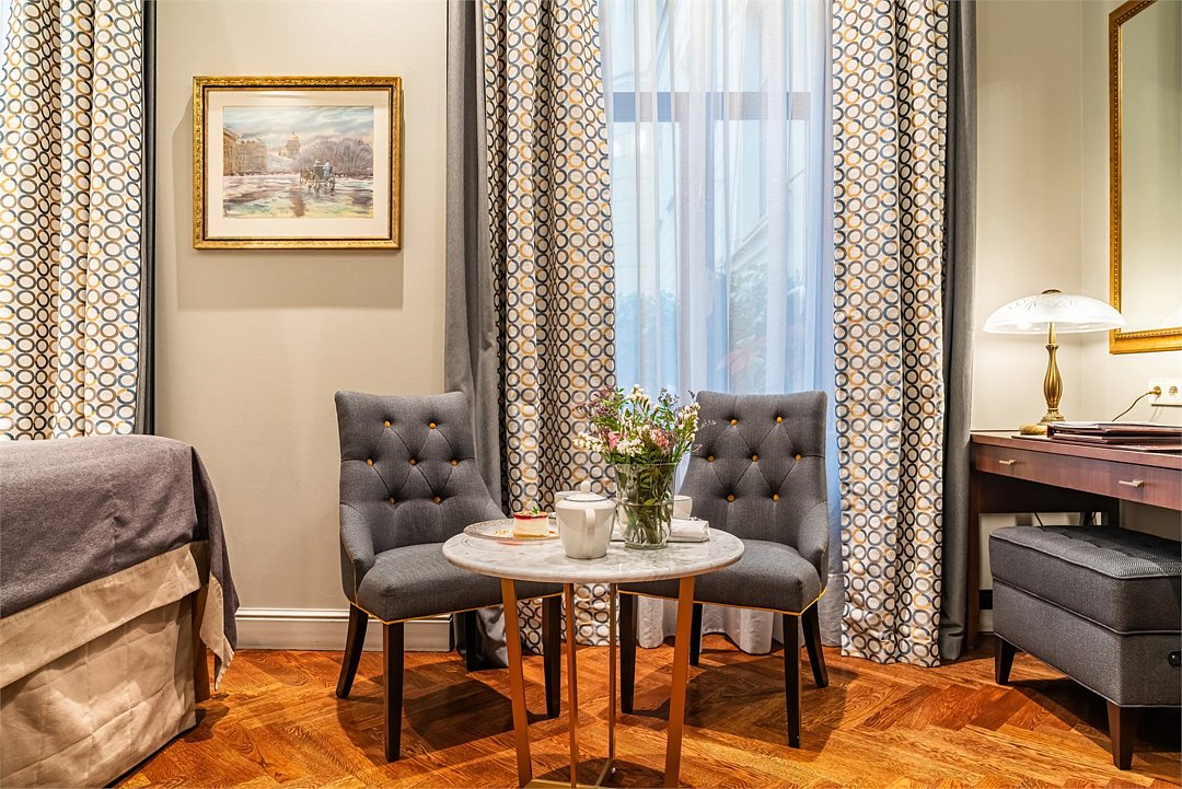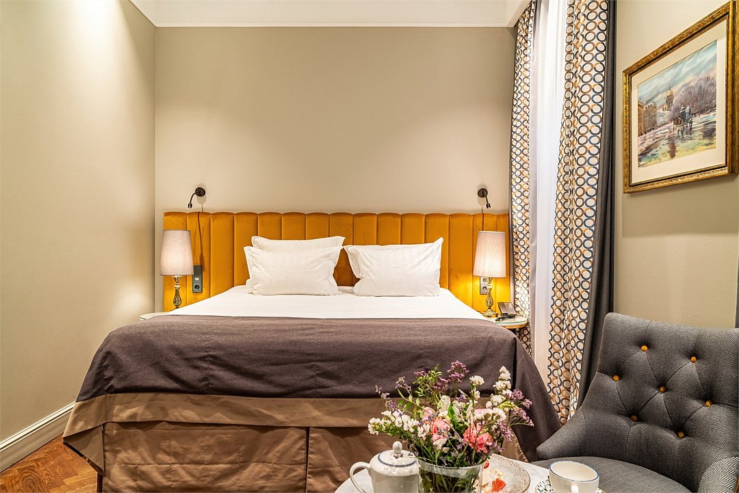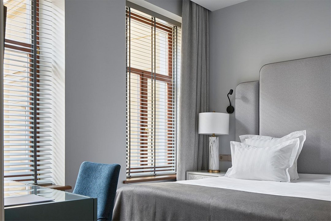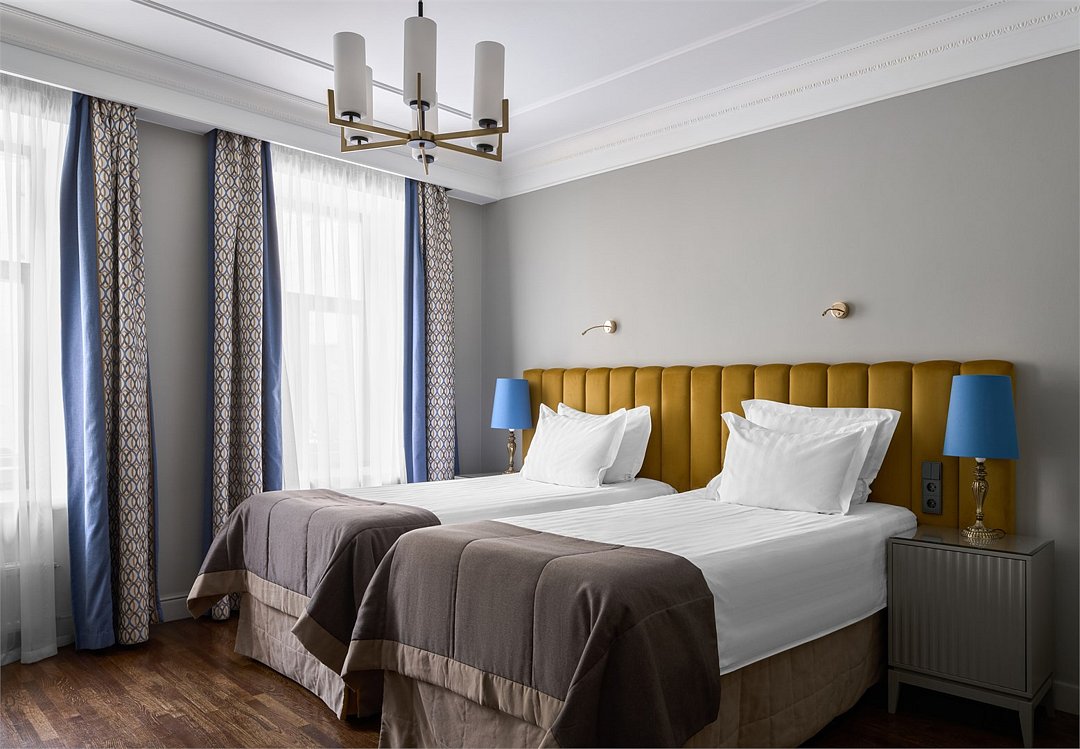 Площадь номеров - 18-21 м2. Окна, выходящие на улицу Марата или в тихий внутренний дворик, создают домашнюю, уютную атмосферу. В номере имеется всё необходимое для комфортного отдыха - гостям предоставляются наборы полотенец, махровые халаты и одноразовые тапочки, фен, набор косметических принадлежностей. Во всех номерах паркетный пол. Во всех Классических номерах одна большая кровать, в данной категории нет возможности предоставить размещение на двух раздельных кроватях. Гостям предлагается завтрак шведский стол в ресторане Marius и Claret Cafe в будние дни с 7.00 до 10.30, в выходные с 7.00 до 11.00. Все номера в отеле для некурящих.Услуги и удобства