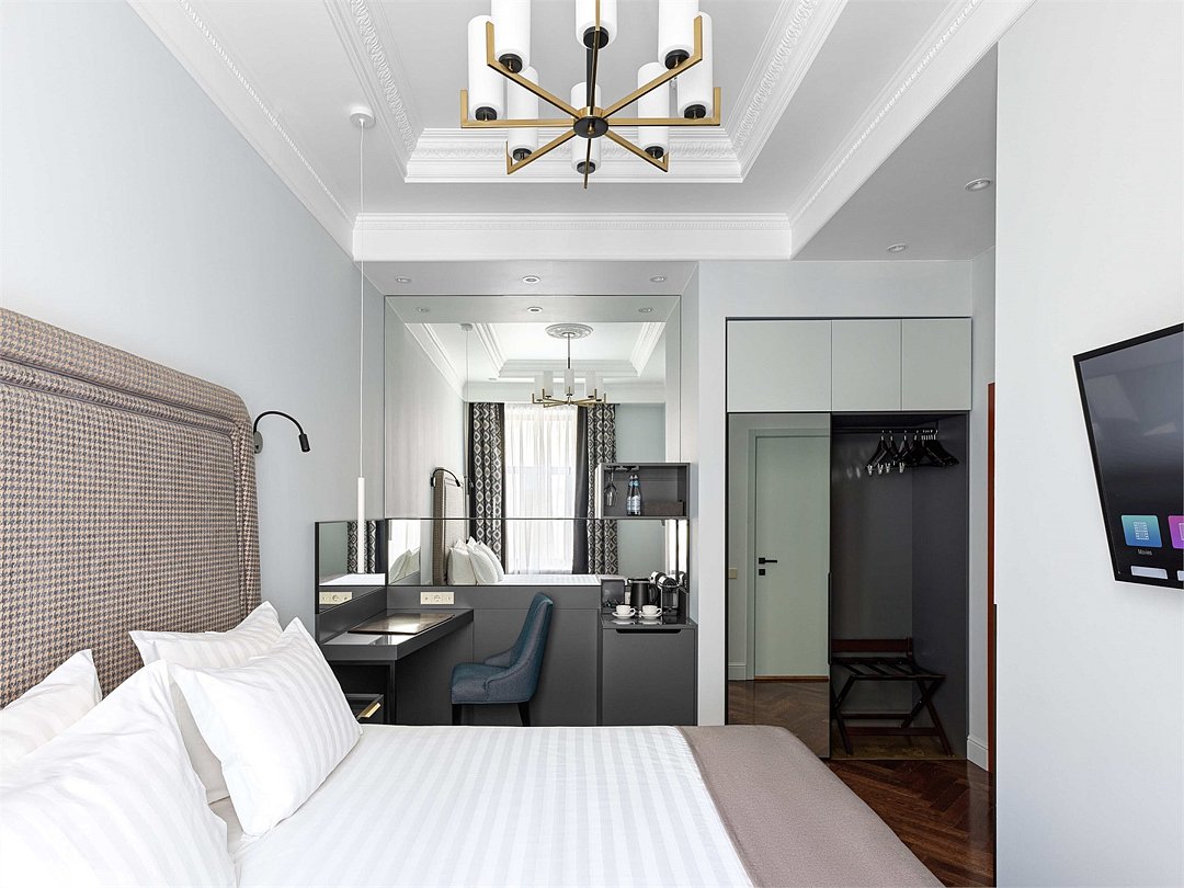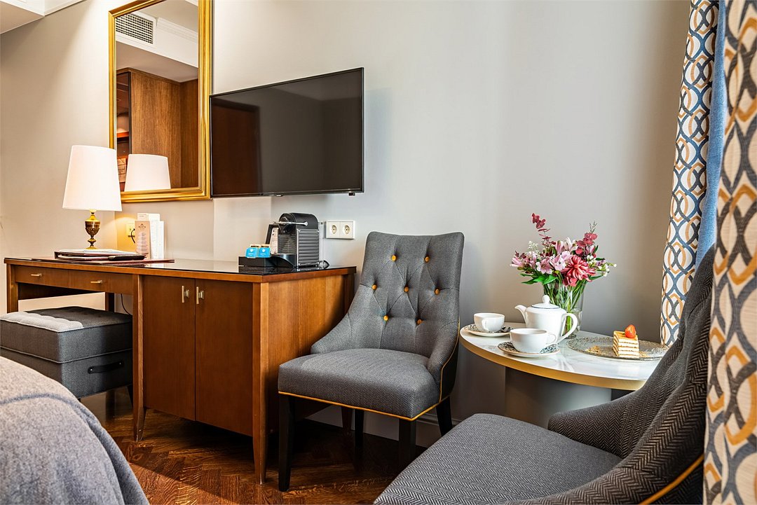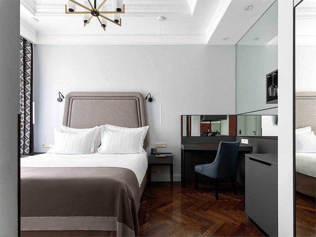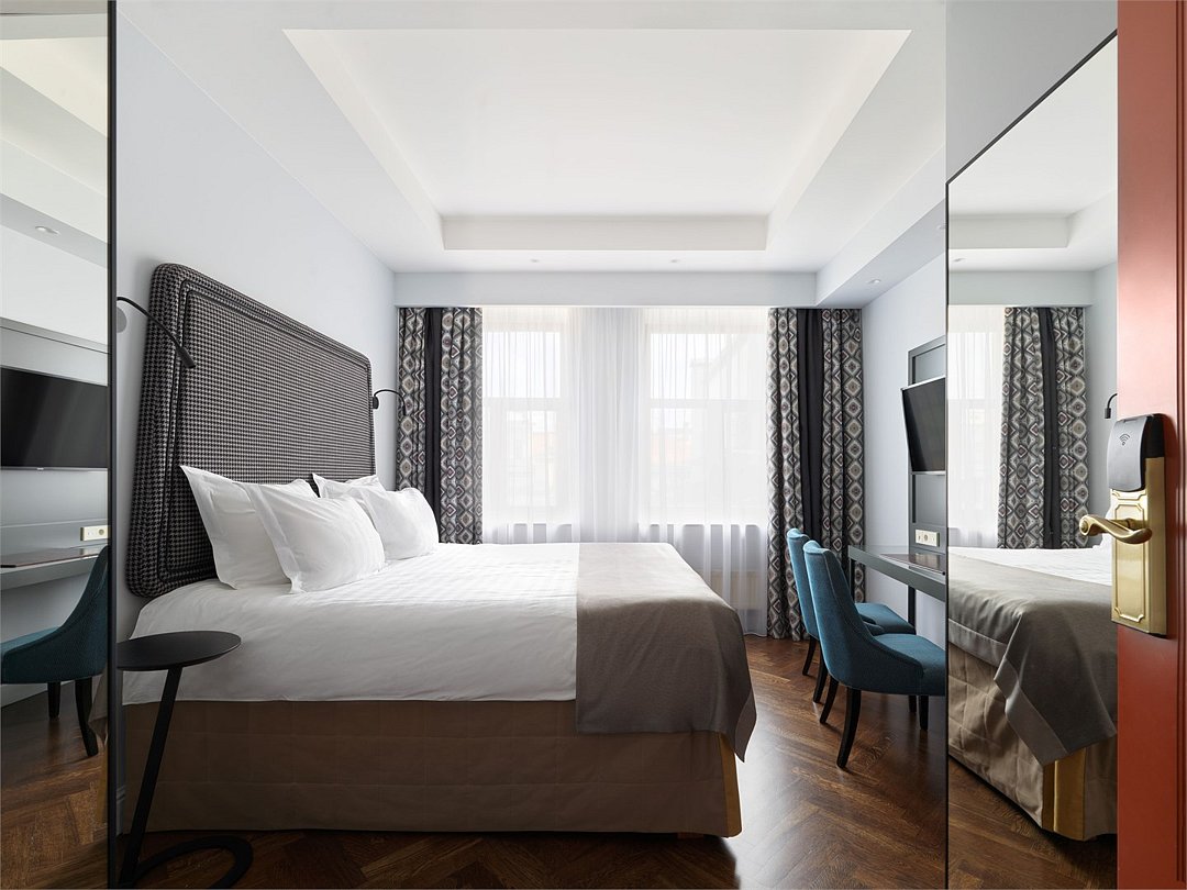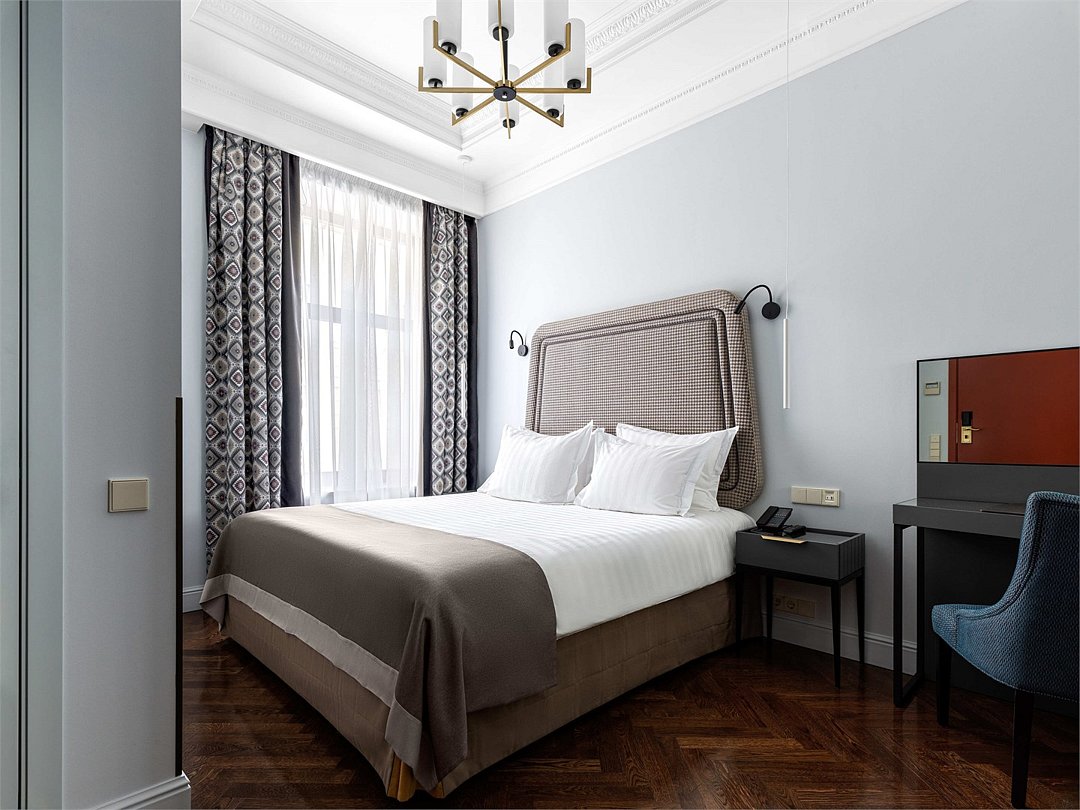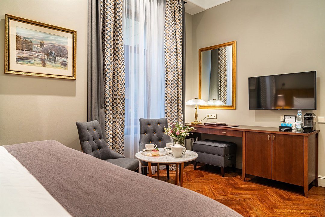Площадь номера 22-24 кв.м. Просторные и элегантные номера, выполненные в классическом стиле с элементами барокко с одной большой или двумя раздельными кроватями. Номер оснащен удобным рабочим столом. Установлена кофемашина. В данной категории есть возможность предоставить две раздельные кровати. Один из номеров в данной категории с мансардным окном и диваном. Все номера в отеле для некурящих.Услуги и удобства