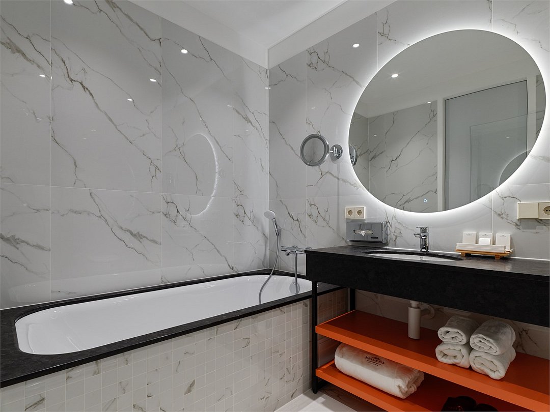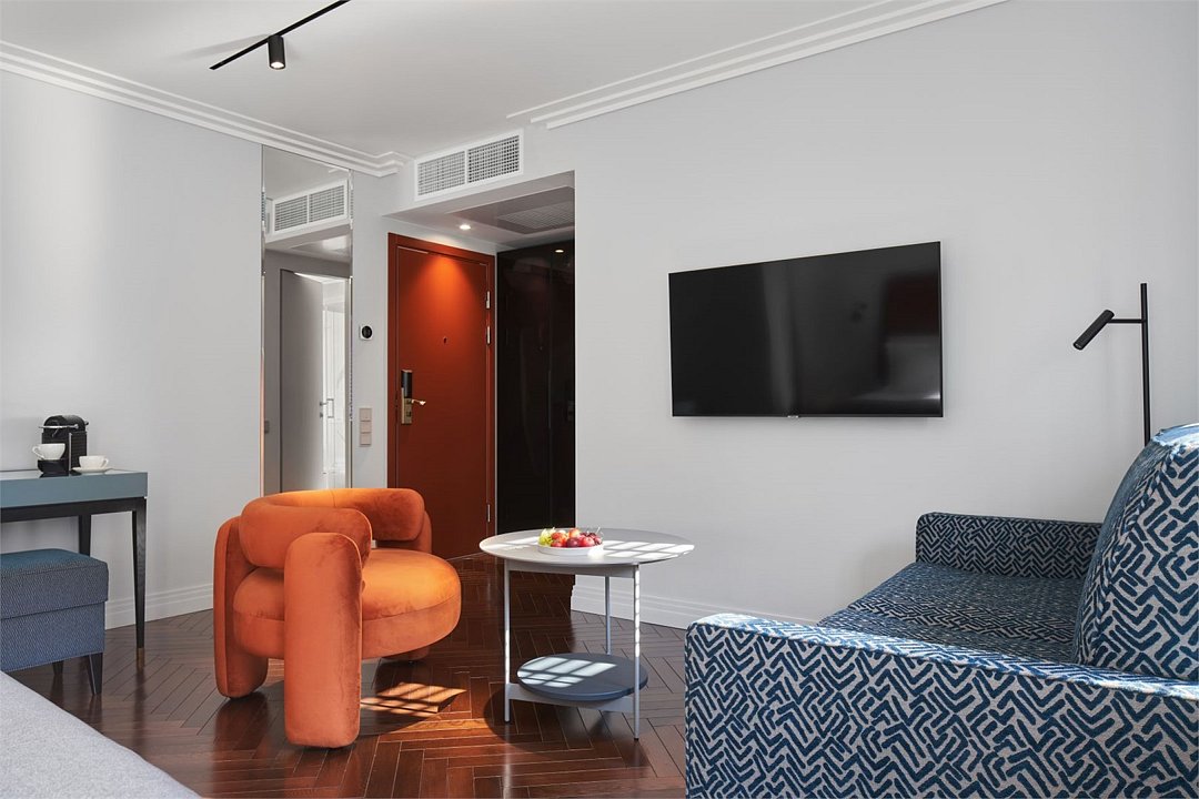 Полулюкс - просторный номер площадью около 31 кв.м. Грамотно организованное пространство включает в себя спальную зону для отдыха и гостиную. Роскошная большая кровать и набор подушек сделают сон крепким, а отдых комфортным. К услугам гостей кондиционер, телевизор с плоским экраном, рабочая зона с удобным письменным столом, гостиный уголок с диваном и креслами и дизайнерским столиком. Туалетно-косметические принадлежностями представлены натуральной французской косметикой L'OCCITANE. Все номера данной категории оборудованы кофемашиной Nespresso и чайной станцией. Все номера выполнены в неповторимом дизайне, отличаются от друг друга по стилю и цветовому оформлению. В номере возможна полная синхронизация телевизора с гаджетами (Android и IOS).Услуги и удобства
