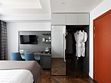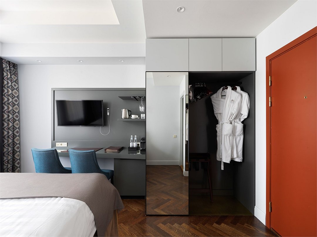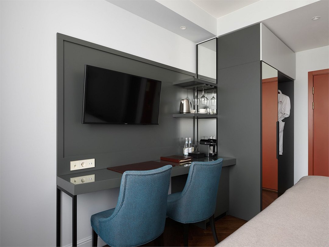 телевизор, кабельное телевидение, Wi-Fi, телефон, кондиционер, фен, кофемашина, ванна, халаты, банные полотенца, тапочки, косметические средства, двуспальная кровать, шкаф для одежды, вешалки, письменный стол, зеркало, чайный набор, сейф, чайник, вид на город, вид во двор, стул, можно с питомцамиВ номере