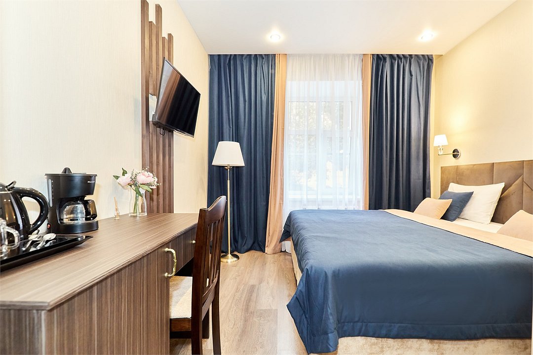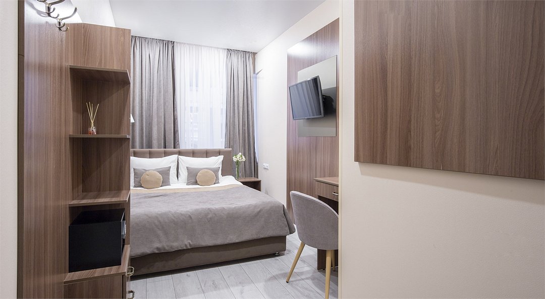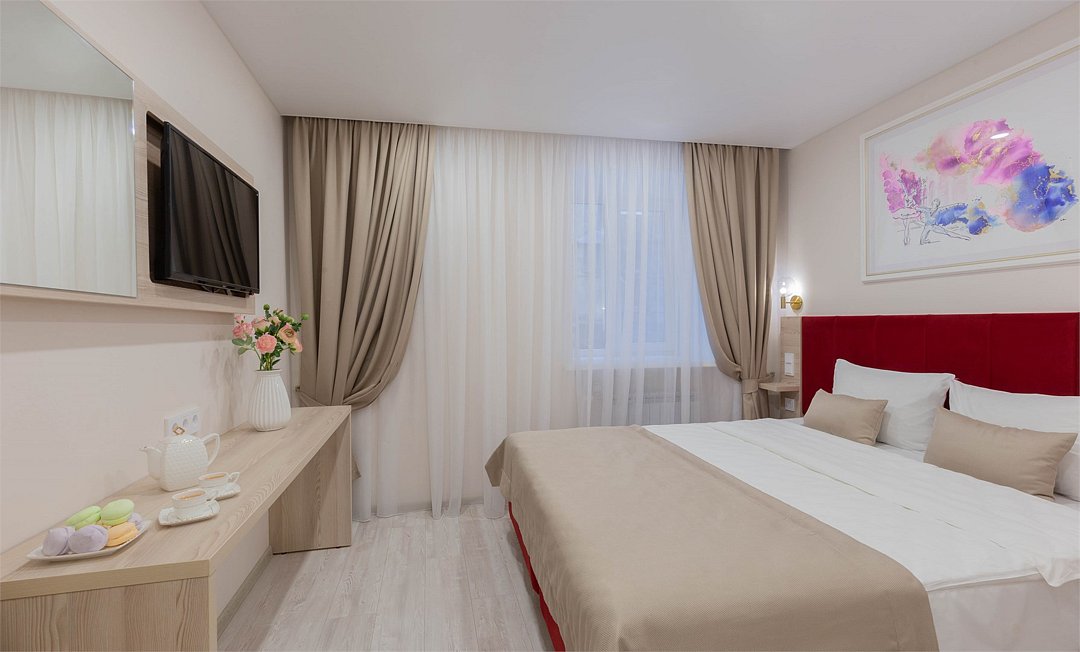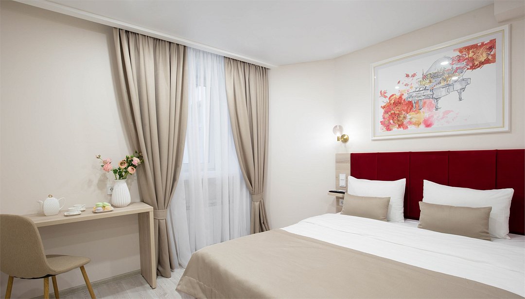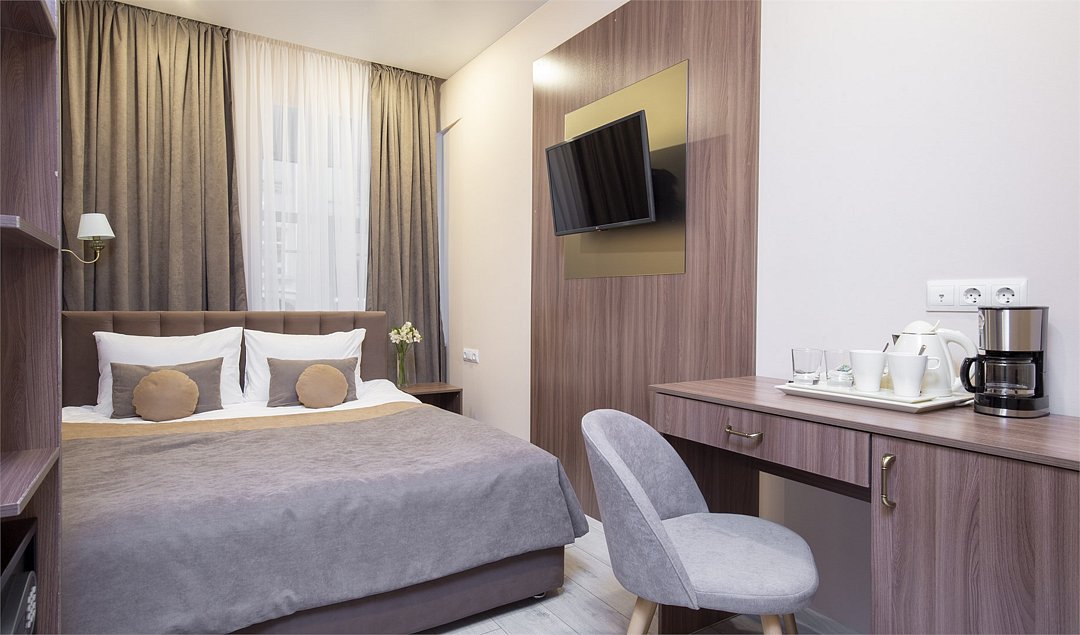 Двухместный комфортный номер с одной большой кроватью. В номере есть все самое необходимое для комфортного проживания: - собственная ванная комната с душевой; - косметические принадлежности; - индивидуальное кондиционирование; - чайная станция; - ТВ; - бесплатный WiFi; -шкаф для хранения вещей;Услуги и удобства