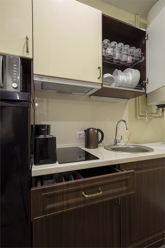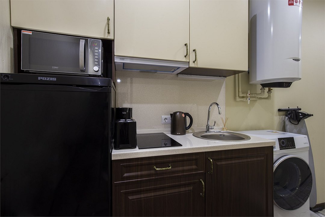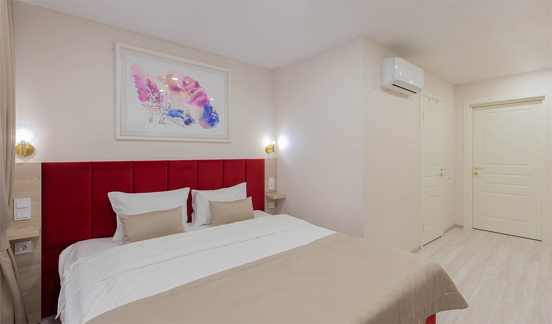 Двухместные комфортные апартаменты с одной большой кроватью. В апартаментах есть все самое необходимое для комфортного проживания: - собственная ванная комната с душевой; - косметические принадлежности; - индивидуальное кондиционирование; - чайная станция; - ТВ; - бесплатный WiFi; -холодильник; -шкаф для хранения вещей; -в общей зоне имеется кухня, оборудованная всем самым необходимым.Услуги и удобства