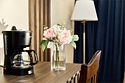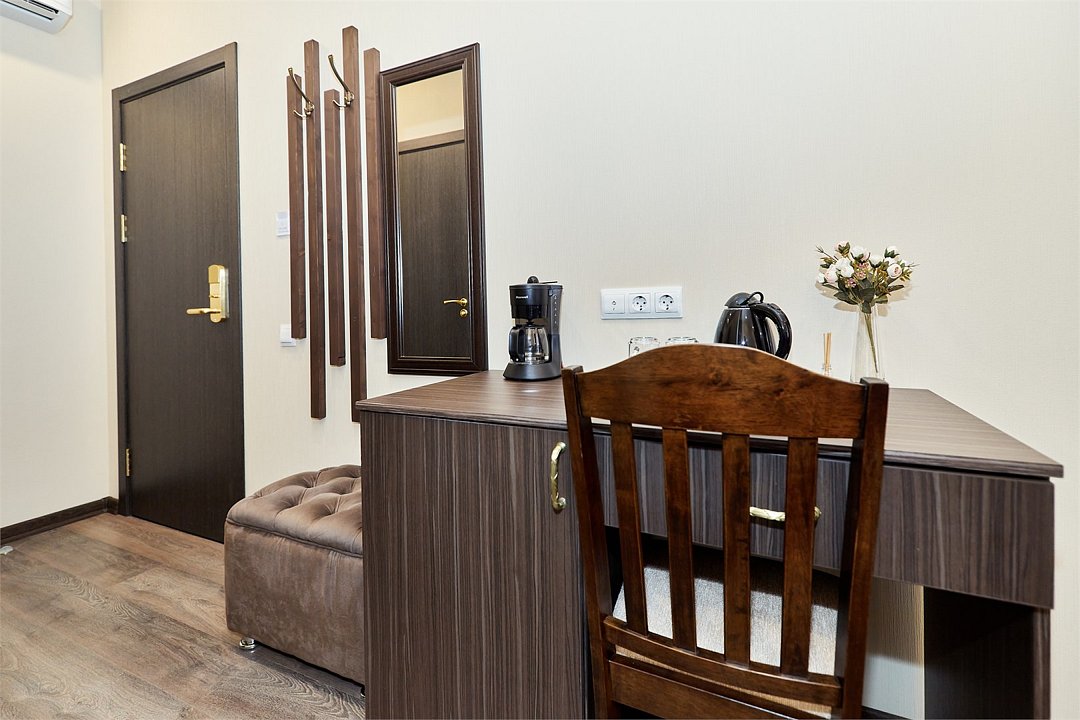 телевизор, кабельное телевидение, Wi-Fi, кондиционер, система климат-контроля, светильник, фен, система безопасности, кофемашина, утюг, санузел, банные принадлежности, банные полотенца, гигиенические средства, косметические средства, односпальная кровать, гладильная доска, тумбы, гардеробная, вешалки, зеркало, звуконепроницаемые стены и окна, чайный набор, набор посуды, чайник, раковина, питьевая вода, обеденная зона, отопление, душ, кулер на этаже, вид во двор, ламинат, стаканы, туалетный столик, стул, туалетный столик, туалетные средства, туалет, цифровое тв, москитная сетка, теплые полы, номер для некурящих, пуфик, можно с питомцамиВ номере