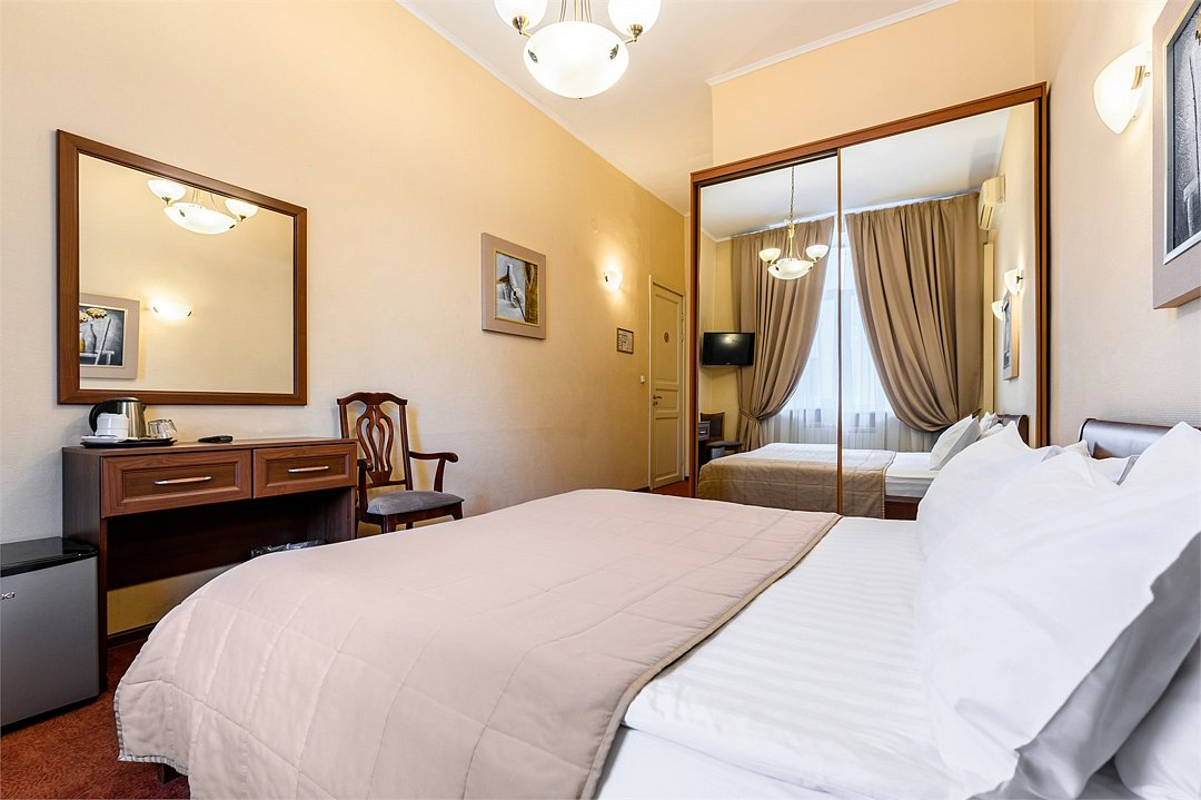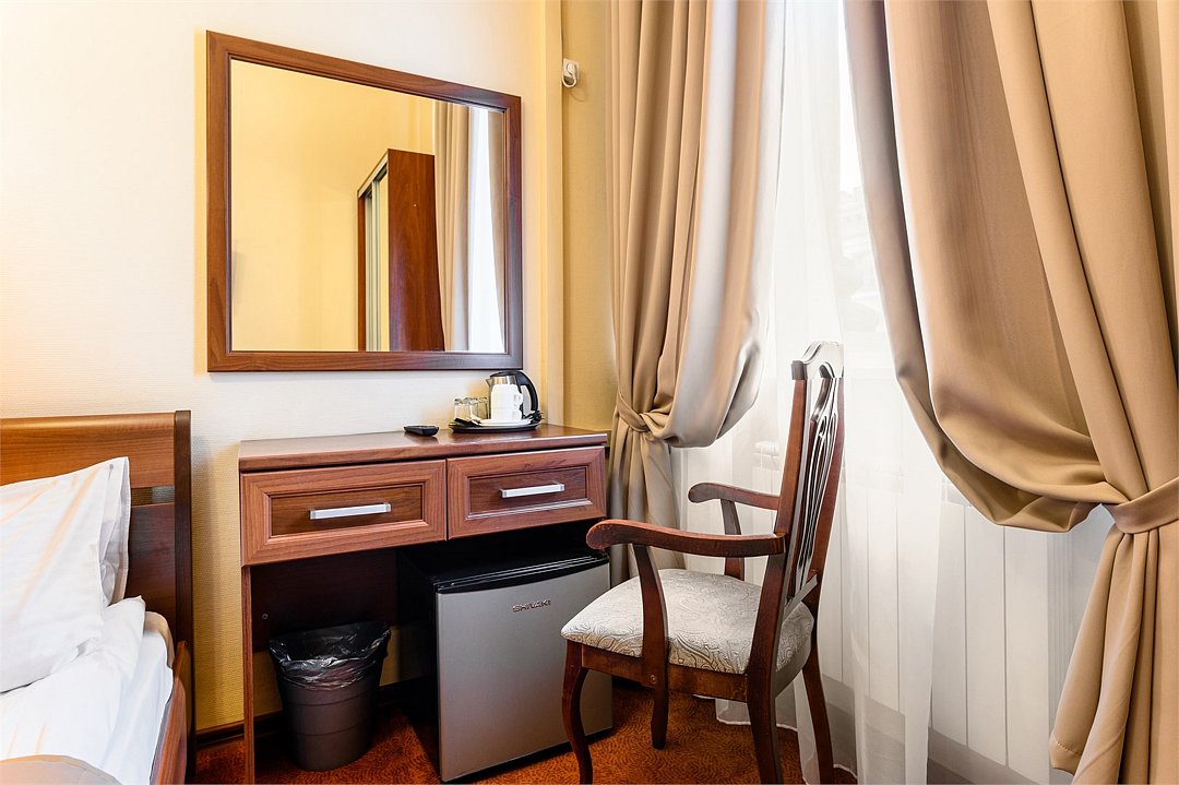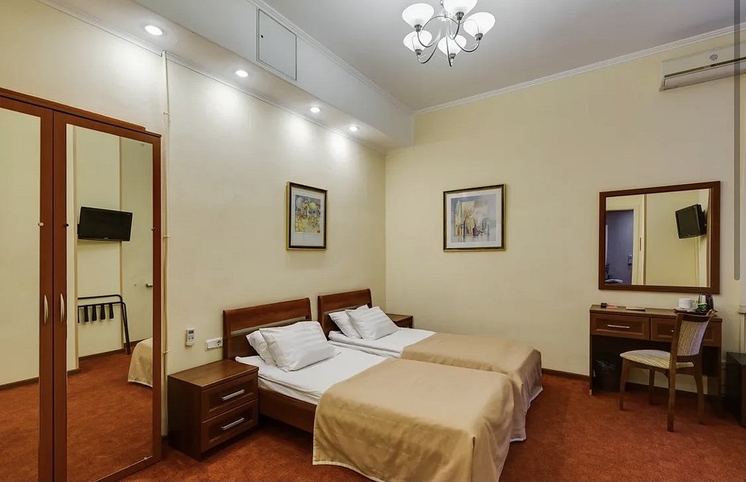 телевизор, кабельное телевидение, Wi-Fi, светильник, фен, вентилятор, душевая кабина, санузел, банные принадлежности, банные полотенца, тапочки, две односпальные кровати, тумбы, вешалки, зеркало, чайный набор, набор посуды, сейф, чайник, раковина, ковровое покрытие, отопление, вид на город, кулер на этаже, вид во двор, высокие потолки, стаканы, стул, туалетные средства, телевизор с плоским экраном, мини-холодильник, шкаф-купе, гостиничная парфюмерия, номер для некурящих, рабочий стол, гигиенический душ, можно с питомцамиВ гостиничном номере