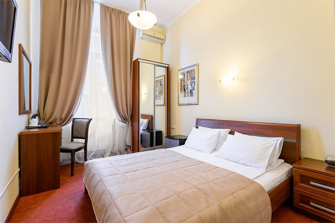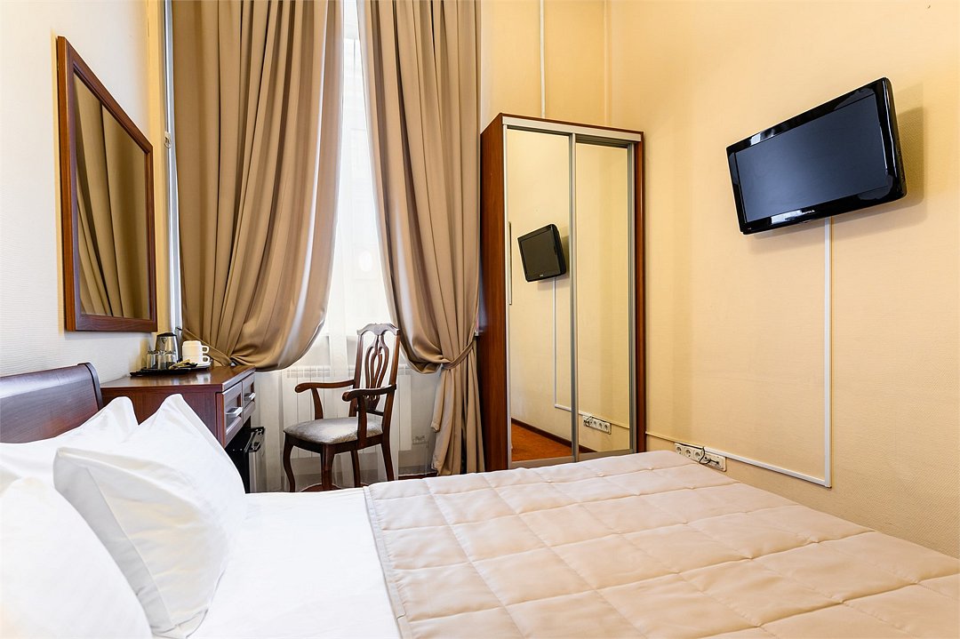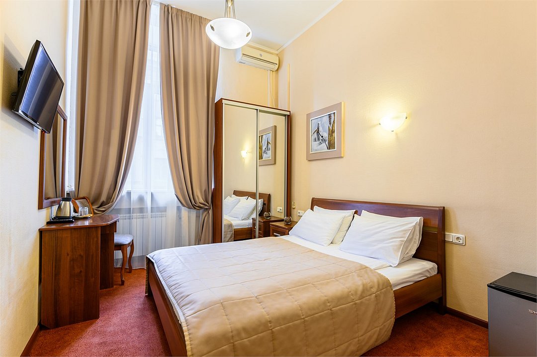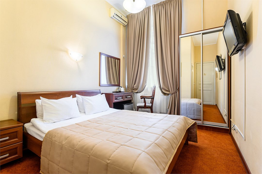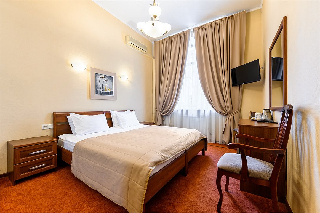 телевизор, кабельное телевидение, Wi-Fi, кондиционер, светильник, фен, душевая кабина, санузел, банные принадлежности, банные полотенца, тапочки, двуспальная кровать, тумбы, стулья, вешалки, зеркало, чайный набор, набор посуды, сейф, чайник, раковина, ковровое покрытие, отопление, вид на город, кулер на этаже, вид во двор, высокие потолки, стаканы, стул, телевизор с плоским экраном, мини-холодильник, шкаф-купе, гостиничная парфюмерия, номер для некурящих, рабочий стол, можно с питомцамиВ гостиничном номере
