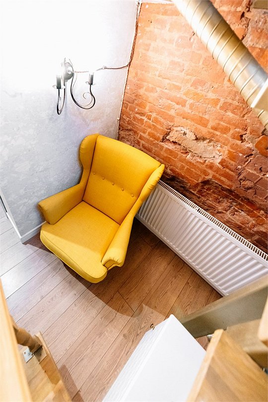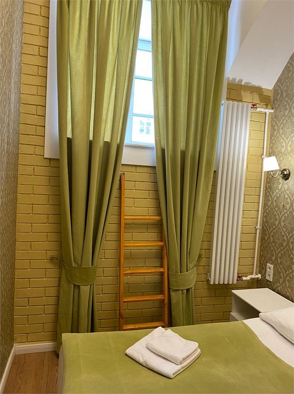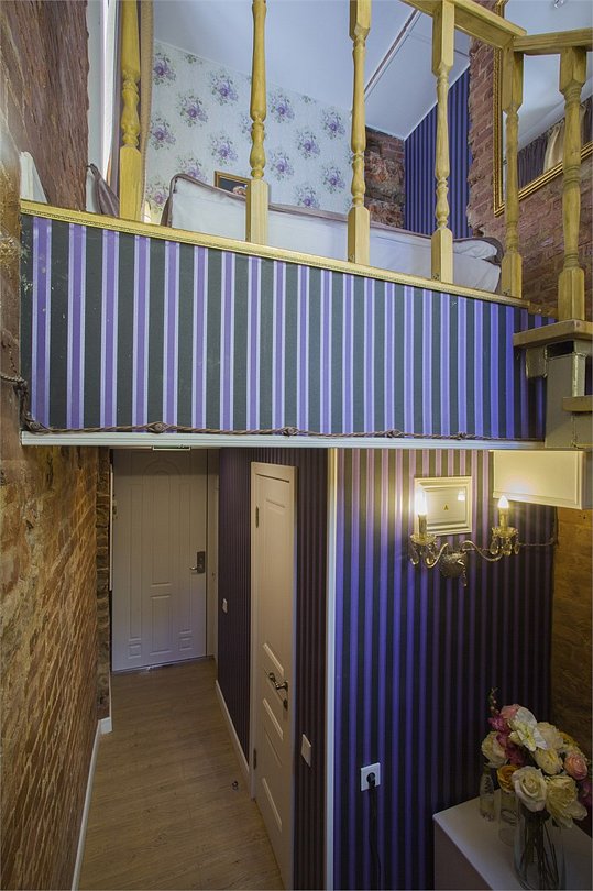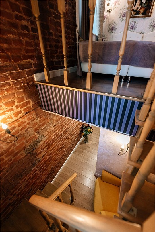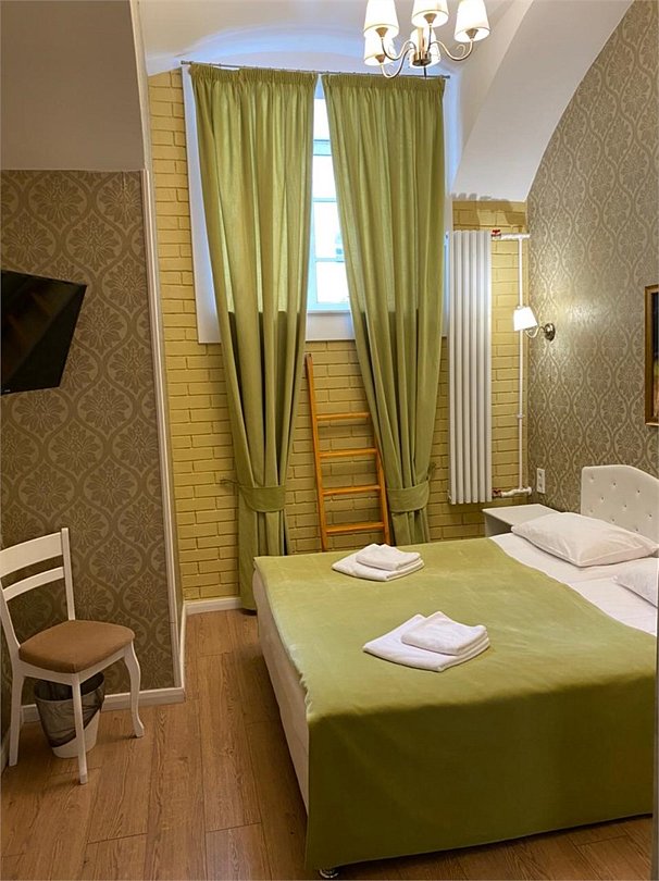 Двухуровневый номер с отдельным входом. Подходит для тех, кто любит уединение, независимость и тишину. В этом номере вам точно никто не помешает отдохнуть после тяжелого дня. На втором уровне номера имеется двуспальная кровать, на первом уровне находится сан. узел с душем, холодильник, чайная станция и кресло для отдыха. Из окна номера открывается вид на Базилику Св. Екатерины Александрийской.Услуги и удобства