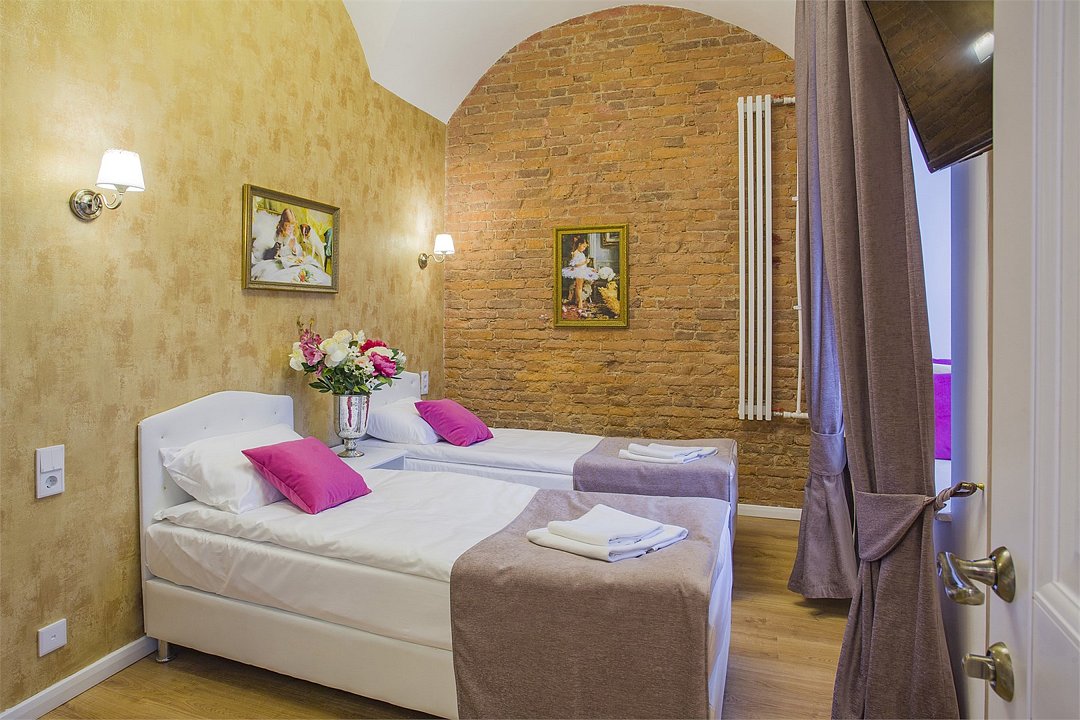 Небольшие уютные номера имеют несколько дизайнерских решений, стены украшены репродукциями картин. В номере имеется удобная двуспальная кровать или две односпальные кровати, телевизор с плоским экраном и цифровым вещанием, мини-холодильник. Ванная комната оборудована душем и туалетом. На заезде для гостей приготовлены две бутылочки питьевой воды, тапочки. Халаты, бритвенные и зубные наборы выдаются бесплатно по запросу. Окна всех номеров выходят на тихий дворик, часть из номеров имеет вид на Базилику Св. Екатерины Александрийской. Данные номера рекомендуем использовать под одноместное размещение.Услуги и удобства