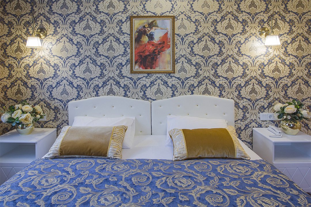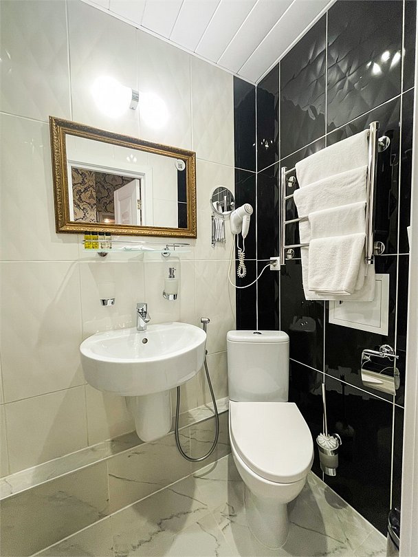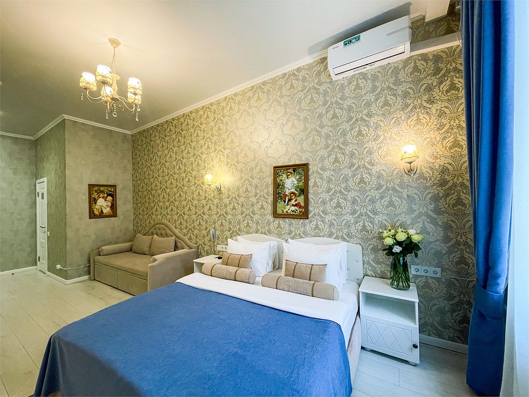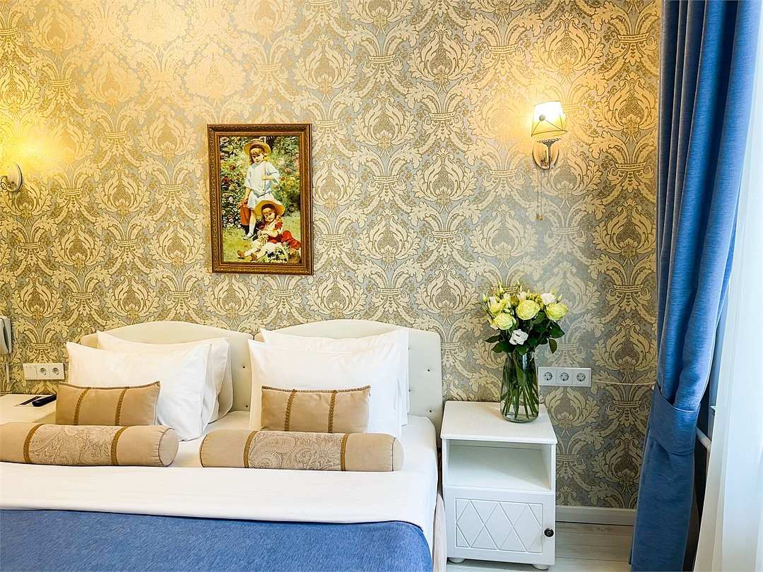 Изысканные номера имеют несколько дизайнерских решений, в оформлении номеров использованы эксклюзивные итальянские обои из лимитированной коллекции. В номере может разместиться до 4-х человек. Во всех номерах есть одна двуспальная или две односпальные кровати. В некоторых номерах дополнительно установлены раскладывающиеся диваны. Идеально подходит под семейное размещение. Площадь номера достаточна для того, чтобы не нарушать личное пространство друг друга. Удобные кровати позволят отлично отдохнуть после насыщенного дня. Все номера для некурящих, оснащены сан. узлом с душем, феном. Во всех комнатах есть телевизор, мини-холодильник, чайная станция, кондиционер Wi-Fi. Гостям предоставляются наборы полотенец, махровые халаты, одноразовые тапочки, фен, индивидуальные косметические принадлежности, две бутылочки питьевой воды. Бритвенные и зубные наборы выдаются бесплатно по запросу.Услуги и удобства