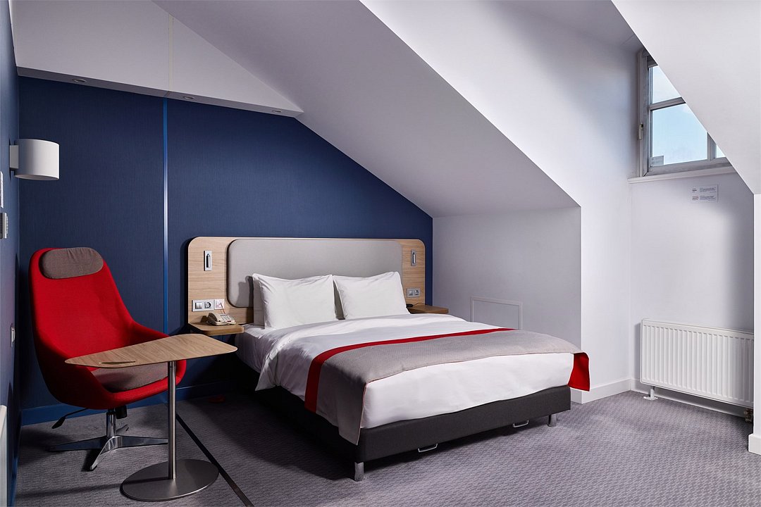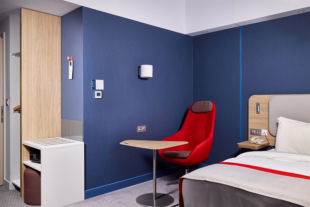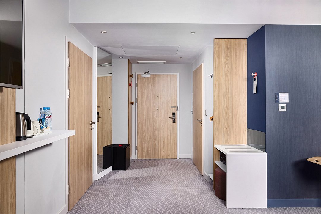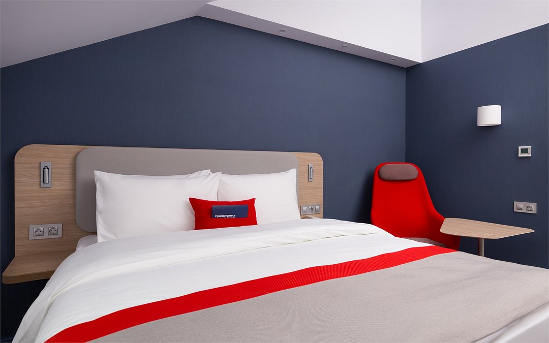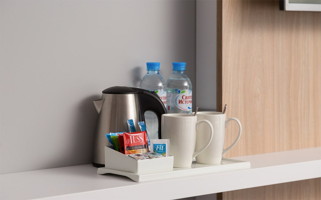 Wi-Fi, телефон, фен, электронные замки, утюг, душевая кабина, банные полотенца, двуспальная кровать, гладильная доска, вешалки, журнальный столик, багажная тумба, зеркало, чайный набор, чайник, унитаз, раковина, питьевая вода, ковровое покрытие, отопление, душ, вид на город, кулер на этаже, кресло, вид во двор, стаканы, туалетные средства, цифровое тв, телевизор с плоским экраном, номер для некурящих, фанкойл, оснащение для гостей с ограниченными возможностями, можно с питомцамиВ номере