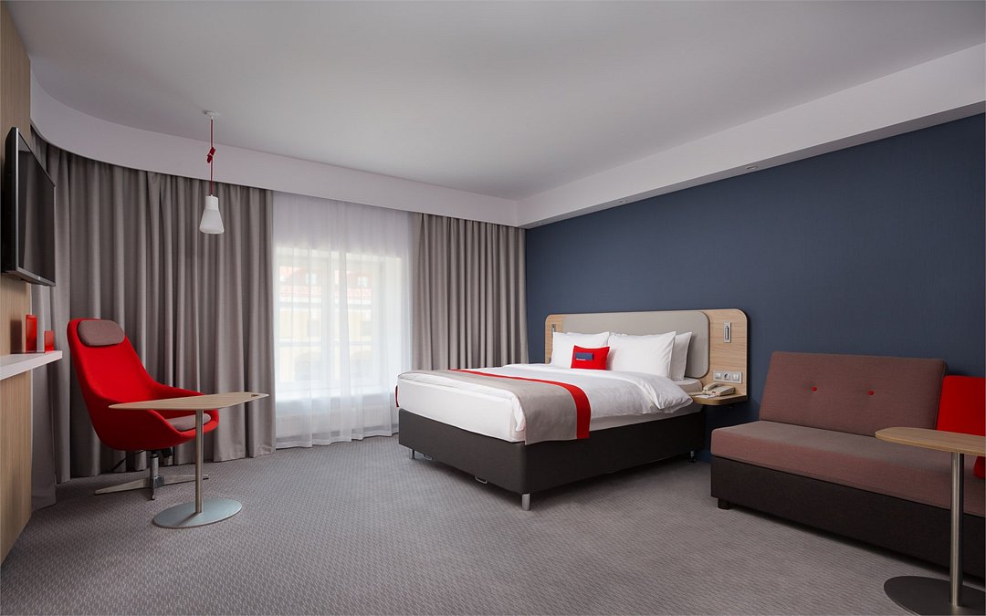 Wi-Fi, телефон, фен, электронные замки, утюг, душевая кабина, банные полотенца, косметические средства, кровать «King size», гладильная доска, вешалки, журнальный столик, багажная тумба, зеркало, чайный набор, сейф, чайник, унитаз, раковина, питьевая вода, ковровое покрытие, отопление, душ, вид на город, кулер на этаже, кресло, стаканы, вид на парк, цифровое тв, телевизор с плоским экраном, номер для некурящих, фанкойл, можно с питомцамиВ номере