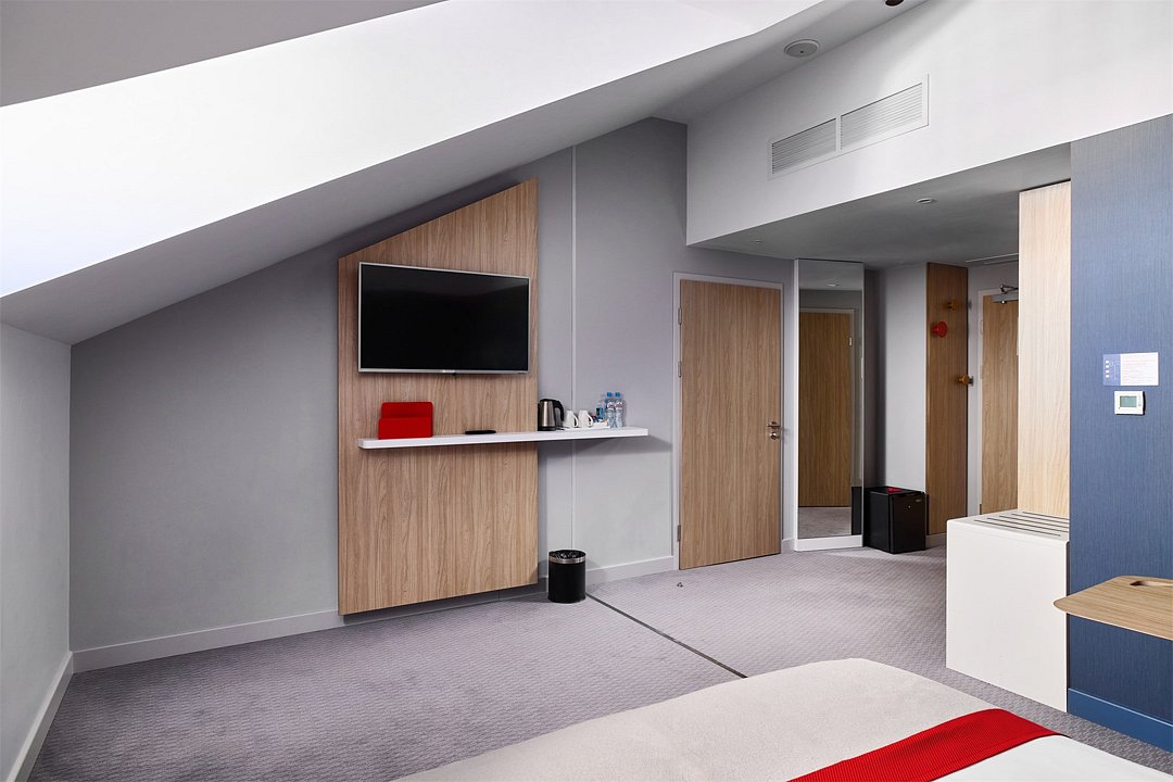 Wi-Fi, телефон, фен, электронные замки, утюг, душевая кабина, банные полотенца, кровать «King size», гладильная доска, диван, вешалки, журнальный столик, зеркало, чайный набор, сейф, чайник, унитаз, раковина, питьевая вода, ковровое покрытие, отопление, душ, кулер на этаже, кресло, стаканы, туалетные средства, цифровое тв, диван-кровать, телевизор с плоским экраном, мансардные окна, номер для некурящих, фанкойл, можно с питомцамиВ номере