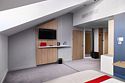 Wi-Fi, телефон, фен, электронные замки, утюг, душевая кабина, банные полотенца, косметические средства, кровать «King size», гладильная доска, вешалки, журнальный столик, багажная тумба, зеркало, чайный набор, сейф, чайник, унитаз, раковина, питьевая вода, ковровое покрытие, отопление, душ, кулер на этаже, кресло, стаканы, цифровое тв, телевизор с плоским экраном, мансардные окна, номер для некурящих, фанкойл, можно с питомцамиВ номере