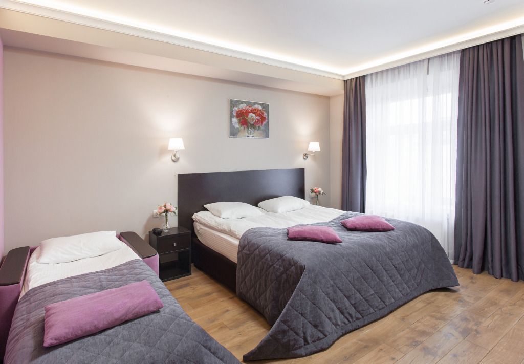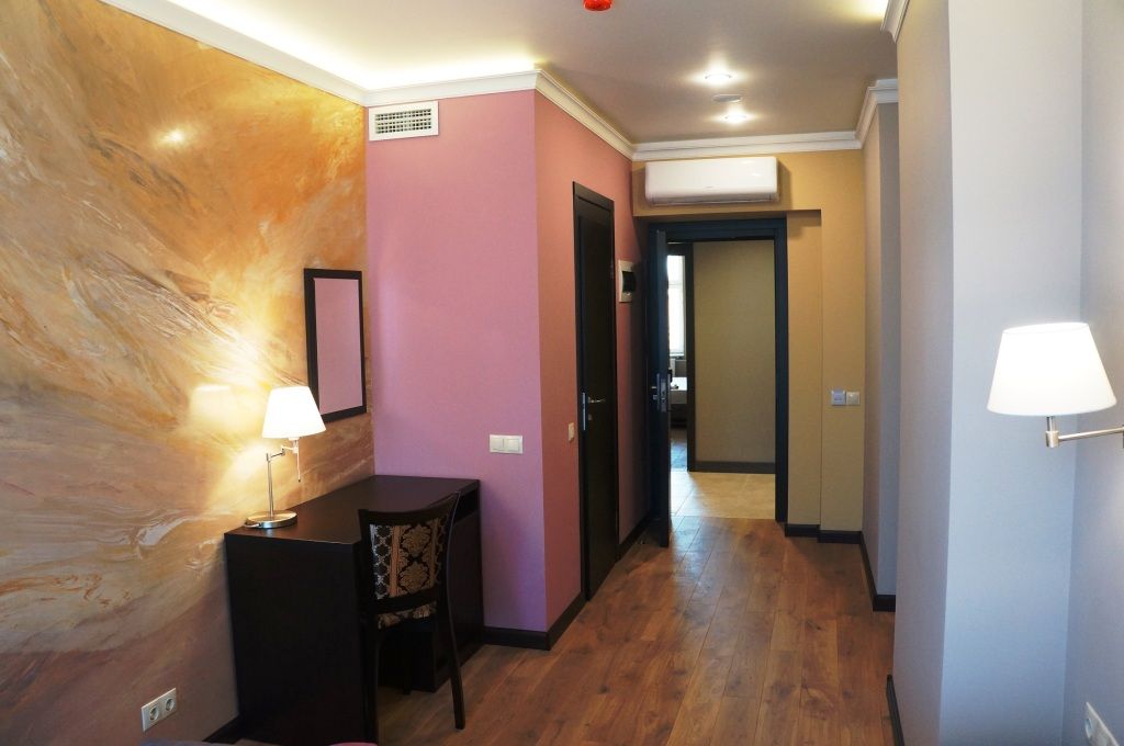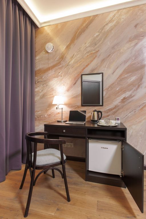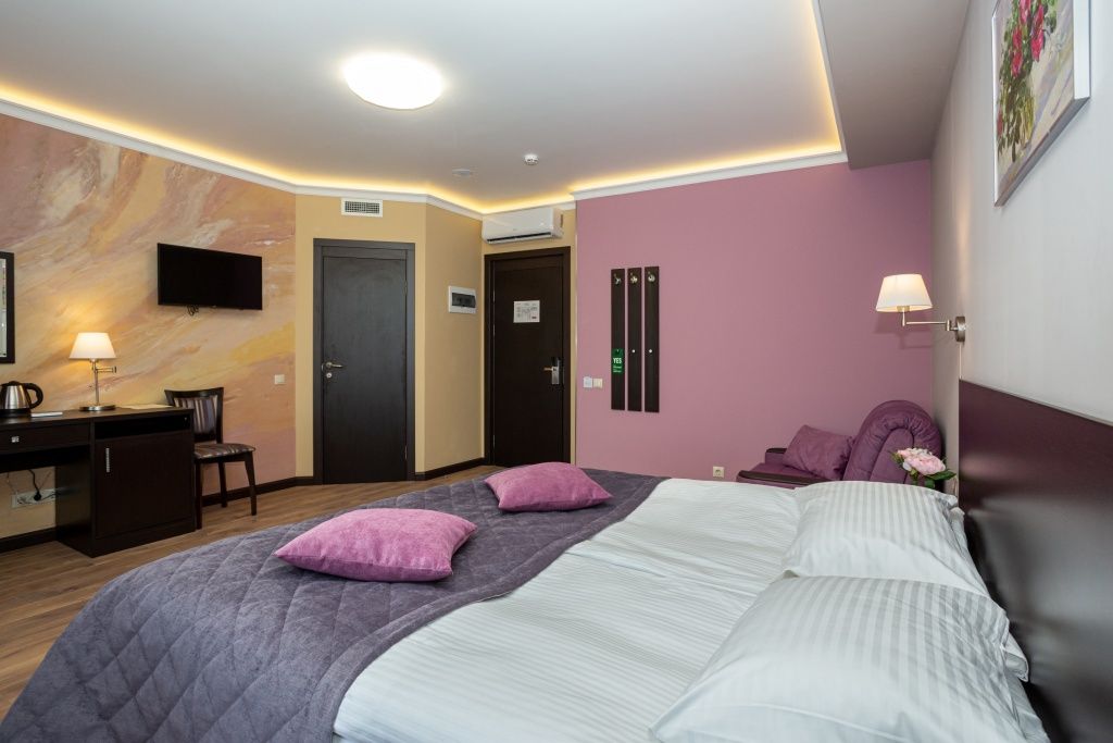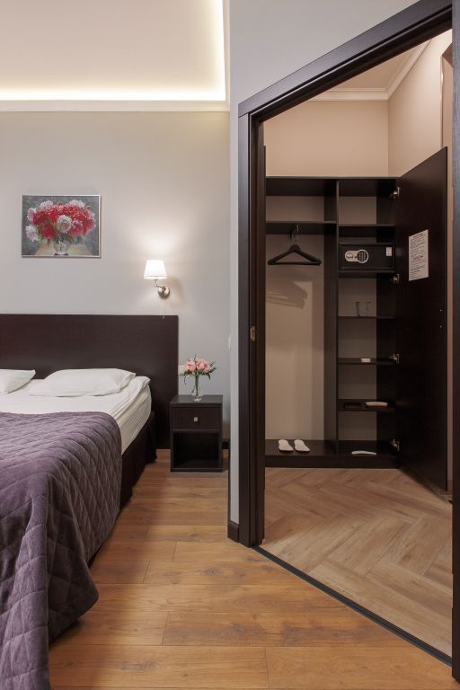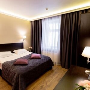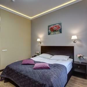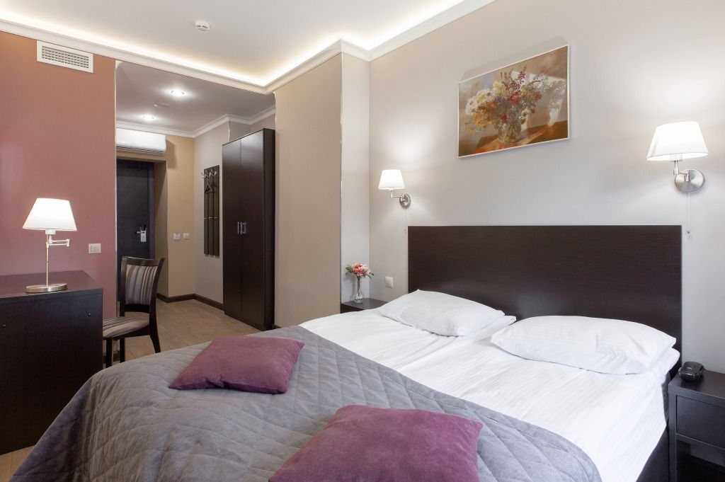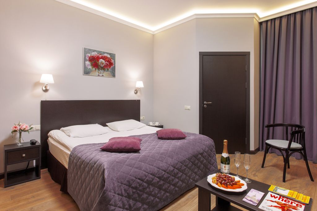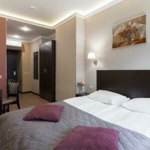 Просторный номер полулюкс площадью от 25 кв.м. с одной двуспальной или двумя односпальными кроватями. В номере есть раскладное одноместное кресло. Номера располагаются с первого по шестой этажи. Вид из окон на тихую улицу или во двор.Услуги и удобства