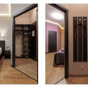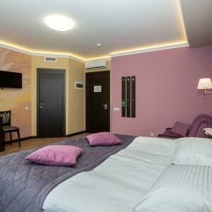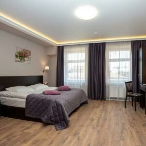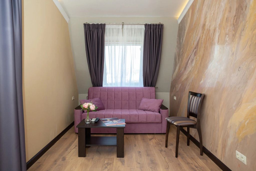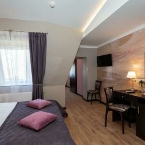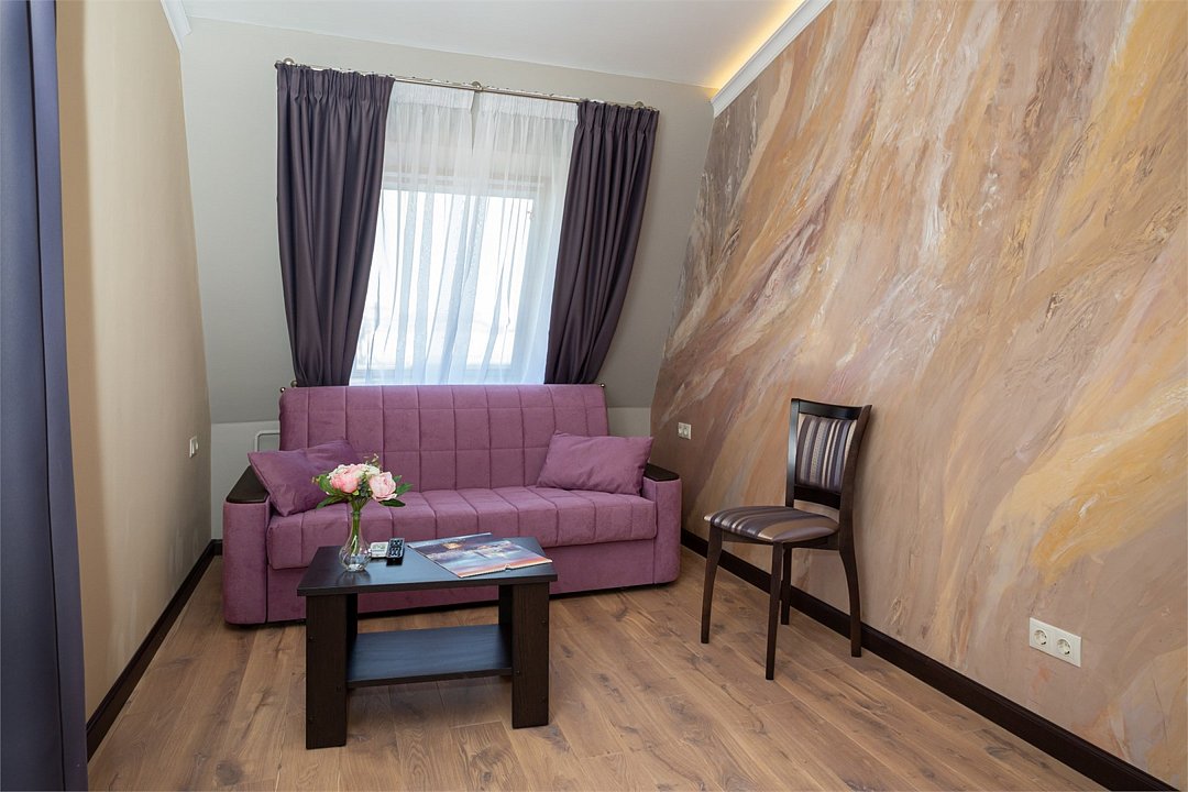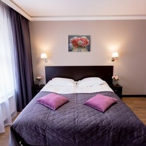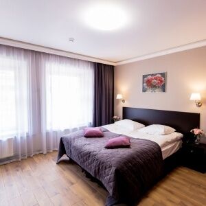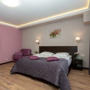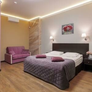 Двухкомнатный номер люкс площадью от 30 кв.м. с одной двуспальной кроватью и балконом. В номере есть раскладной диван для двоих гостей. Вид из окон во двор.Услуги и удобства