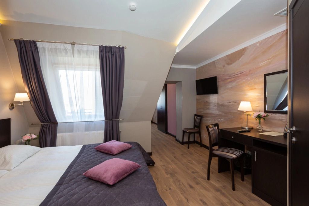 два телевизора, кабельное телевидение, Wi-Fi, телефон, кондиционер, светильник, настольные лампы, фен, система безопасности, электронные замки, обогреватель, ванная комната, ванна, банные принадлежности, халаты, банные полотенца, тапочки, балкон, кровать «King size», стулья, шкаф для одежды, гардеробная, вешалки, журнальный столик, письменный стол, зеркало, две комнаты, чайный набор, сейф, чайник, отопление, кулер на этаже, кресло, вид во двор, паркет, стаканы, стул, туалетные средства, туалет, цифровое тв, диван-кровать, раскладной диван, телевизор с плоским экраном, мини-холодильник, гостиничная парфюмерия, мансардные окна, номер для некурящихВ гостиничном номере