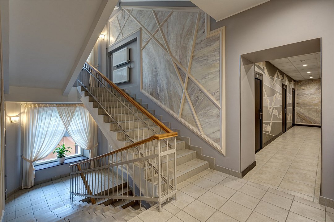 Прибыв ранним, солнечным утром (по Питерским меркам) примерно в девять утра, я, потыкавшись, как тот слепой котёнок в удивленную хозяйскую утку, в три двери отеля с надписями "Вход в отель рядом", наконец вошел в холл. Встреча с администратором запомнилась своей краткостью и строгостью. Сразу вспомнился старшина в далекую ныне пору восьмидесятых, который сухо и монотонно, словно читая мантру, пояснял нам правила службы (проживания), чего, как и с кем нельзя делать ни при каких обстоятельствах, что все - таки можно, но с оглядкой, и, что можно вовсе всегда. Рассчитавшись за номер по положенному тарифу и переплатив за ранний заезд в сумме стоимости целых суток, получив заветный ключ карту от номера, я подошёл к лифту. Лифт оказался весьма опрятен, негромко исполнял какую - то музыку известный классик в динамике, медленно, но уверенно я приближался к верхнему этажу, как мне казалось. Увы, выйдя из телепорта, я с удивлением обнаружил, что к номеру необходимо подняться по весьма неудобной лесенке еще на один этаж. Вооружившись терпением и слагая оду в адрес архитектора данного помещения, я все - таки добрался до места. Стоит отметить, что по моему наблюдению в отеле практически отсутствуют слепые зоны видеонаблюдения в коридорах. Сами коридоры показались мне весьма чистыми, хоть и не первой свежести с точки зрения ремонта. Эдакая барышня лет сорока пяти, застенчиво надевшая на себя халатик медсестры, и пытающаяся выдать себя за молодуху с амбициями. Однако, у номера ждало еще одно разочарование - клок женской (как мне показалось) пряди на полу, словно напоминая мне, что расслабляться пока рано - могут либо постричь, либо депилировать. Чудо карта отворила врата в номер, и я, наконец, очутился в чудном гнёздышке. Причем слово "чудном" здесь можно применить в разных ударениях. И чУдном и чуднОм. Все из-за того, что тот самый авторский дизайнер весьма неординарно отнёсся к идее оформления не побоюсь этого слова - палаты. Номер оказался мансардным, со скошенным до высоты метра потолком, уходящим в наклонное окно, что мне, как туристу небольшого роста особых хлопот не доставило. Однако для людей выше 180 см ростом явно составило бы неудобства при укладывании на ложе. У окна же, будто посреди бухты морской, среди мелких лодок-стульев и яхт-стола и шкафа горделиво выпячивая свою значимость, словно авианосец, выплывала двуспальная кровать. Номер оказался махоньким, весьма потрёпанным житейскими перипетиями, но тем не менее, весьма чистым и с тонкими нотками ухоженности, я бы так сказал. Видно, что за номером следят с особым трепетом, как та мамаша за поскрёбышем, считая его самым - самым. И вот тут я понял почему. За портьерами в углу я обнаружил дверь о трёх замках, отворив которые я оказался на весьма уютном и солнечном балкончике! Вот это подарок. Если бы мне сказали, что есть такой номер, но в нем нет телевизора-я бы выбрал его. Балкон выходит в тихий двор, с обшарпанными в лучших питерских традициях крышами, преподнося к вашему взору великолепный вид на пожарную каланчу и храм неподалёку. Стоит отметить, что, выставив стул и столик на балкон-можно как тот аристократ из известного произведения пить кофу и наслаждаться звуками тихого дворика, поглядывая то влево, то вправо и вдыхая питерский воздух, что я, собственно, и делал по утрам, заменив кофу на чай.