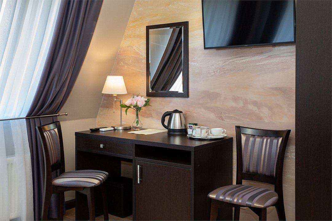 два телевизора, кабельное телевидение, Wi-Fi, телефон, кондиционер, светильник, настольные лампы, фен, система безопасности, электронные замки, обогреватель, ванная комната, ванна, банные принадлежности, халаты, банные полотенца, тапочки, балкон, кровать «King size», стулья, шкаф для одежды, гардеробная, вешалки, журнальный столик, письменный стол, зеркало, две комнаты, чайный набор, сейф, чайник, отопление, кулер на этаже, кресло, вид во двор, паркет, стаканы, стул, туалетные средства, туалет, цифровое тв, диван-кровать, раскладной диван, телевизор с плоским экраном, мини-холодильник, гостиничная парфюмерия, мансардные окна, номер для некурящихВ номере
