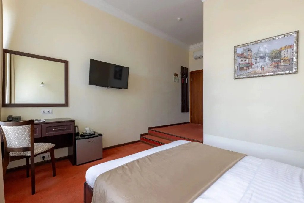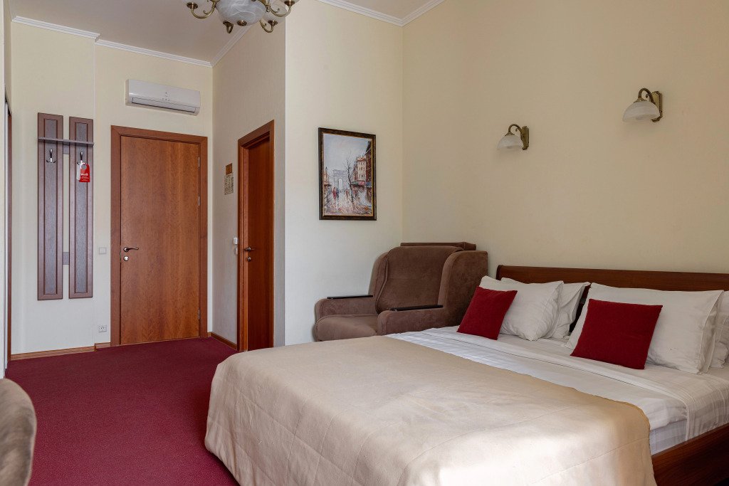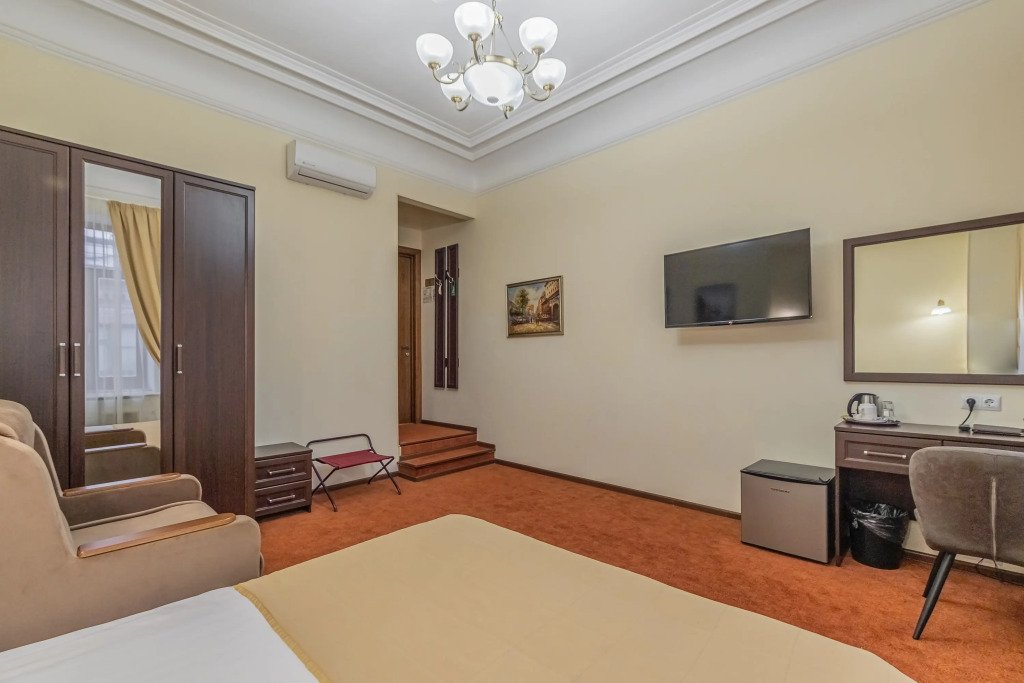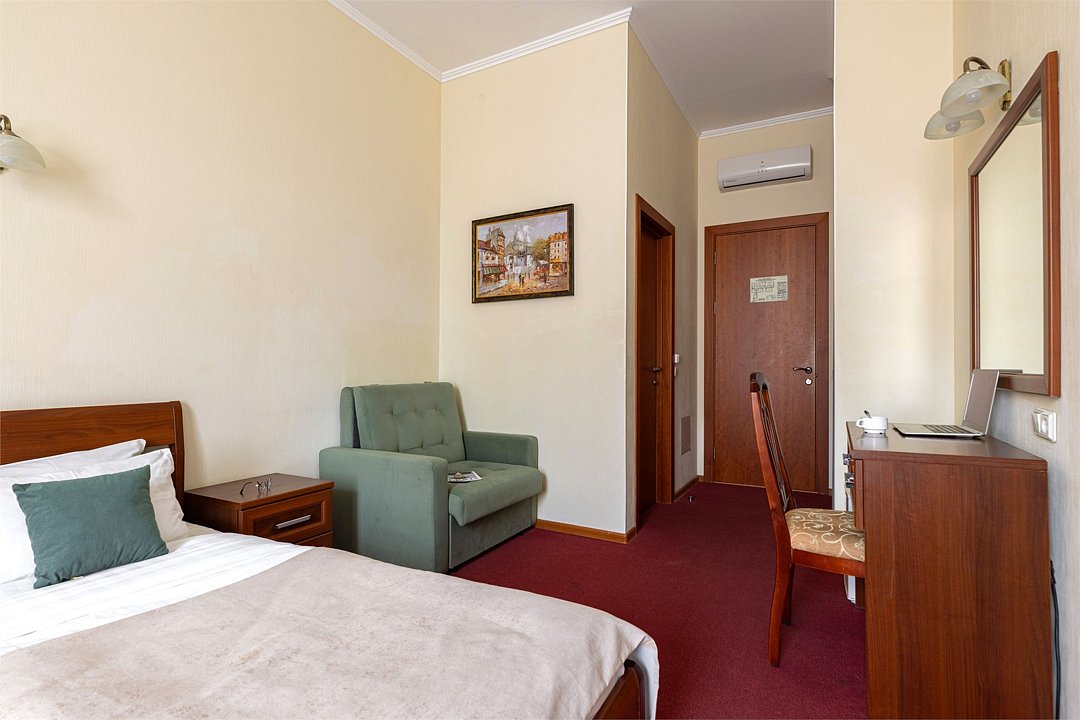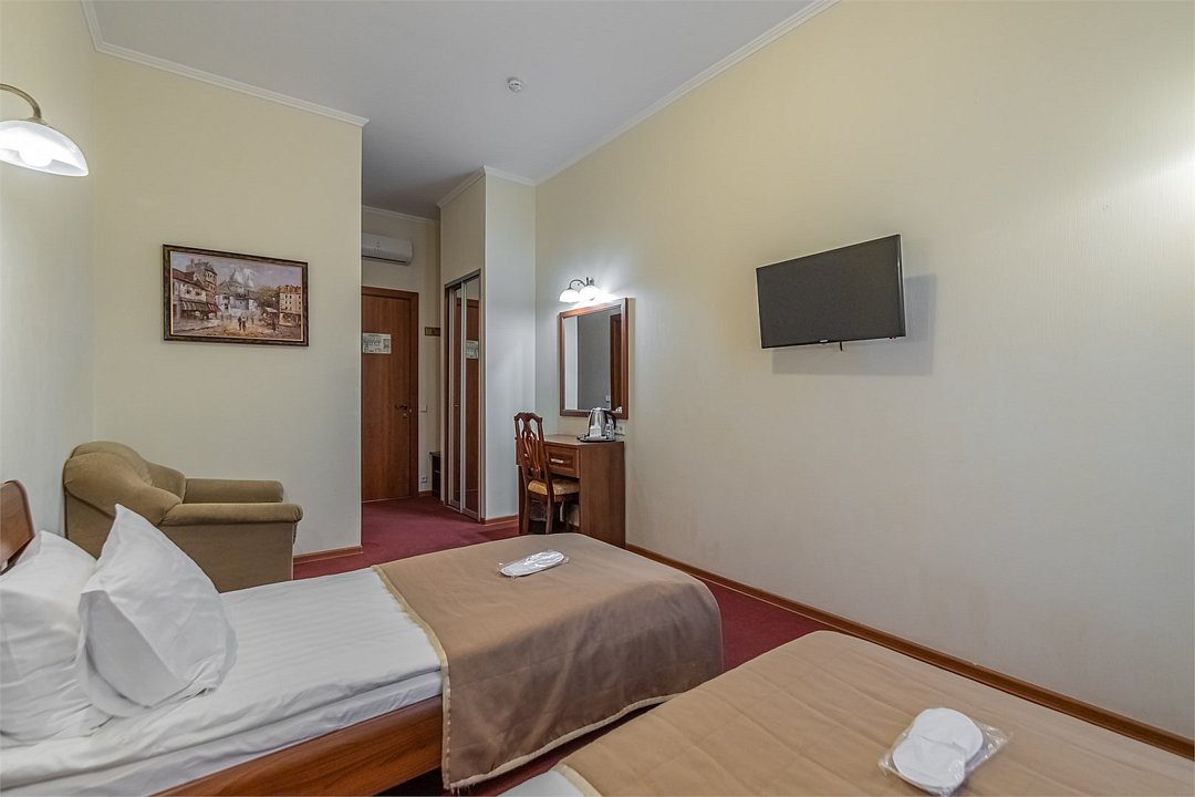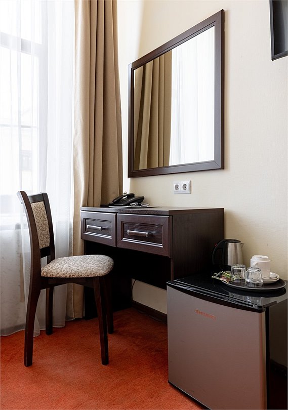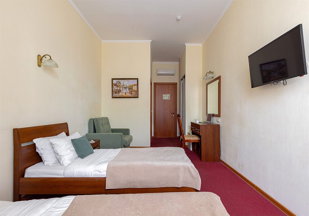 Комнаты данной категории идеально подойдут как для семейного и туристического отдыха, так и для командировок. Комнаты оснащены всем необходимым для комфортного пребывания: две односпальные кровати (90*200см) или одна большая (180*200см), кондиционер, мини-холодильник, чайный набор, шкаф, тумбочки, кресло раскладное, письменный стол с стулом и зеркалом, сейф, телевизор. В собственной ванной комнате есть душевая кабина, туалет, раковина с зеркалом, гостиничная парфюмерия и набор полотенец. Окна выходят в тихий внутренний дворик. Данная категория предназначена для размещения от 1 до 3 человек (возможно размещение 2 взрослых и 2 детей) В стоимость включены: ежедневная уборка и Wi-Fi на всей территории.Услуги и удобства