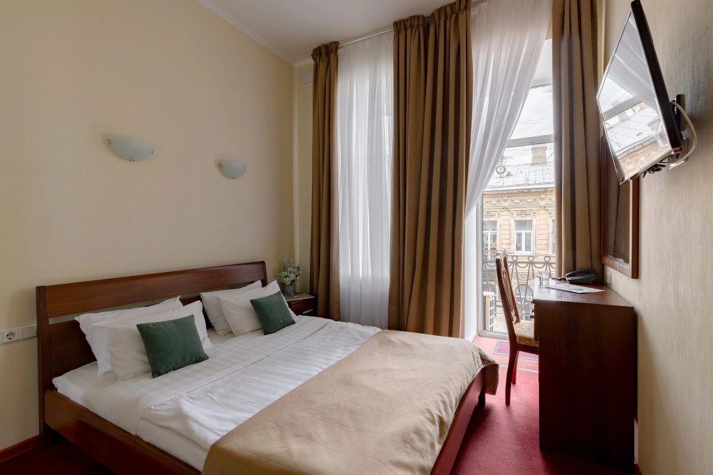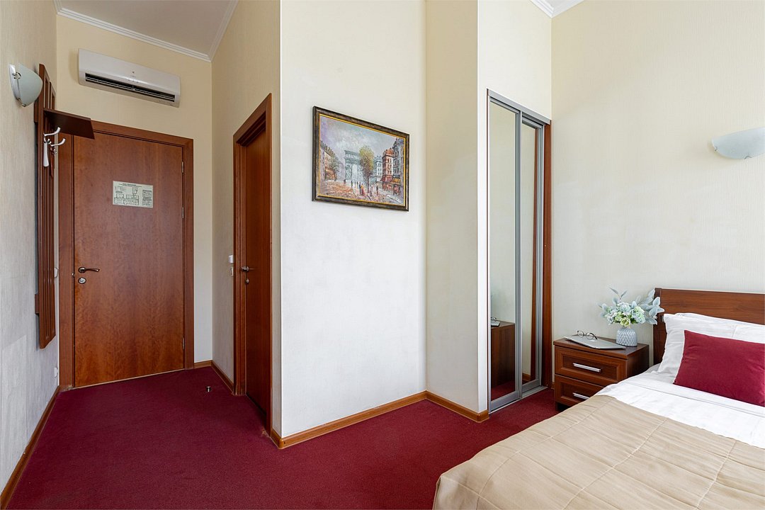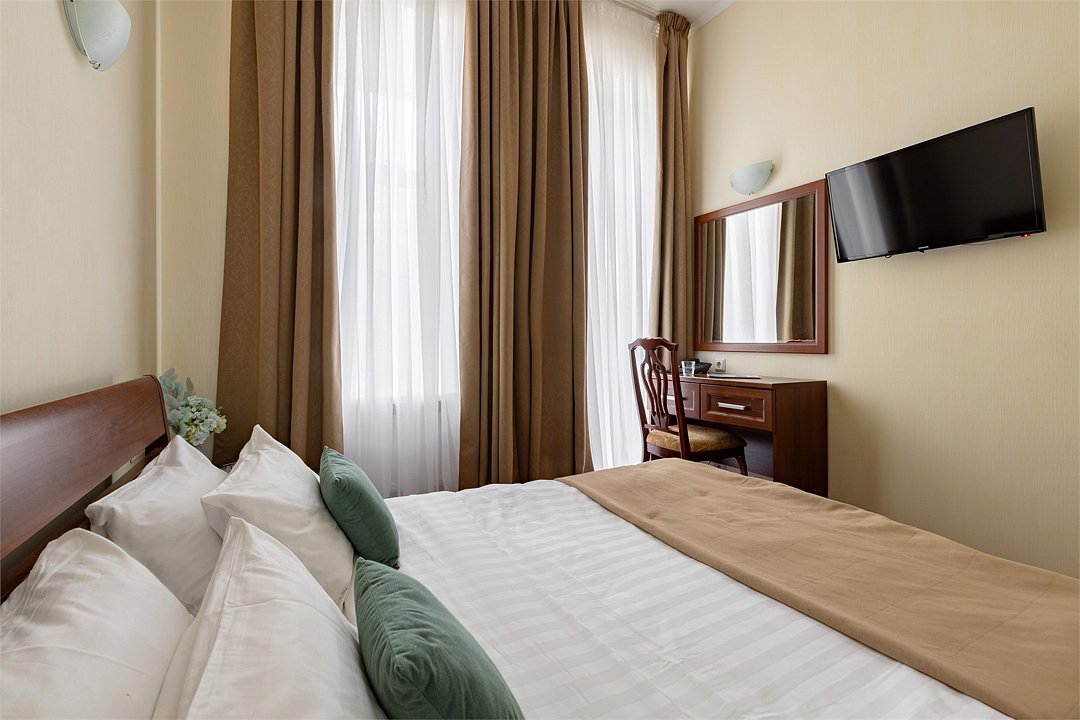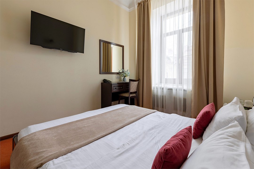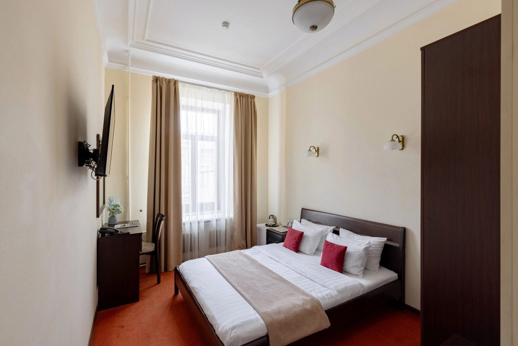 Небольшая комната с балконом и прекрасным видом на улицу Рубинштейна. Номер оснащен все необходим для комфортного пребывания в самом центре Санкт-Петербурга: Кровать 160*200 см, шкаф, тумбочка, телевизор, чайный набор, кондиционер, письменный стол со стулом и зеркалом, мини-холодильник, сейф. В собственной ванной комнате есть душевая кабина, раковина, туалет, зеркало, фен, гостиничная парфюмерия и полотенца. Включены в стоимость: ежедневная уборка и Wi-FiУслуги и удобства