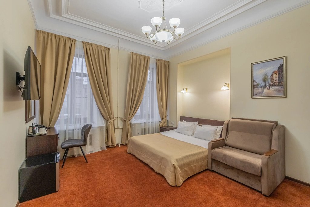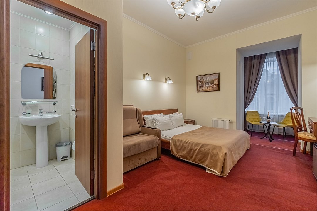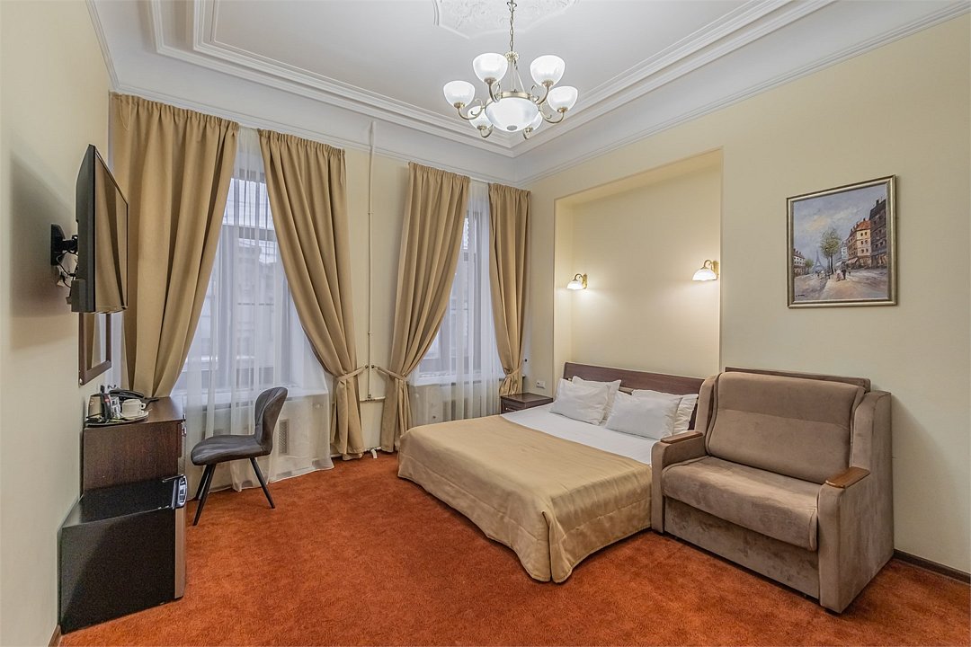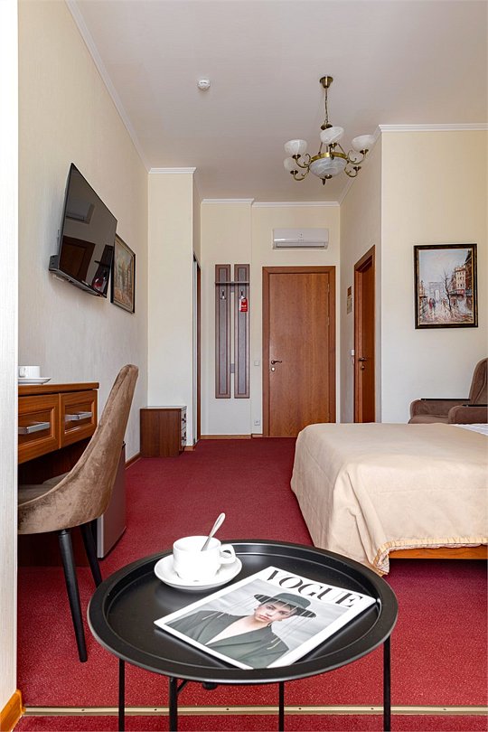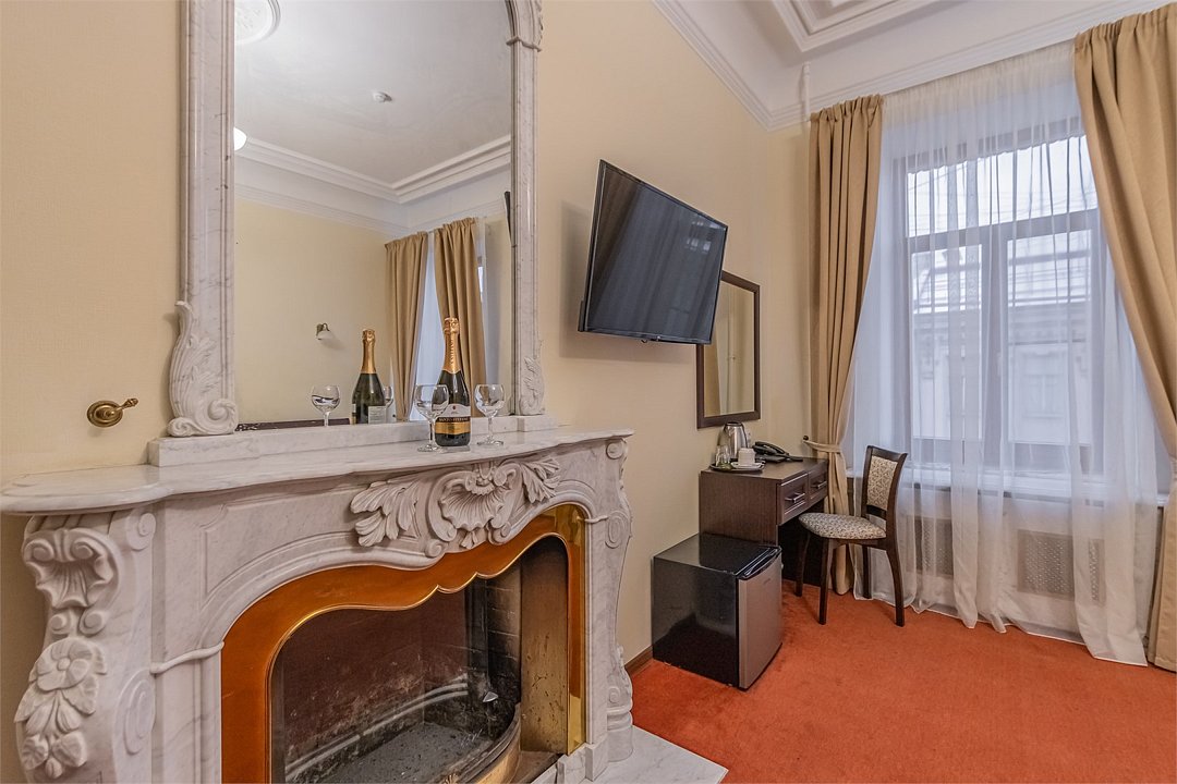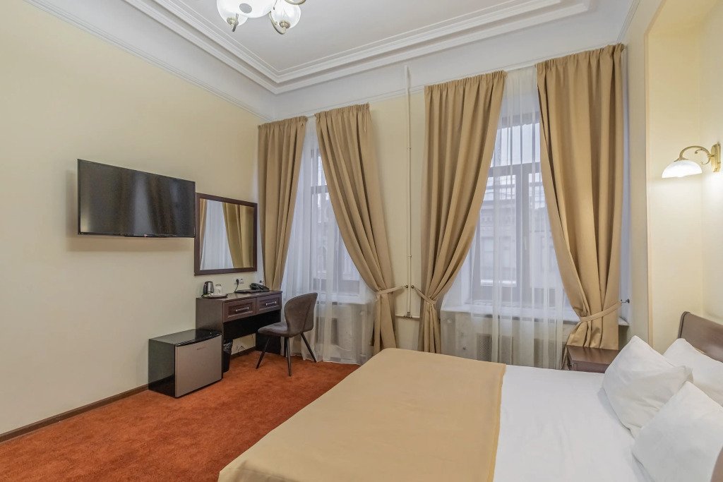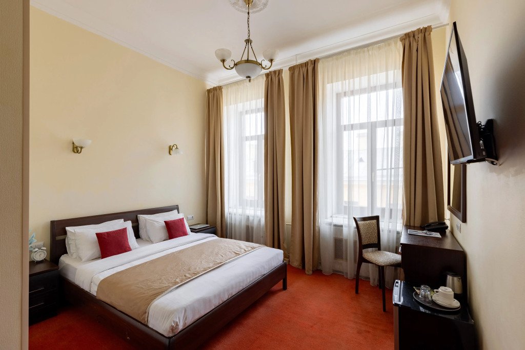 Улучшенный номер с 1 кроватью, ванной-джакузи и видом в тихий Питерский двор. В комнате есть кровать 160*200 см, кондиционер, мини-холодильник, рабочий стол со стулом и зеркалом, телевизор, большой шкаф с сейфом, тумбочки, вешалка для верхней одежды. В ванной комнате есть раковина с зеркалом, туалет, фен, набор косметических принадлежностей, набор полотенце и джакузи, в котором можно провести романтический вечер или расслабиться после прогулки по Санкт-Петербургу. В стоимость включены: ежедневная уборка и WI-FI на всей территории.Услуги и удобства
