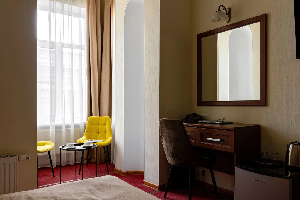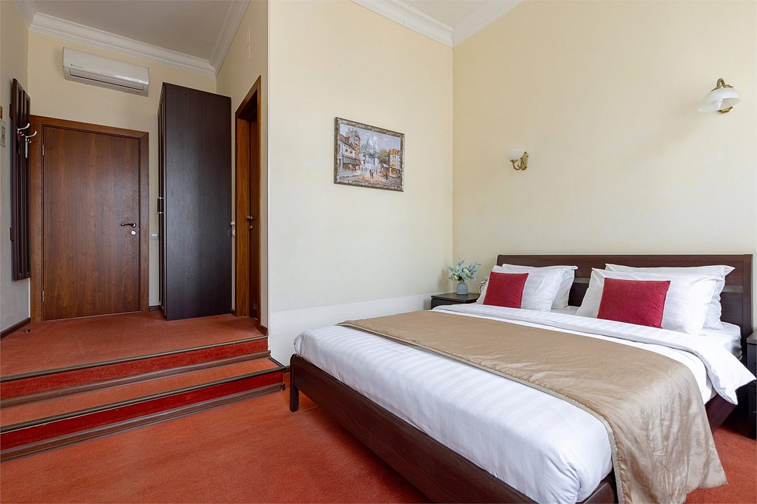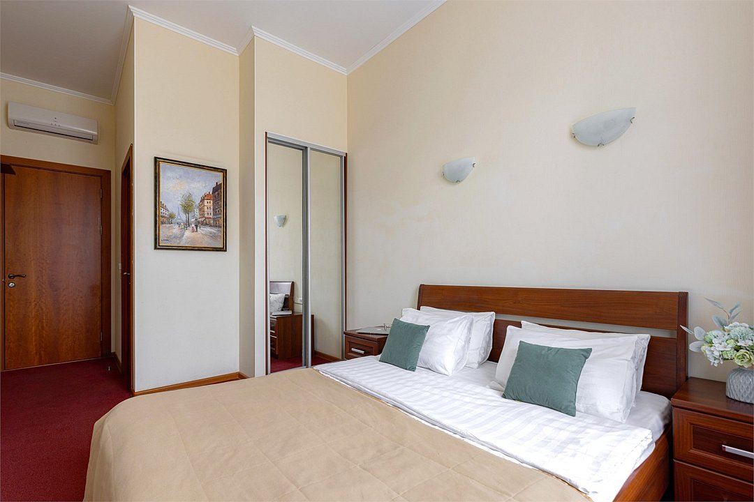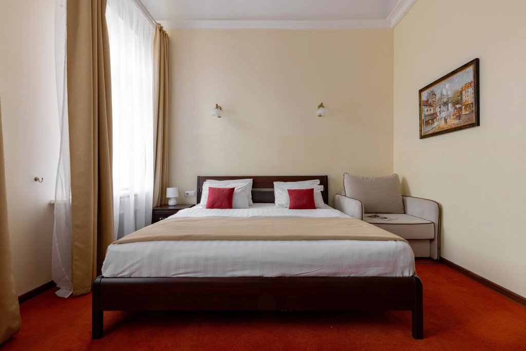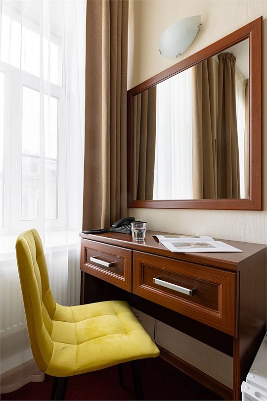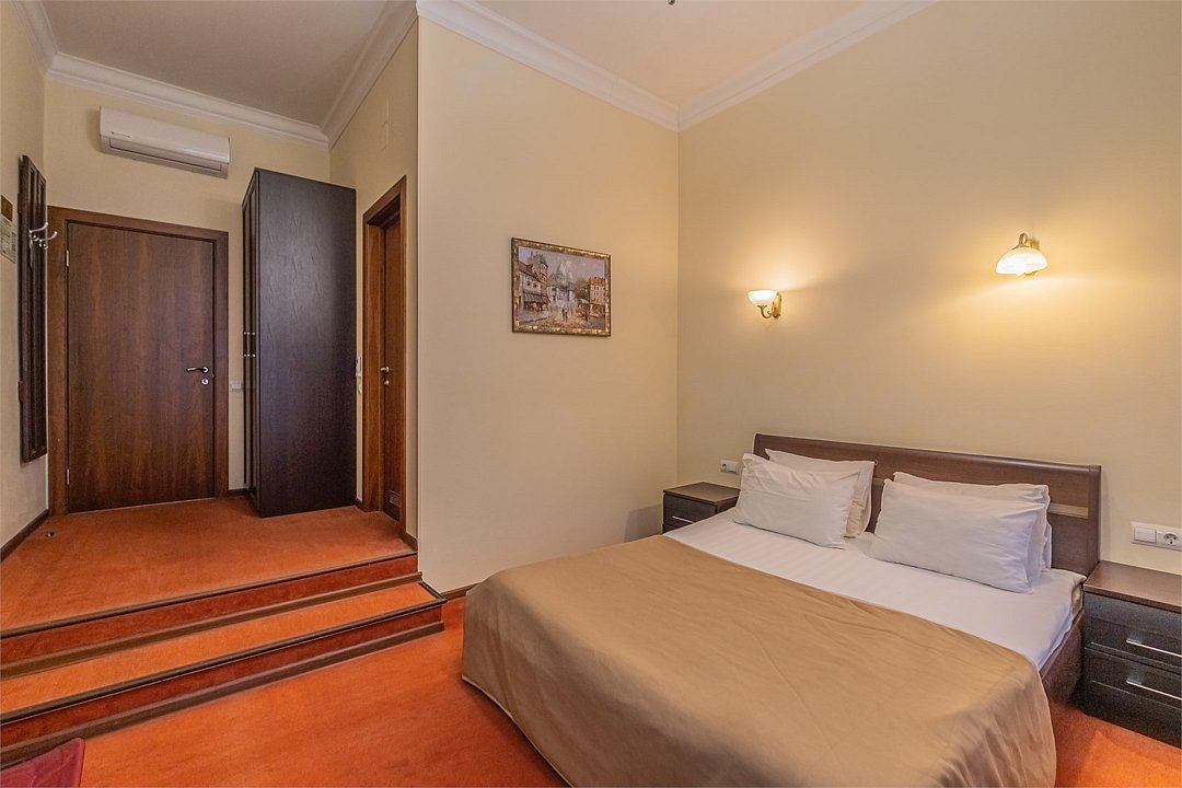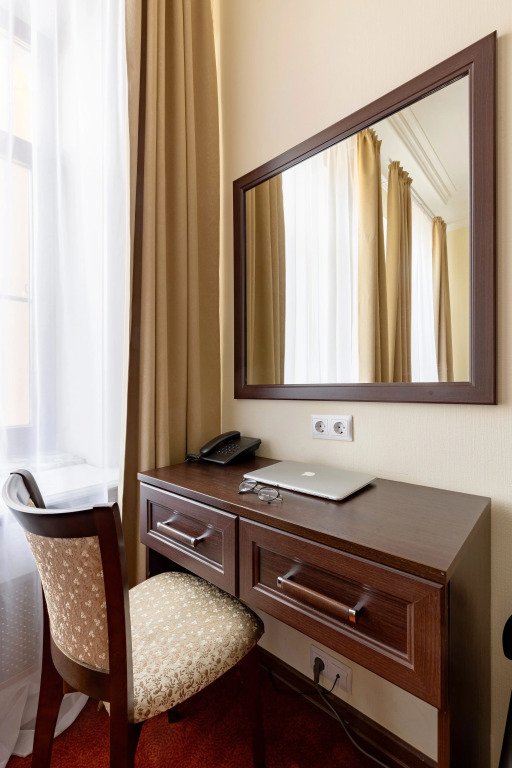 Улучшенный номер с 1 кроватью, ванной-джакузи и видом в тихий Питерский двор. В комнате есть кровать 160*200 см, кондиционер, мини-холодильник, рабочий стол со стулом и зеркалом, телевизор, большой шкаф с сейфом, тумбочки, вешалка для верхней одежды. В ванной комнате есть раковина с зеркалом, туалет, фен, набор косметических принадлежностей, набор полотенце и джакузи, в котором можно провести романтический вечер или расслабиться после прогулки по Санкт-Петербургу. В стоимость включены: ежедневная уборка и WI-FI на всей территории.Услуги и удобства