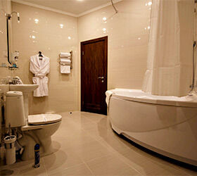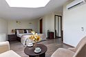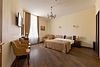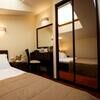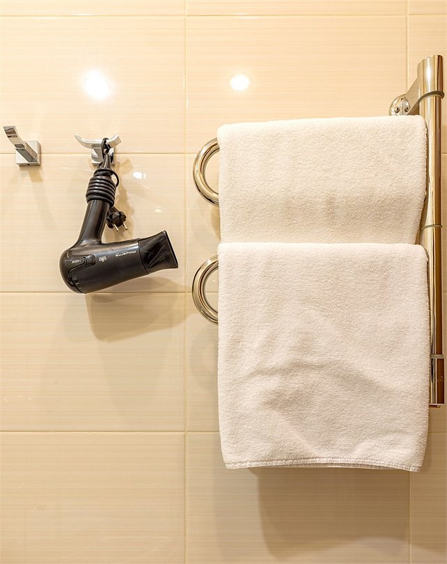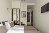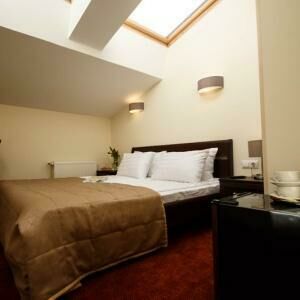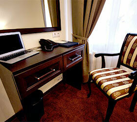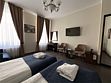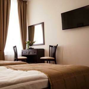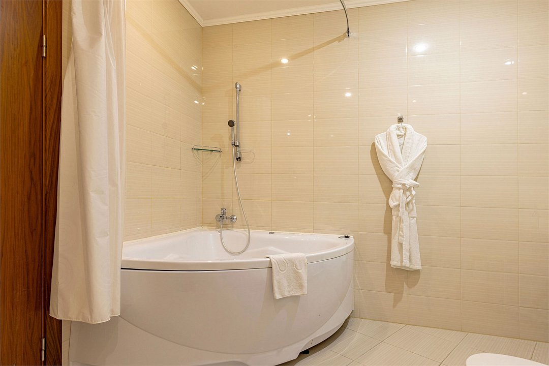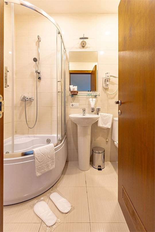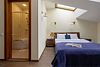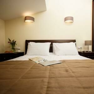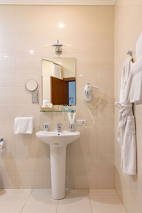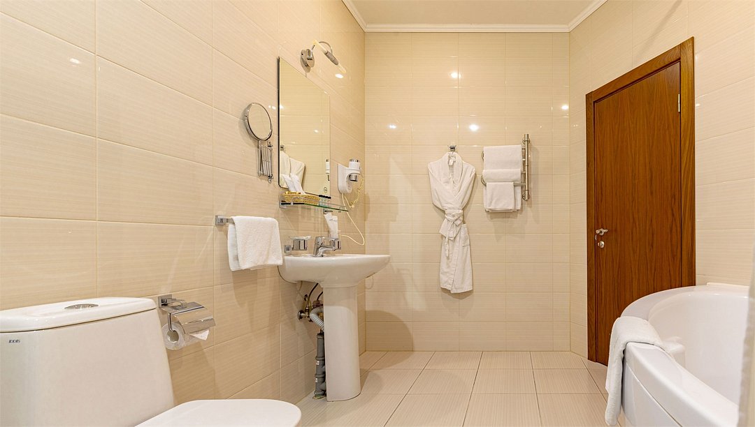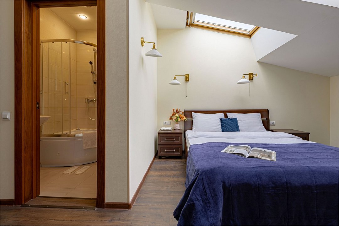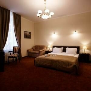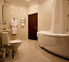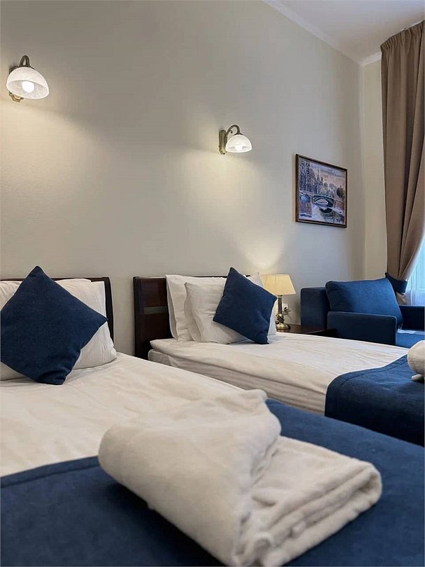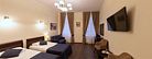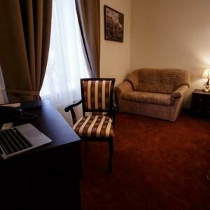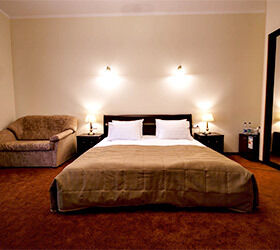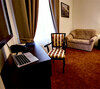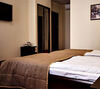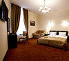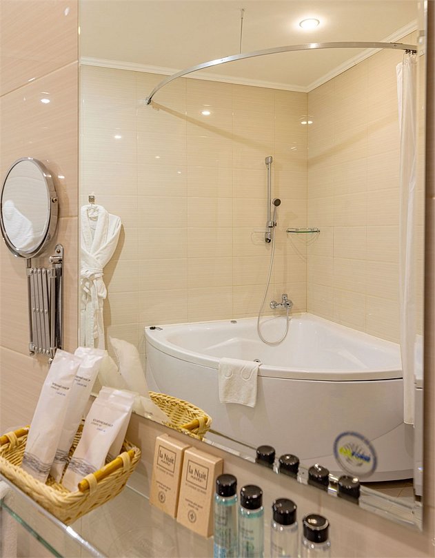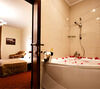 Просторные номера площадью 24 кв.м, состоящие из уютной спальни и комнаты с гидромассажной ванной, халатами, феном, банными и косметическими принадлежностями. Окна номеров выходят во внутренний двор отеля, тихие. В номерах двухспальные кровати, гардероб, рабочий стол. Все номера оборудованы LCD-телевизором, индивидуальной системой кондиционирования, телефоном, холодильником, чайником. В одном номере из трех гидромассажная ванна прямоугольная!Услуги и удобства