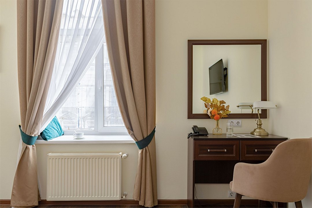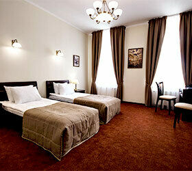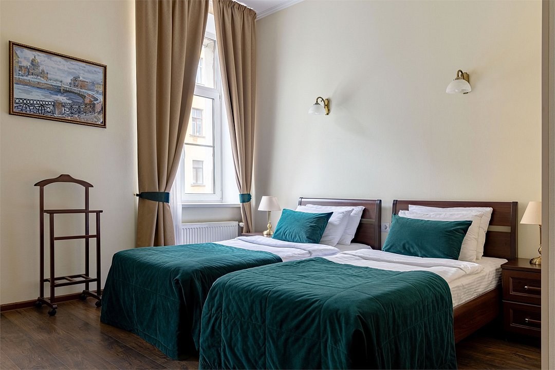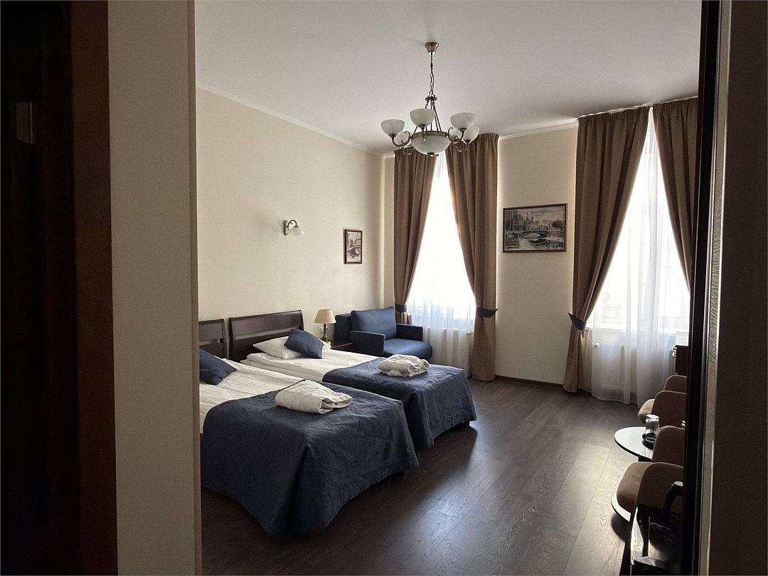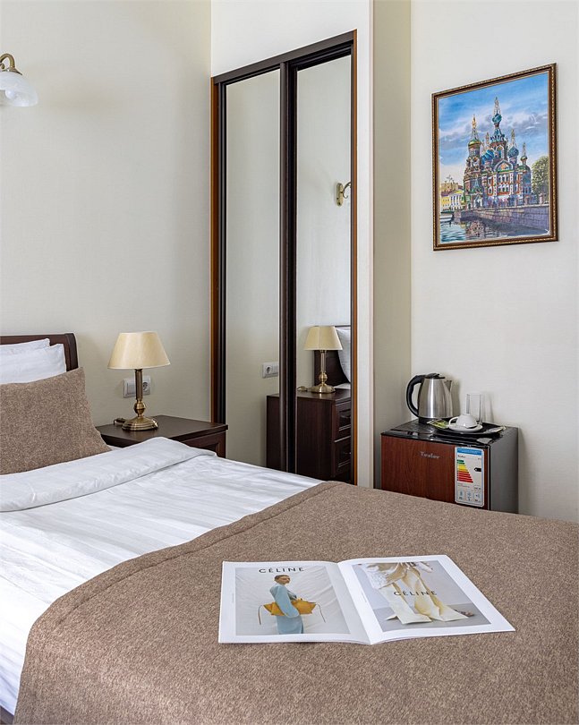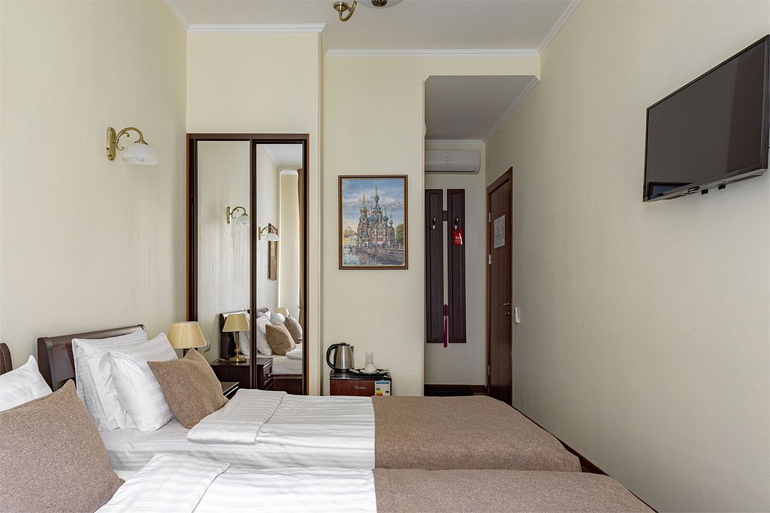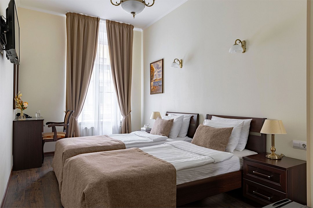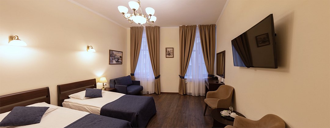 Светлые номера состоящие из уютной спальни и ванной комнаты с душевой кабиной, феном, банными и косметическими принадлежностями. Окна номеров выходят на Загородный проспект. Площадь около 14 кв.м. В номерах установлены две раздельные кровати, гардероб, рабочий стол. Все номера оборудованы LCD-телевизором, индивидуальной системой кондиционирования, телефоном, холодильником, чайником.Услуги и удобства