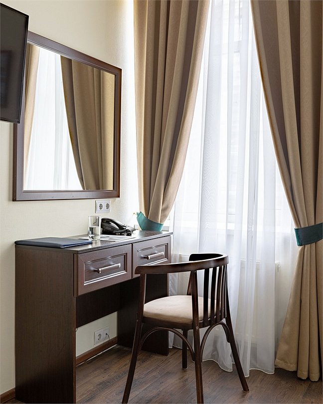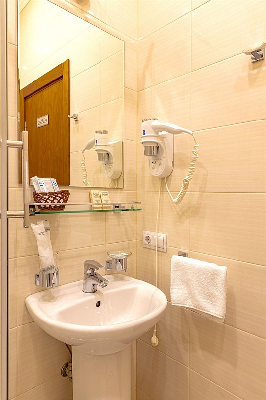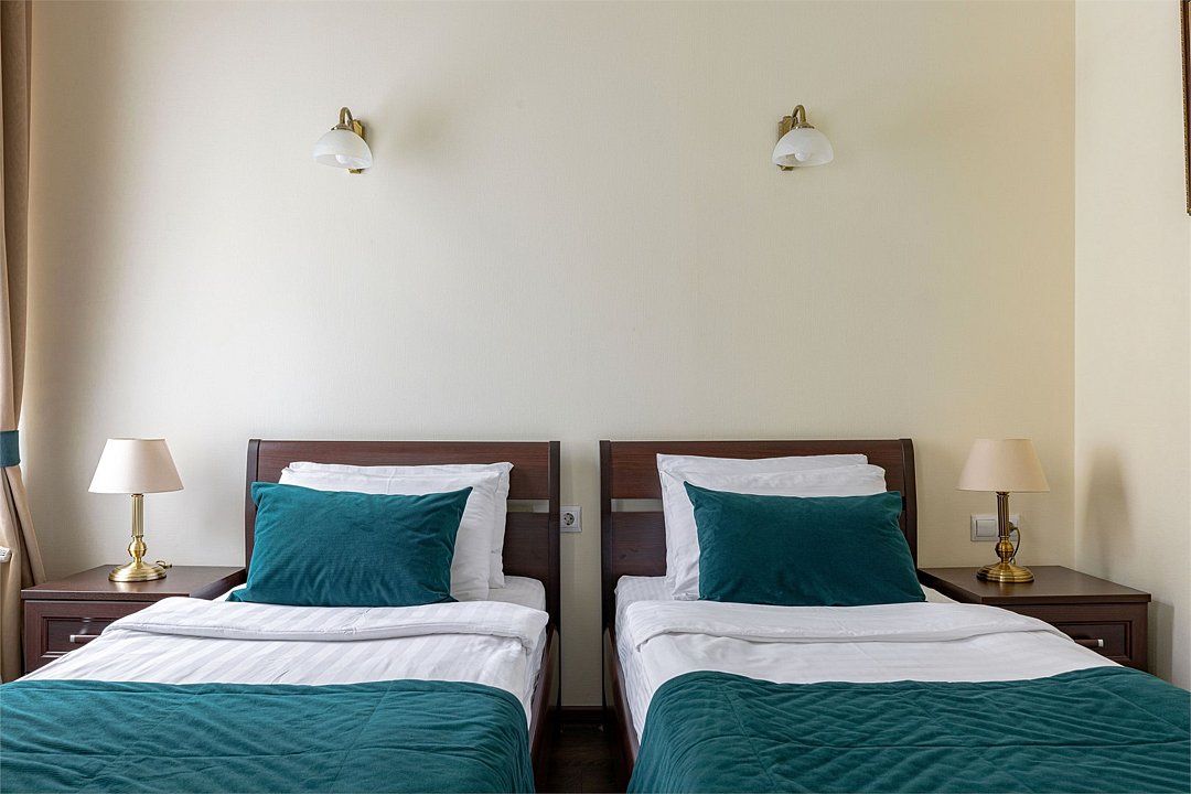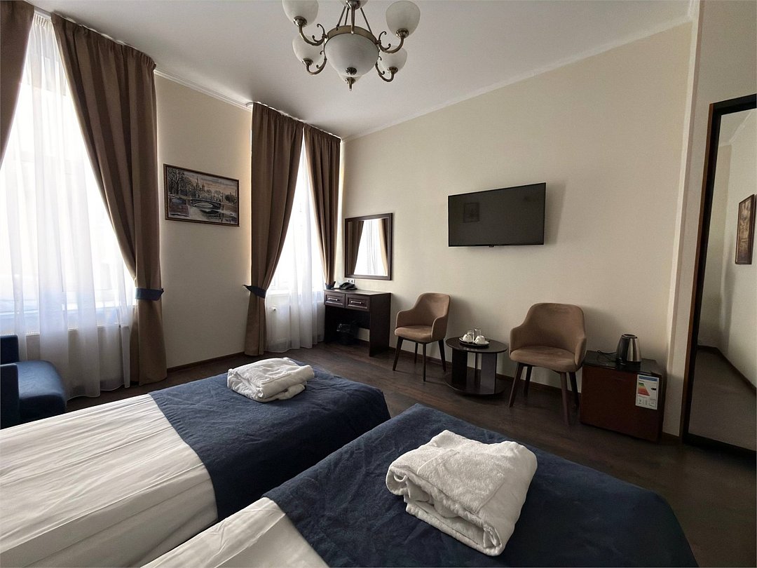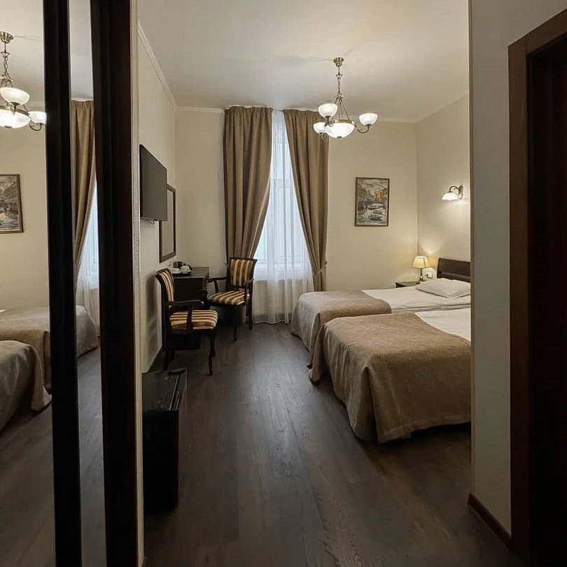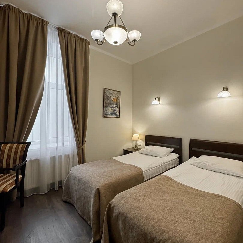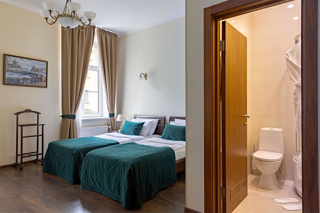 Светлые номера состоящие из уютной спальни и ванной комнаты с душевой кабиной, феном, банными и косметическими принадлежностями. Окна номеров выходят на Загородный проспект. Площадь около 14 кв.м. В номерах установлены две раздельные кровати, гардероб, рабочий стол. Все номера оборудованы LCD-телевизором, индивидуальной системой кондиционирования, телефоном, холодильником, чайником.Услуги и удобства