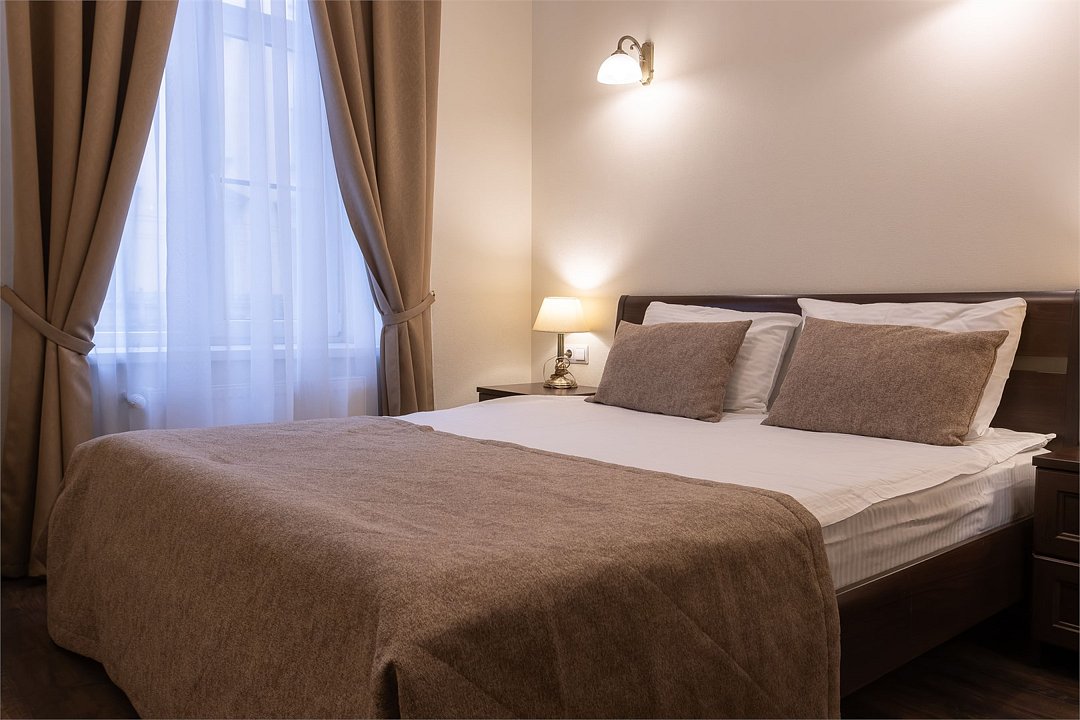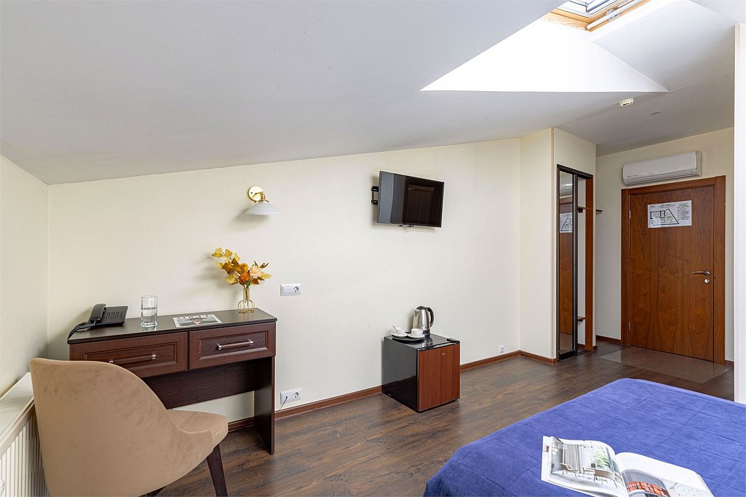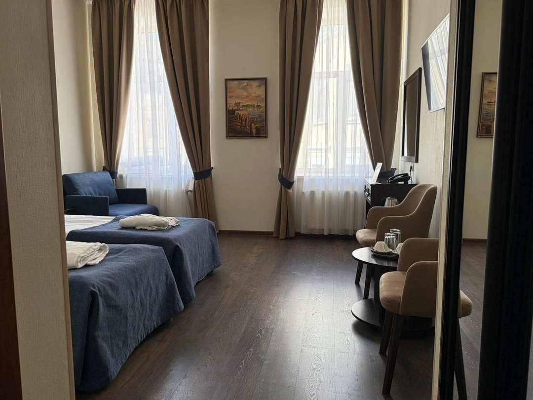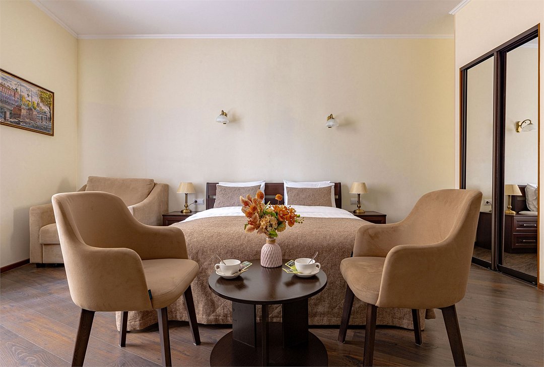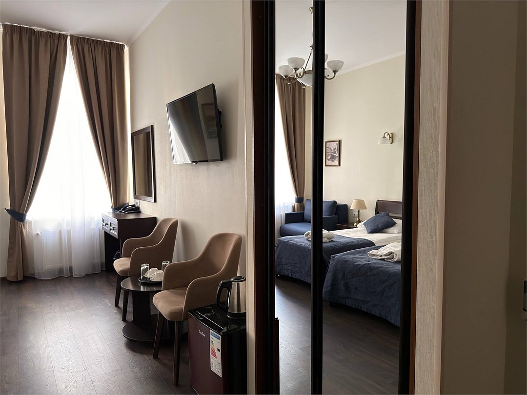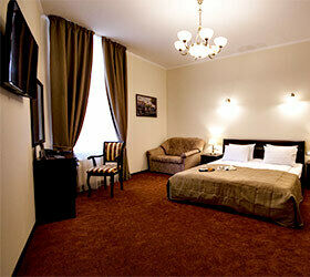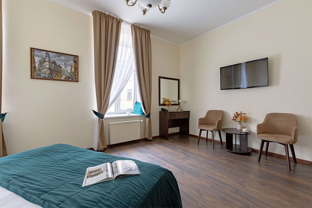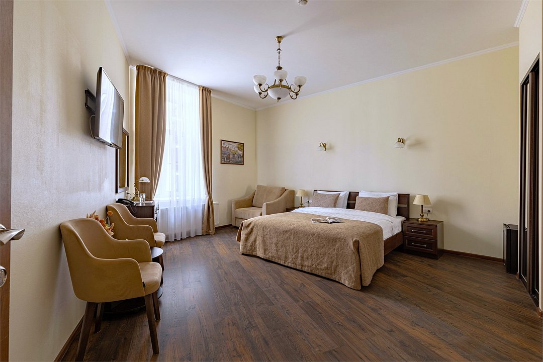 Просторные номера площадью 22 кв.м, состоящие из уютной спальни и комнаты с душевой кабиной, халатами, феном, банными и косметическими принадлежностями. Окна номеров выходят на Загородный проспект. В номерах двухспальные кровати, гардероб, рабочий стол. Все номера оборудованы LCD-телевизором, индивидуальной системой кондиционирования, телефоном, холодильником, чайником.Услуги и удобства