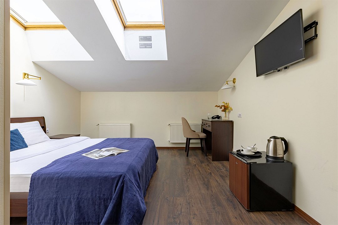 кабельное телевидение, Wi-Fi, интернет, телефон, холодильник, кондиционер, светильник, настольные лампы, фен, обогреватель, ванная комната, душевая кабина, санузел, водонагреватель, банные полотенца, тапочки, гигиенические средства, косметические средства, двуспальная кровать, письменный стол, зеркало, чайник, унитаз, раковина, отопление, кулер на этаже, ламинат, стаканы, стул, тумба, туалетные средства, телевизор с плоским экраном, мини-холодильник, шкаф-купе, гостиничная парфюмерия, мансардные окна, номер для некурящих, фумигатор, уборка номера, без питомцевВ номере