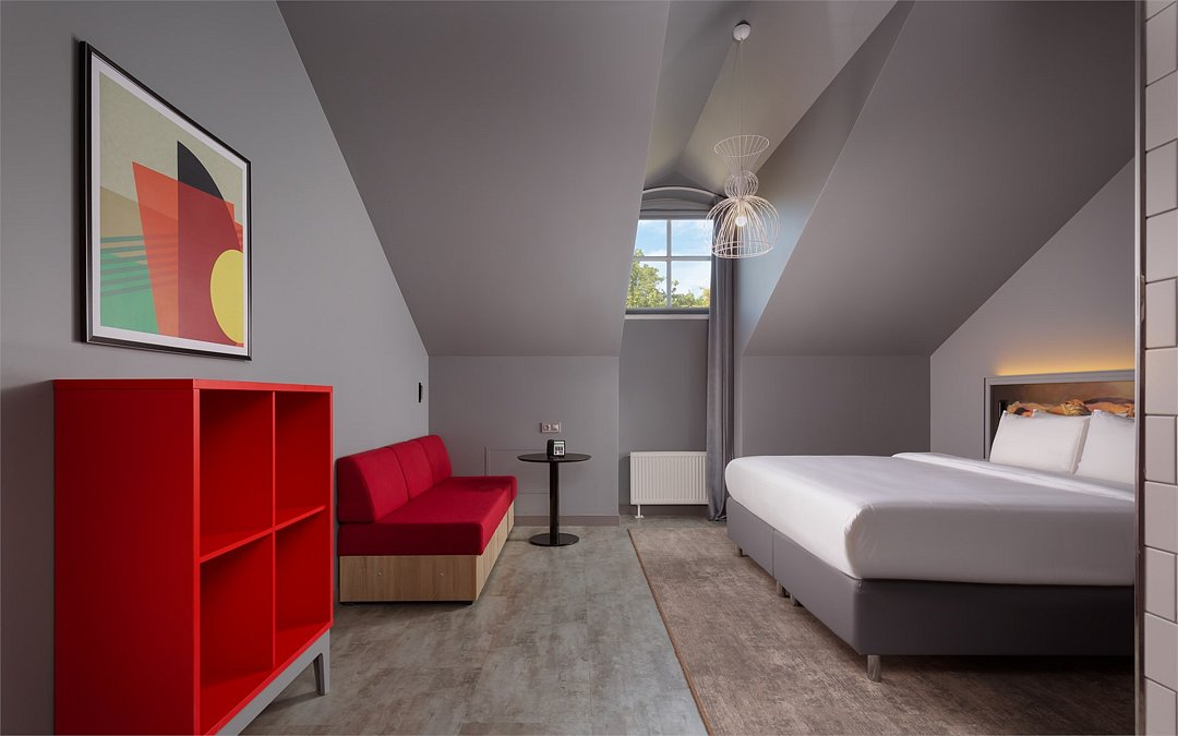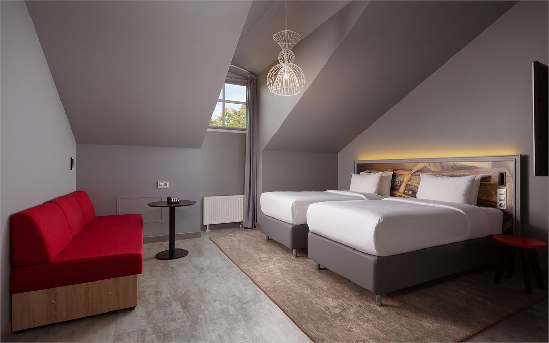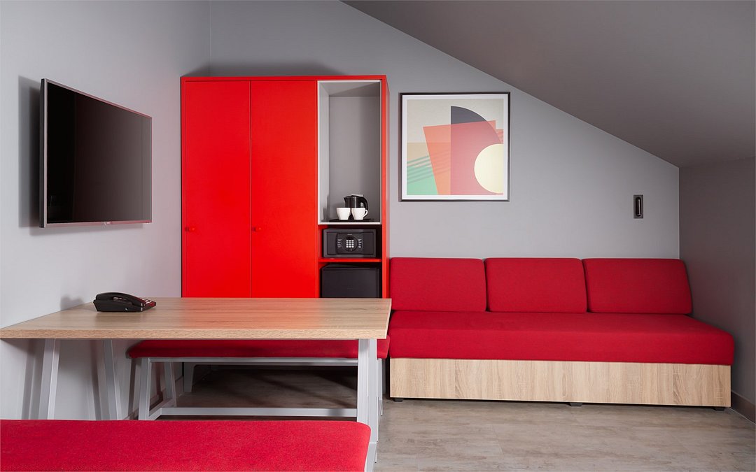 Wi-Fi, телефон, фен, электронные замки, утюг, душевая кабина, банные полотенца, две односпальные кровати, две односпальные или большая двуспальная кровать, гладильная доска, диван, шкаф для одежды, вешалки, багажная тумба, зеркало, чайный набор, обслуживание номеров, сейф, чайник, унитаз, раковина, питьевая вода, ковровое покрытие, отопление, душ, кулер на этаже, меню подушек, стаканы, туалетные средства, туалет, цифровое тв, диван-кровать, телевизор с плоским экраном, мансардные окна, номер для некурящих, фанкойл, usb порт, можно с питомцамиВ гостиничном номере