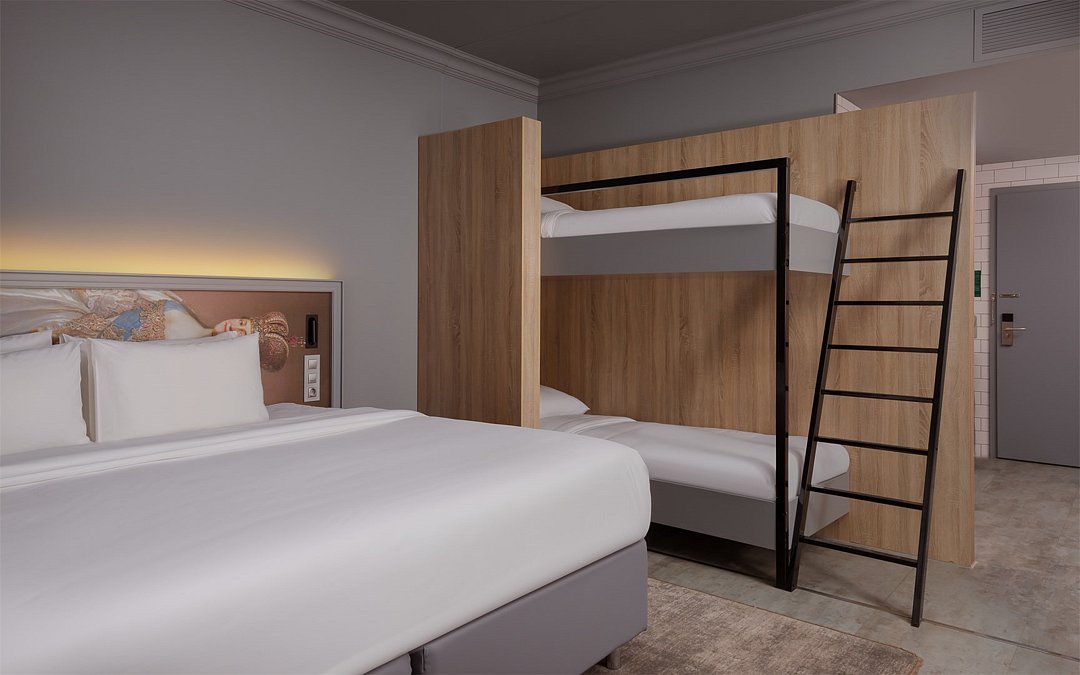 Просторный семейный номер с 2 раздельными и двухъярусной кроватями, средняя площадь 25-45 кв.м. LCD TV, кондиционер, бесплатный WIFI, фен, сейф, утюг, гладильная доска, набор для приготовления чая, кофе предоставляются в каждом номере.В ванной комнате есть душ, туалетные принадлежности.Услуги и удобства