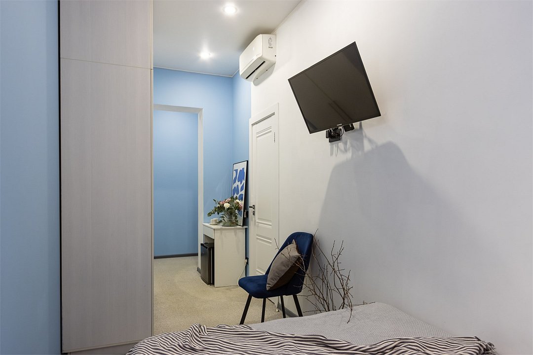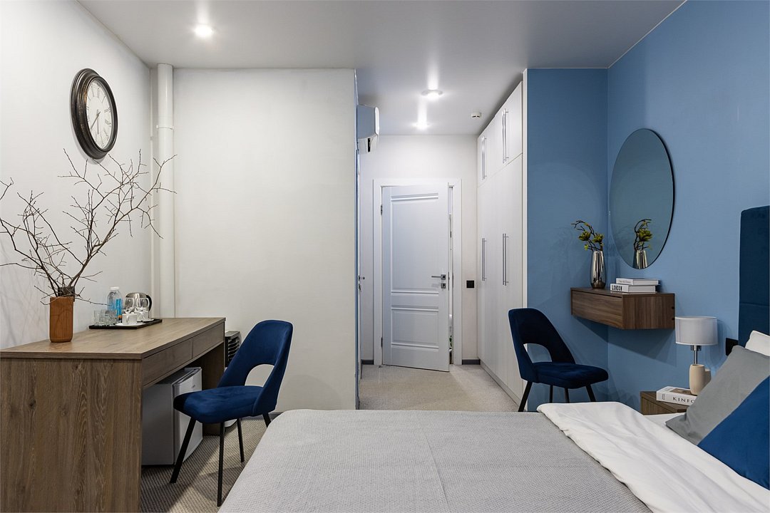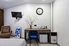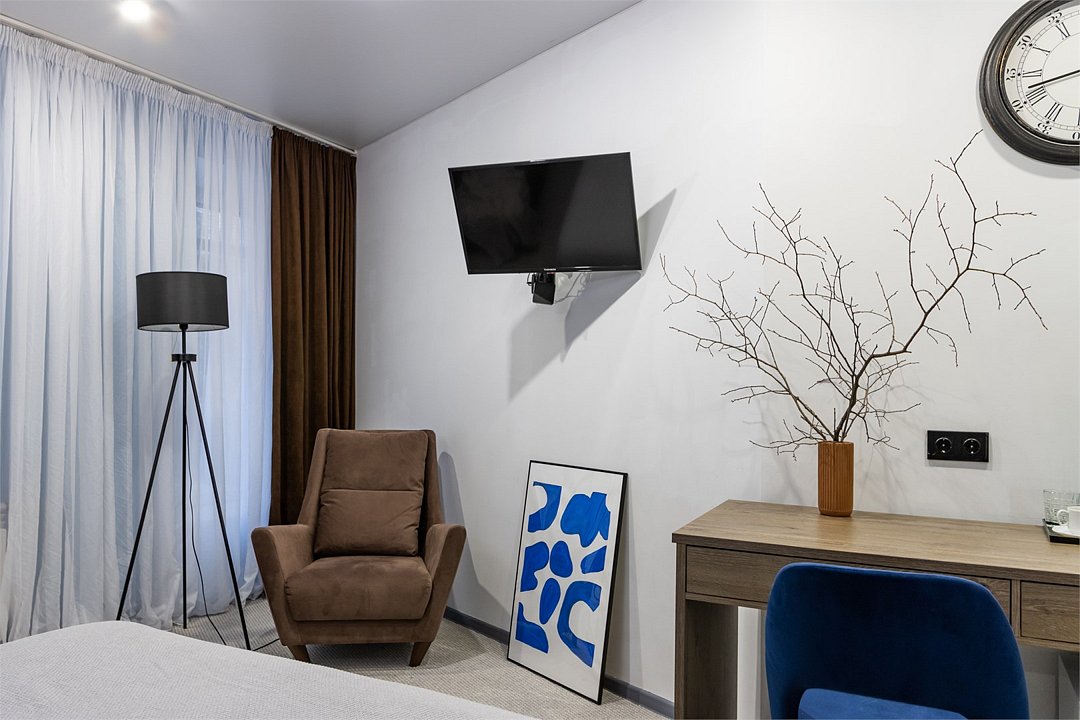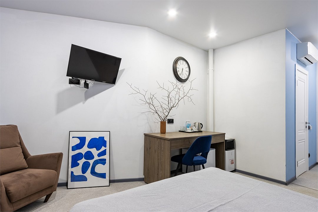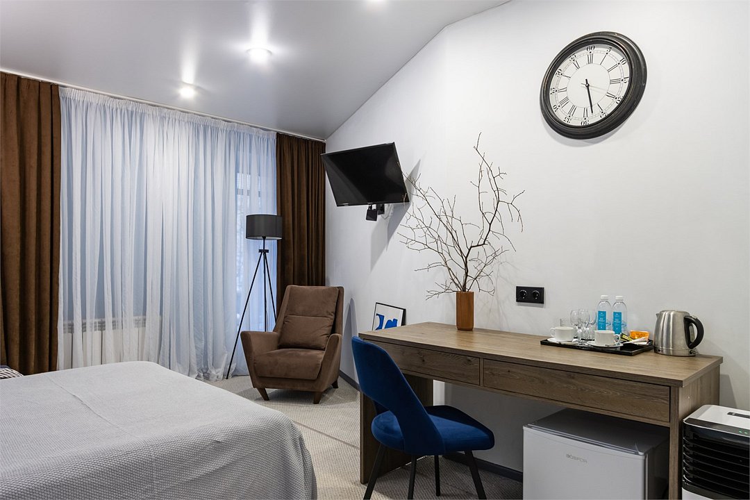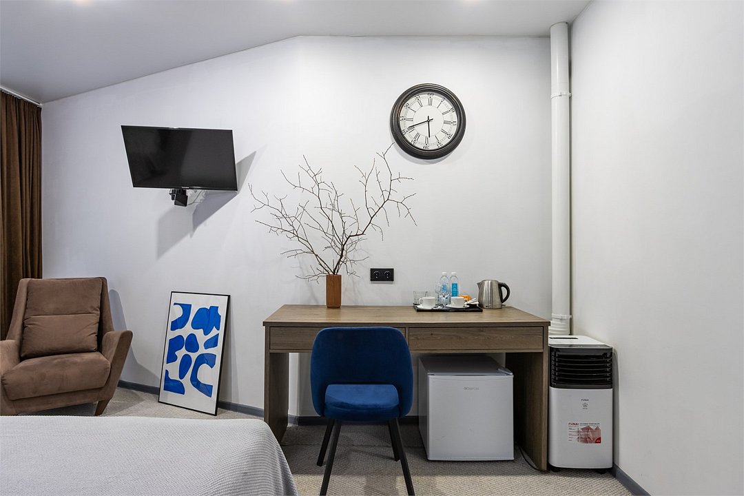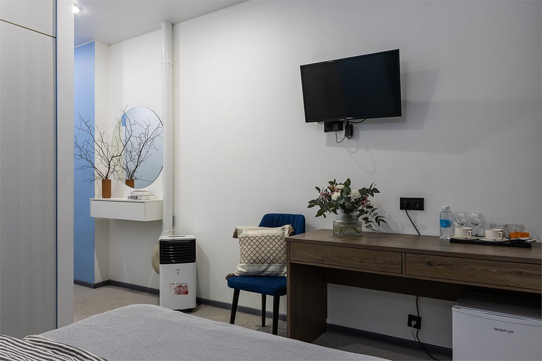 кабельное телевидение, Wi-Fi, кондиционер, светильник, фен, система безопасности, утюг, банные принадлежности, банные полотенца, косметические средства, двуспальная кровать, шкаф для одежды, вешалки, письменный стол, зеркало, унитаз, раковина, душ, вид на город, кулер на этаже, вид во двор, стул, туалет, телевизор с плоским экраном, мини-холодильник, можно с питомцамиВ номере