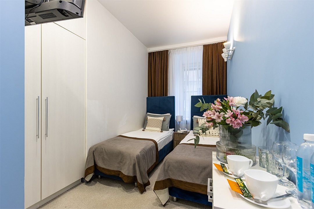 кабельное телевидение, Wi-Fi, интернет, светильник, фен, вентилятор, система безопасности, утюг, душевая кабина, санузел, тапочки, гигиенические средства, косметические средства, две односпальные кровати, шкаф для одежды, зеркало, раковина, вид на город, кулер на этаже, вид во двор, стул, туалетные средства, туалет, телевизор с плоским экраном, можно с питомцамиВ номере