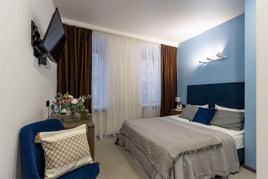 Двухместный номер с двухспальной кроватью и телевизором с плоским экраном. Услуги и удобства: • Душ • Фен • Рабочий стол • Бесплатные туалетно-косметические принадлежности • Туалет • Собственная ванная комната • Кабельные каналы • Шкаф • Вид на город • Полотенца • Белье • Помещение полностью находится на первом этаже • Вешалка для одежды • Туалетная бумага Бесплатный Wi-Fi!Услуги и удобства