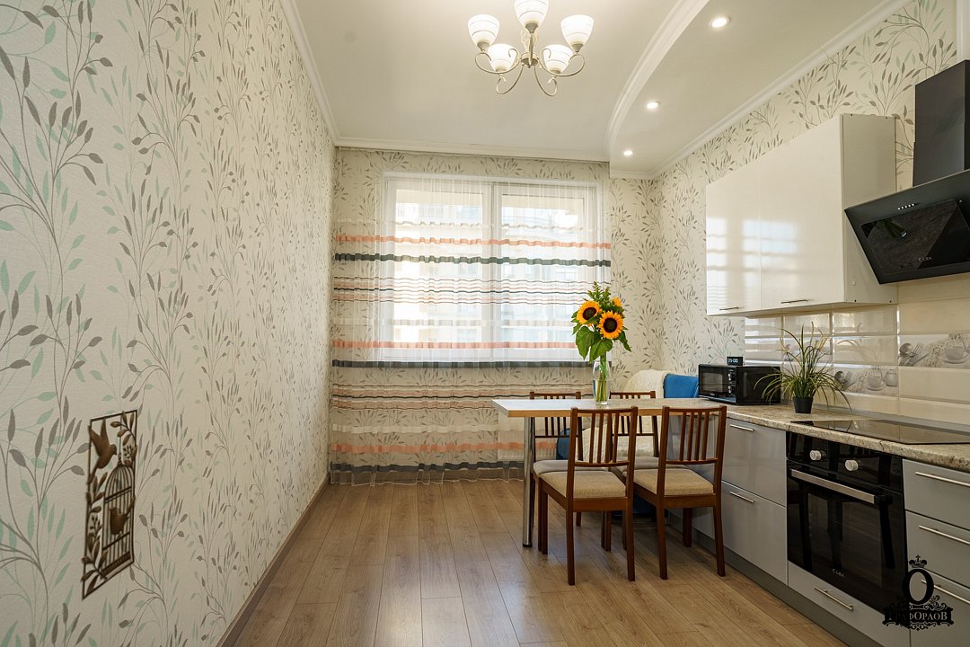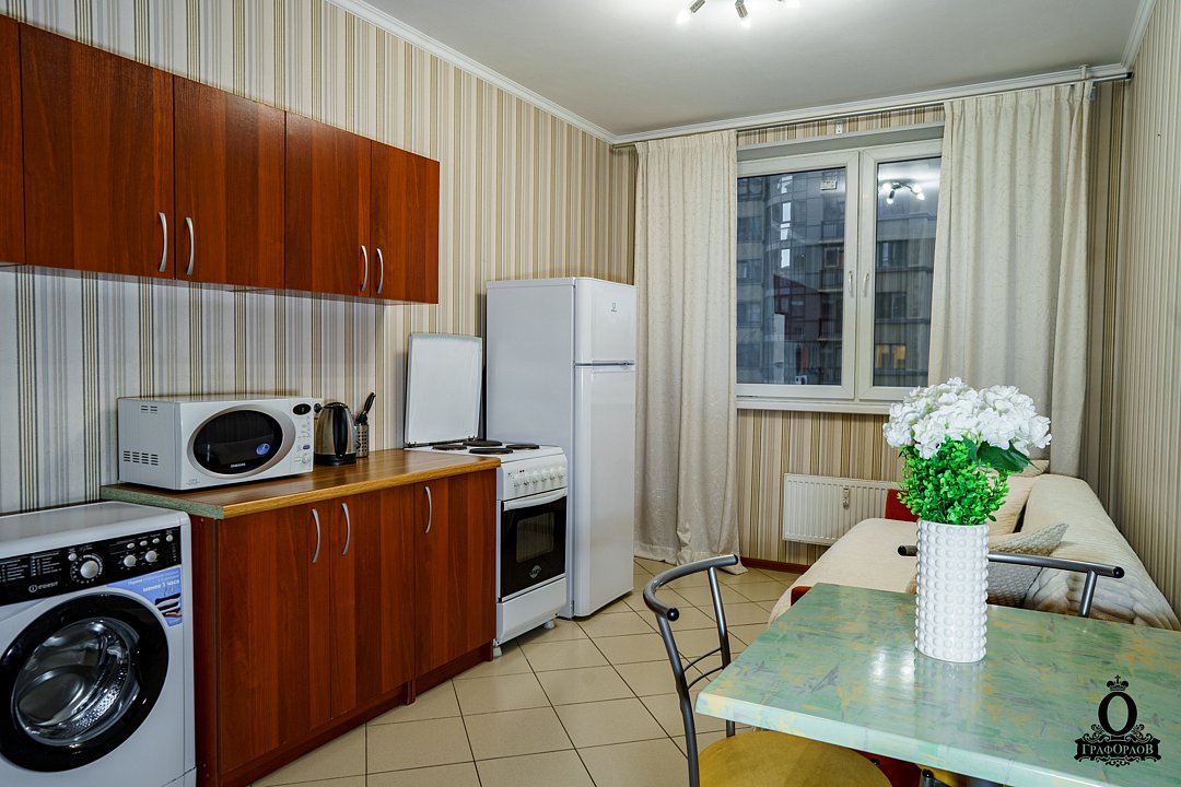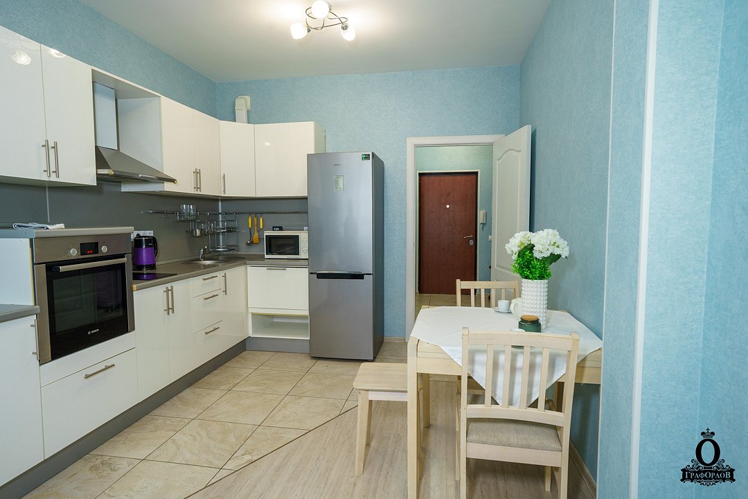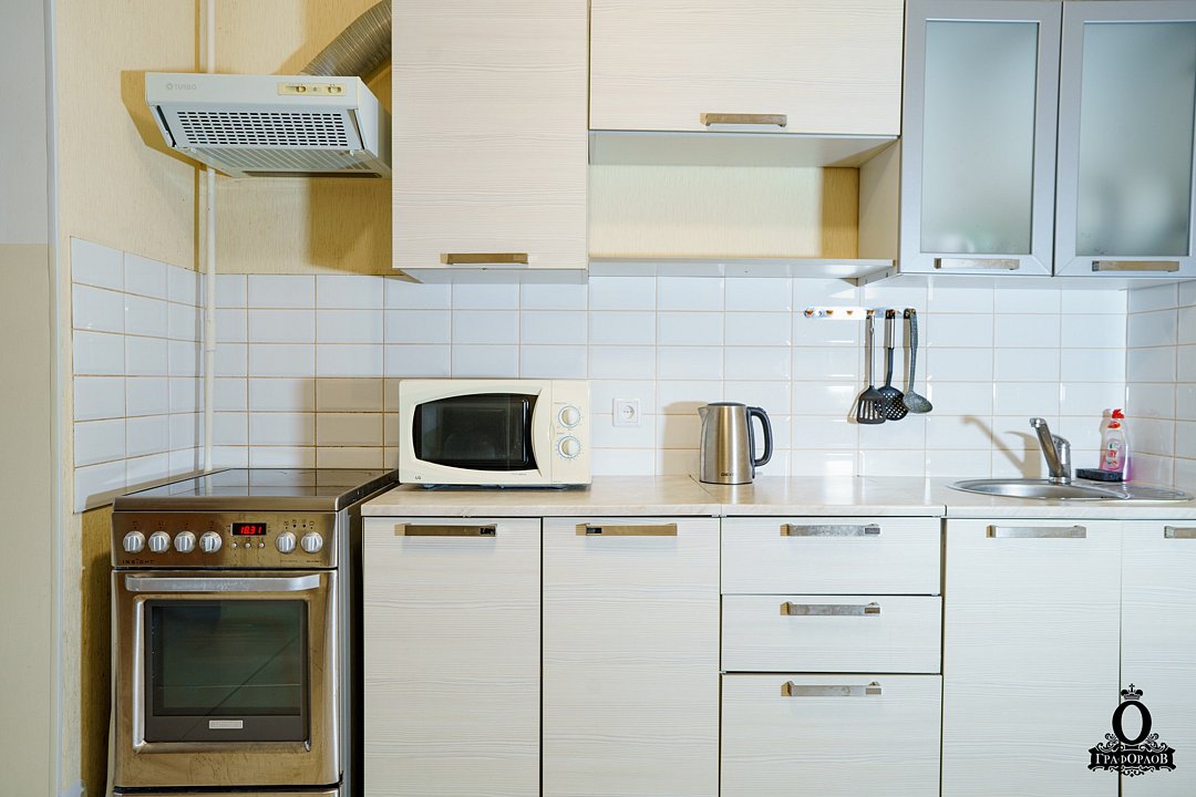 Полностью оборудованная кухня (холодильник, плита, микроволновка, электрочайник, посуда), стиральная машина, утюг, гладильная доска — все для комфортного проживания, телевизор и быстрый Wi-Fi.