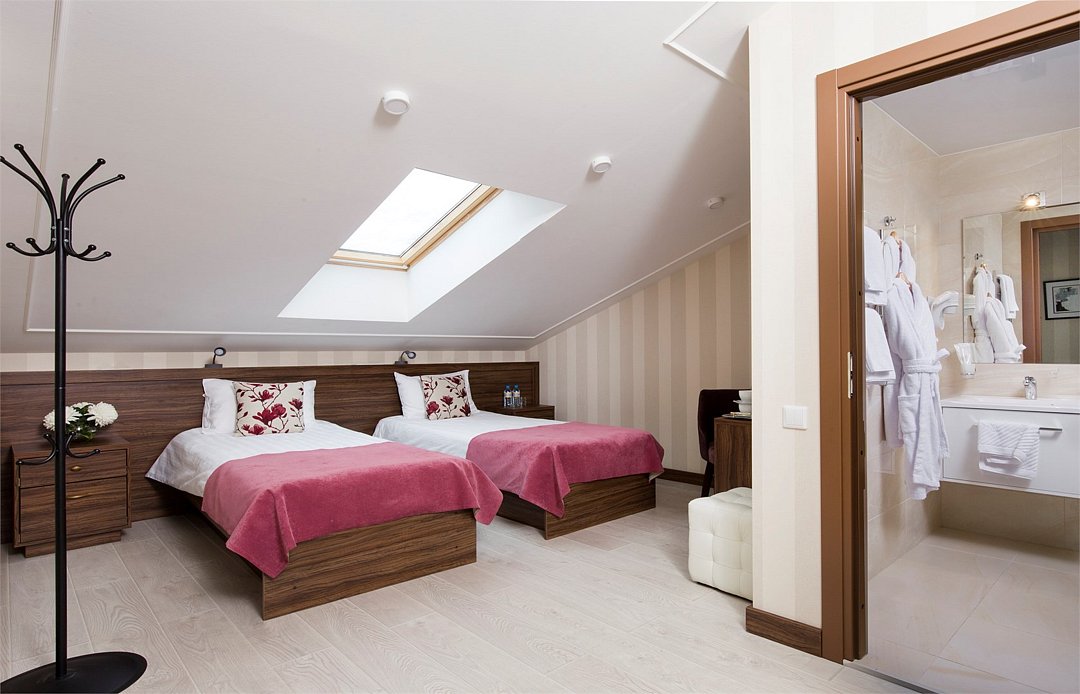 Wi-Fi, телефон, кондиционер, фен, электронные замки, ванная комната, душевая кабина, санузел, халаты, банные полотенца, тапочки, гигиенические средства, косметические средства, две односпальные или большая двуспальная кровать, шкаф для одежды, вешалки, багажная тумба, зеркало, сейф, чайник, раковина, отопление, душ, кулер на этаже, ламинат, стул, стол, туалетные средства, телевизор с плоским экраном, мини-холодильник, мансардные окна, номер для некурящих, чайная станция, фумигатор, уборка номера, услуги прачечной (платно), бутилированная вода, можно с питомцамиВ гостиничном номере
