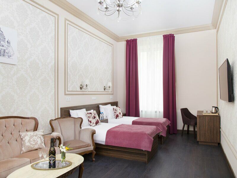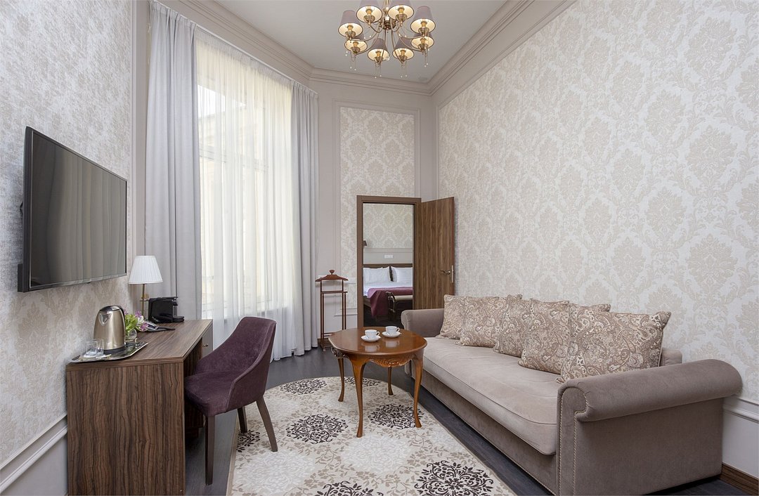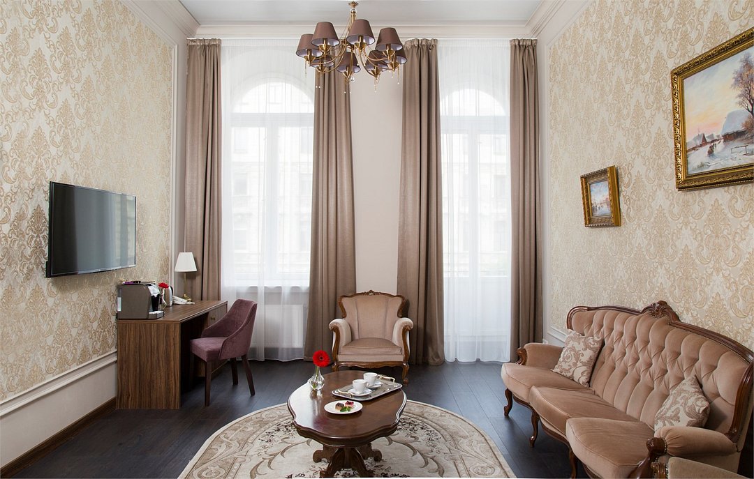 Гранд отель Чайковский, будучи расположенным в здании, которое является объектом культурного наследия регионального значения, передает атмосферу истинного Петербурга и сочетает её с современным дизайном и технологиями. Оформление 70 номеров 6 категорий, которые способны принять до 170 человек, выполнены в классическом современном стиле, интерьер радует глаз и создает атмосферу уюта и комфорта.