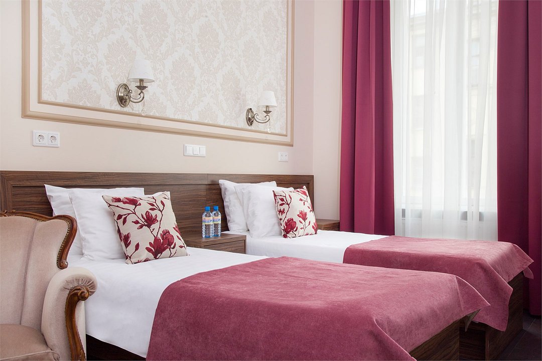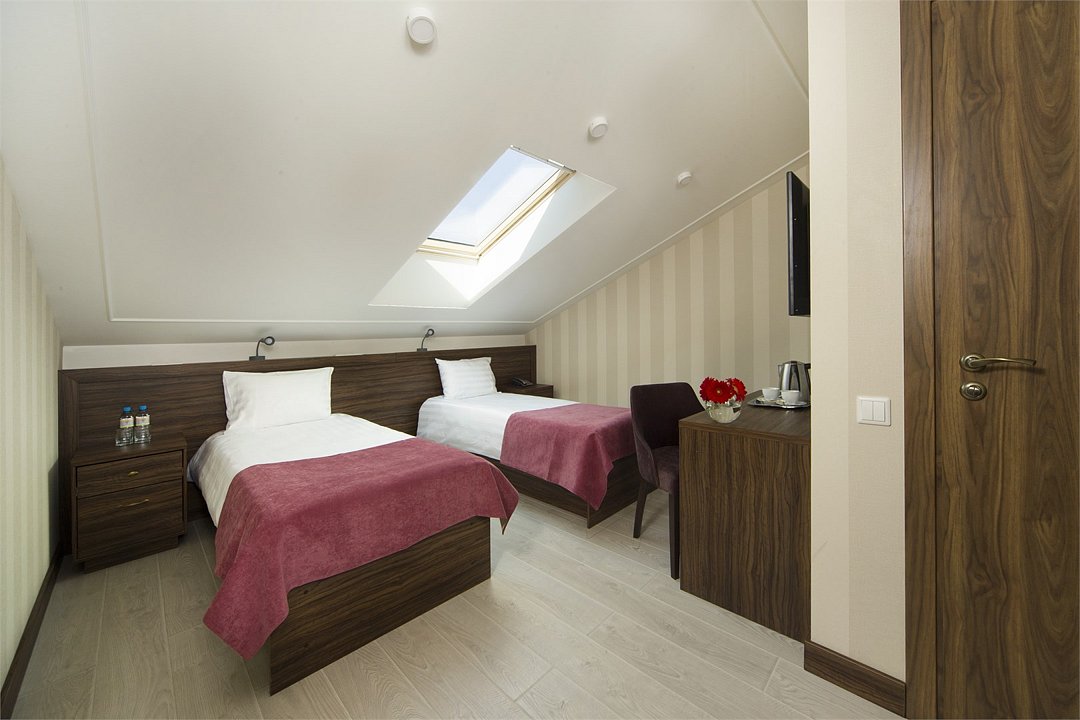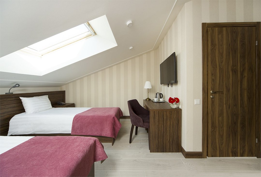 Номер данной категории располагается на верхнем этаже отеля и имеет мансардные окна. Он прекрасно подойдет для семейной поездки и прекрасно передают дух города и романтику Петербургских крыш. Санузел оборудован душем или душевой кабиной, в номере имеется все необходимое для комфортного пребывания.Услуги и удобства