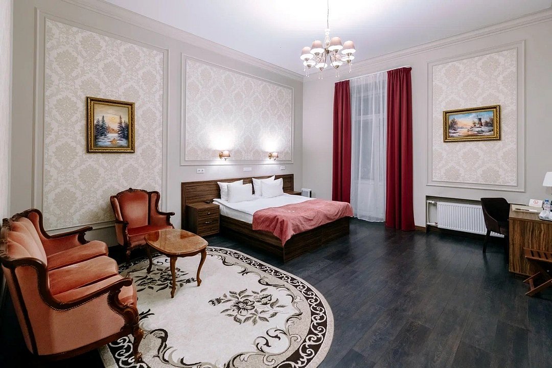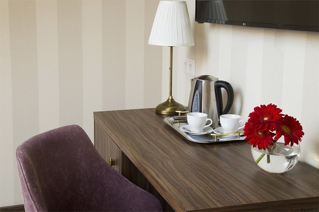 Wi-Fi, телефон, кондиционер, фен, ванная комната, санузел, халаты, банные полотенца, тапочки, гигиенические средства, косметические средства, две односпальные или большая двуспальная кровать, диван, тумбы, шкаф для одежды, вешалки, журнальный столик, письменный стол, багажная тумба, зеркало, сейф, чайник, раковина, косметическое зеркало, гостиная зона, отопление, душ, вид на город, кулер на этаже, кресло, вид во двор, ламинат, высокие потолки, стул, туалетные средства, телевизор с плоским экраном, мини-холодильник, номер для некурящих, чайная станция, фумигатор, уборка номера, услуги прачечной (платно), бутилированная вода, шапочка для душа, можно с питомцамиВ гостиничном номере