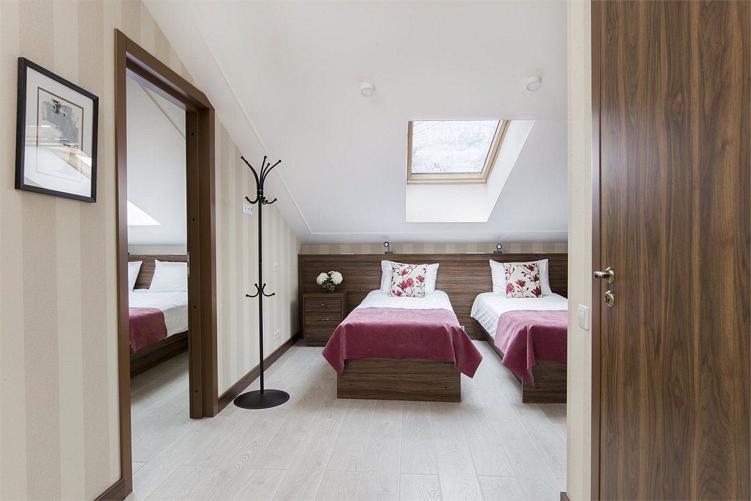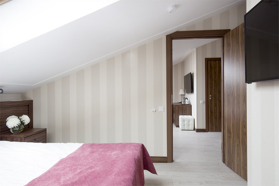 два телевизора, Wi-Fi, телефон, кондиционер, фен, электронные замки, ванная комната, душевая кабина, санузел, халаты, банные полотенца, тапочки, гигиенические средства, косметические средства, двуспальная кровать, две односпальные или большая двуспальная кровать, тумбы, шкаф для одежды, вешалки, письменный стол, багажная тумба, зеркало, две комнаты, сейф, чайник, раковина, косметическое зеркало, отопление, душ, кулер на этаже, кресло, две спальни, ламинат, туалетные средства, телевизор с плоским экраном, мини-холодильник, мансардные окна, чайная станция, фумигатор, межкомнатная дверь, уборка номера, услуги прачечной (платно), бутилированная вода, шапочка для душа, можно с питомцамиВ гостиничном номере