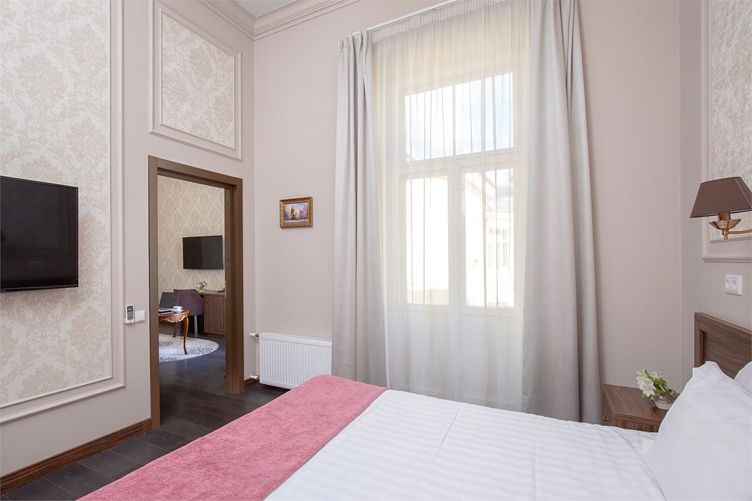 Номера с видом во двор - идеальный выбор для самых взыскательных гостей: номера, общей площадью до 46 кв.м, имеют не только две комнаты, но и отдельный санузел для каждой из них. Стильный, продуманный до мелочей, интерьер, просторная изысканная гостиная, роскошная ванная комната с ванной - здесь есть все, чтобы сделать Ваш отдых незабываемым.Услуги и удобства
