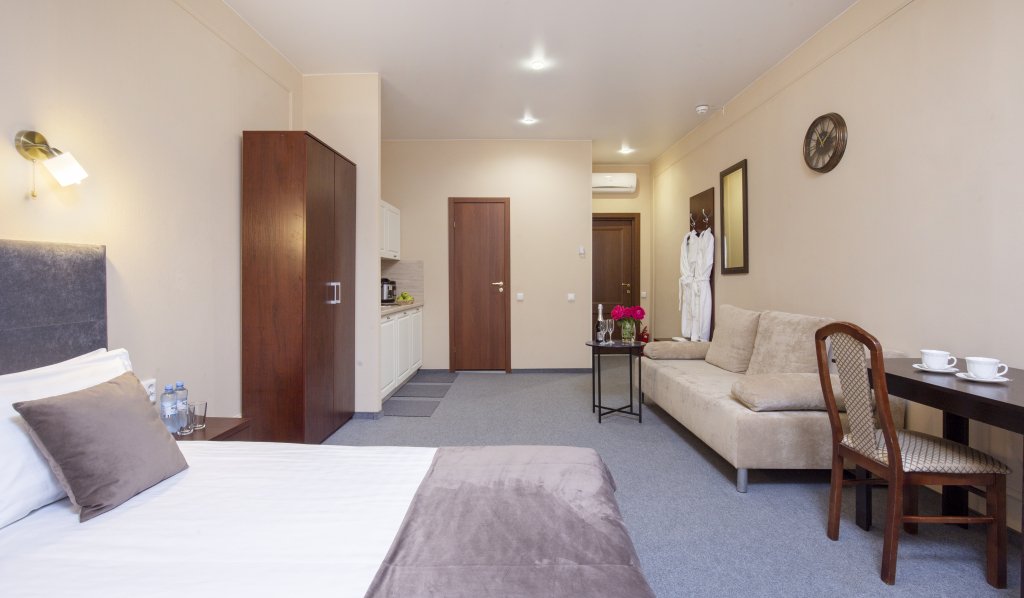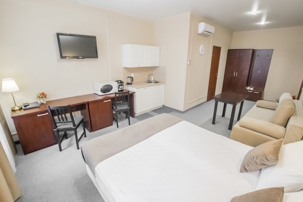 Чтобы вы могли отдохнуть после долгого дня, в номере есть телевизор и халат. Оснащение зависит от выбранной категории номера.