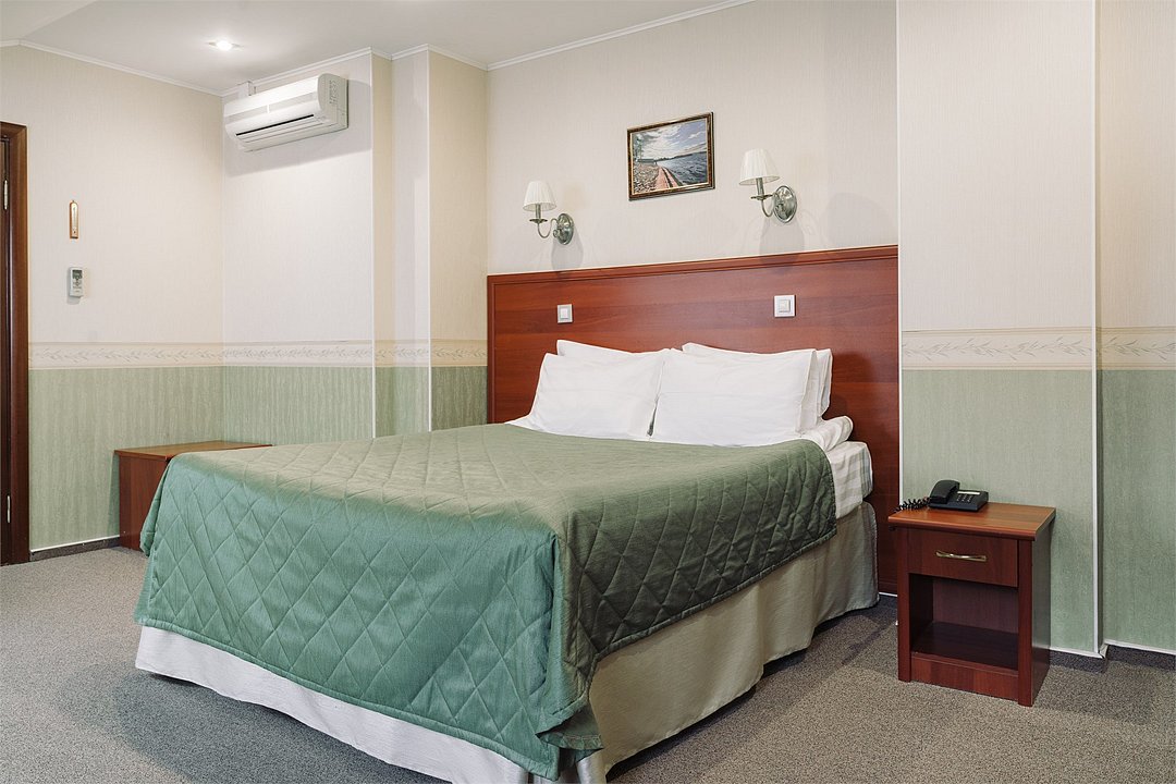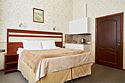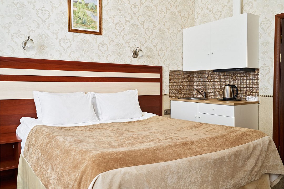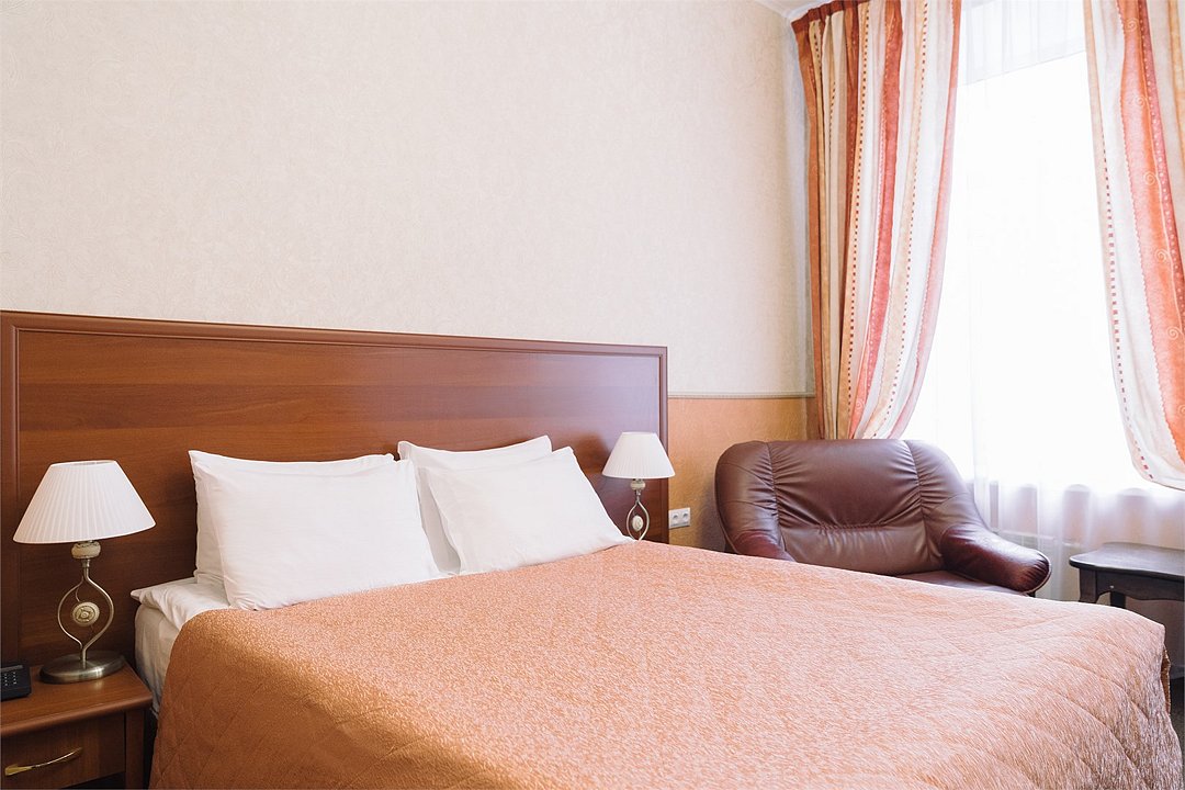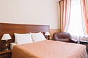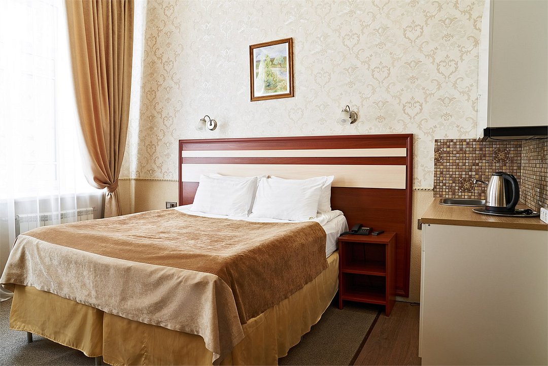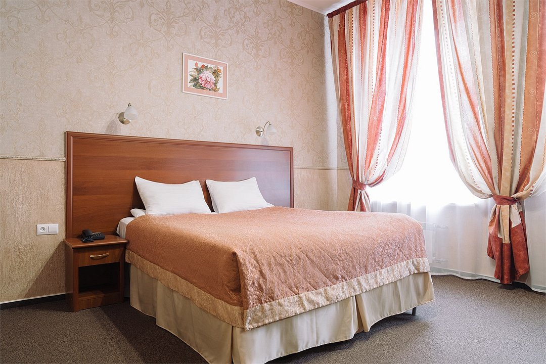 Просторный номер, подходящий для длительного пребывания. В номере одна большая двухспальная кровать. Окна номеров данной категории выходят на улицу Академика Лебедева и часовню Святого Николая Чудотворца.Услуги и удобства