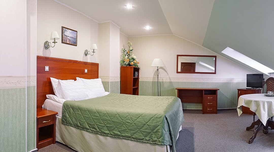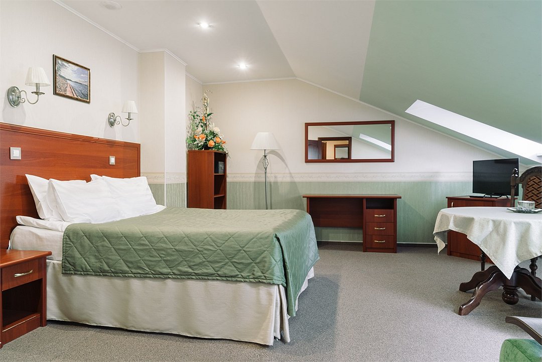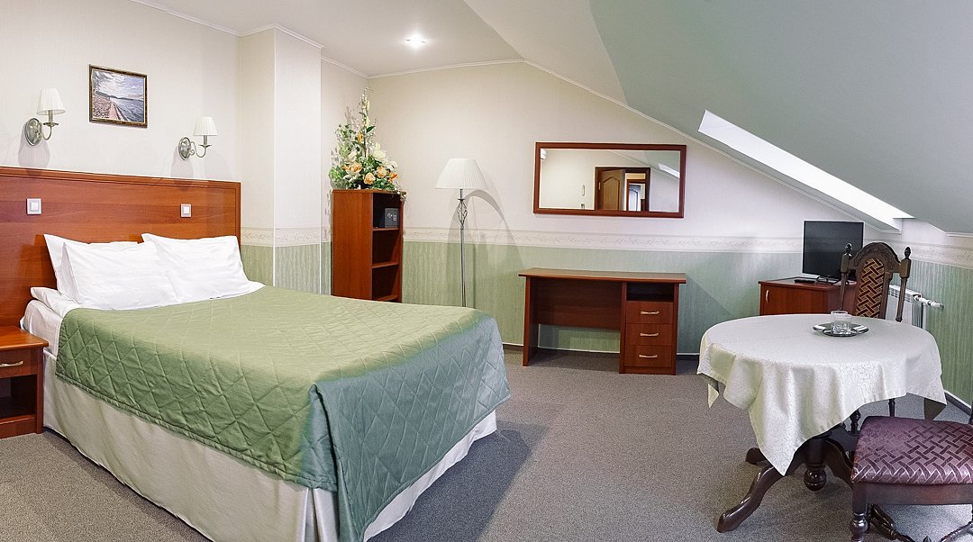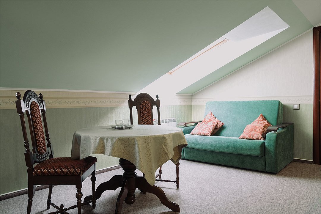 Мансардный люкс - это самый просторный и удобный номер, расположенный на третьем, мансардном этаже гостиницы. В номере одна широкая двуспальная кровать и раскладной диван.Услуги и удобства