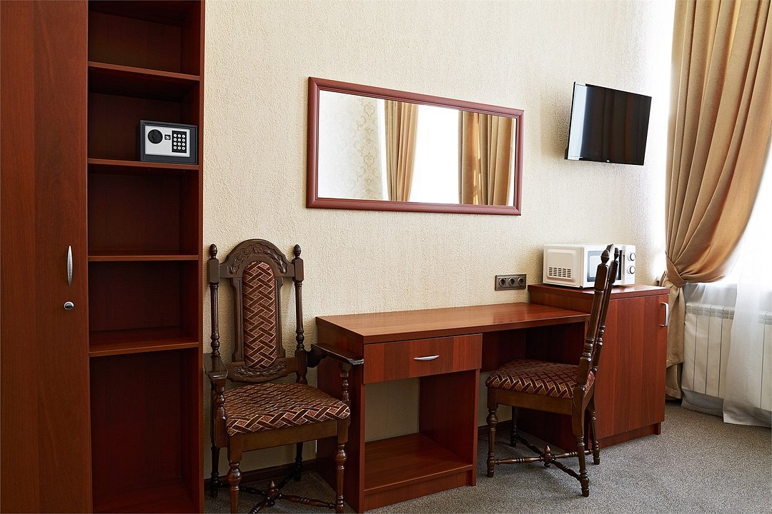 телевизор, Wi-Fi, телефон, светильник, фен, вентилятор, халаты, банные полотенца, тапочки, кровать «Queen size», ортопедический матрас, стулья, вешалки, письменный стол, зеркало, чайный набор, сейф, унитаз, вид на город, стаканы, тумба, мини-холодильник, номер для некурящих, холодильный шкаф, онлайн-регистрация до заезда, фумигатор, шапочка для душа, мыло, можно с питомцамиВ гостиничном номере