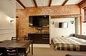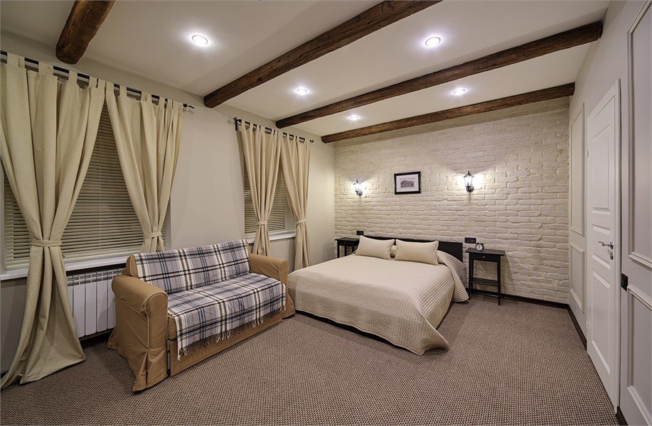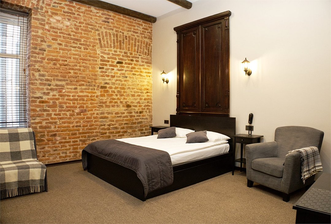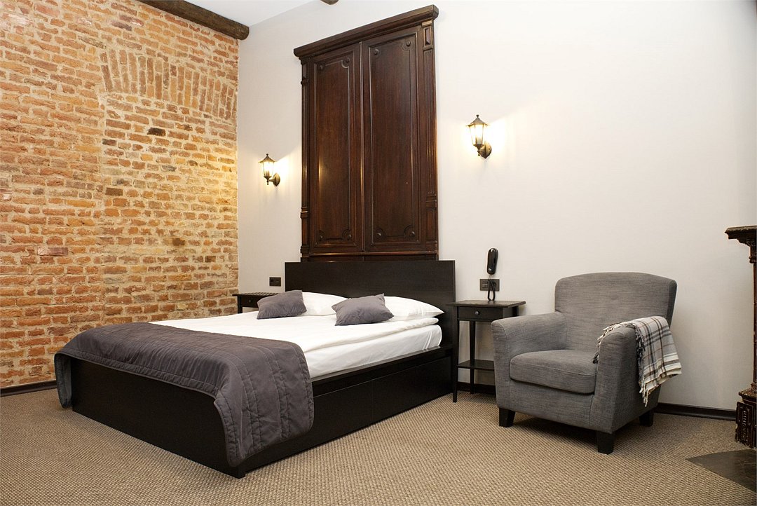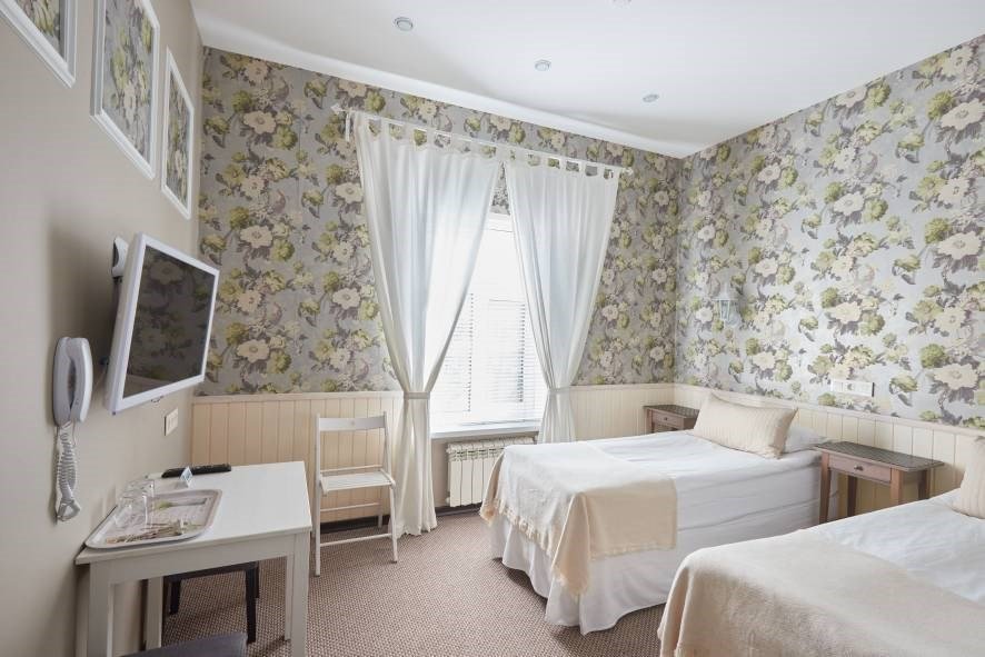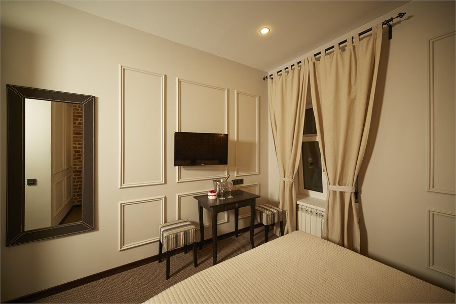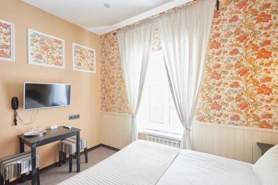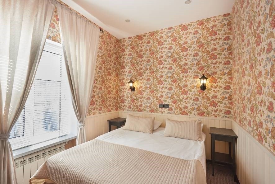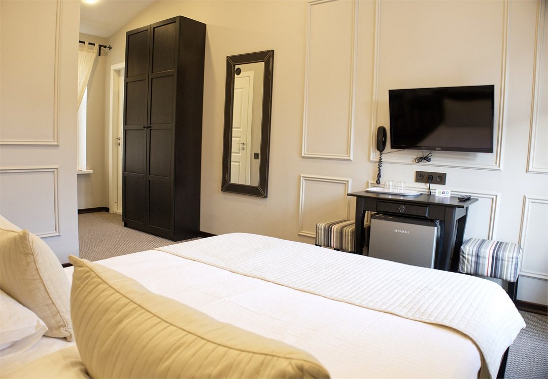 Просторный, около 22 метров, двусторонний светлый номер с ванной комнатой и видом на яблоневый сад или во двор. Имеется холодильник.Идеален для молодых пар и сборов невесты.Услуги и удобства
